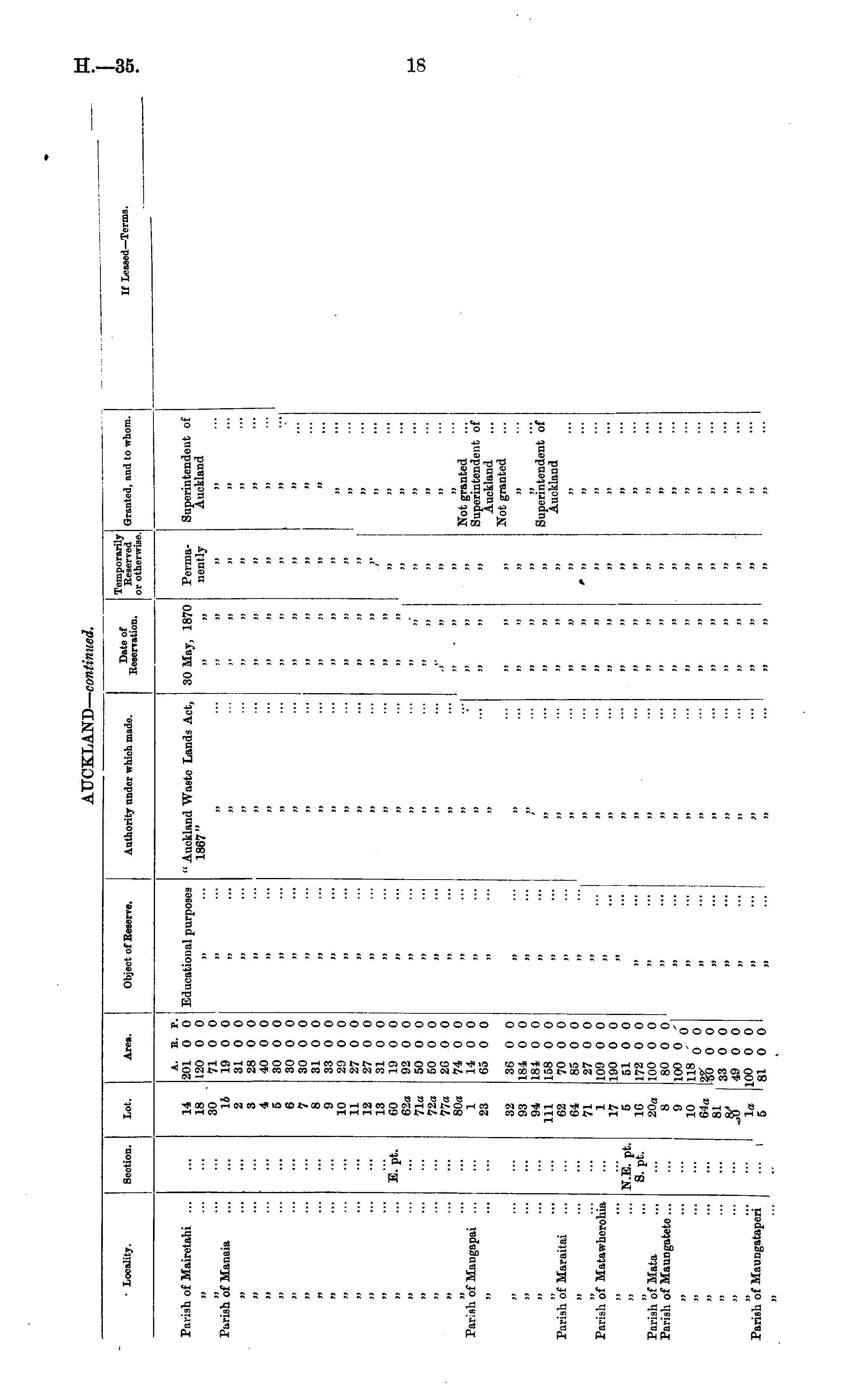 AUCKLAND— continued. ■ Locality. Section. Lot. Area, Object of Reserve. Authority under which made. Date of Reservation. Temporarily Reserved or otherwise. Granted, and to whom. If Leased— Terms. ... Parish of Mairetahi ... jj jj ■ • • Parish of Manaia » ••• » ••• jj jj j) " • jj ••• >j T} ..• 14 18 30 2 3 5 6 7 8 9 10 11 12 13 60 62a 71a 77a 80a 1 23 A. E. P. 201 0 0 120 0 0 71 0 0 19 0 0 31 0 0 28 0 0 40 0 0 30 0 0 30 0 0 30 0 0 31 0 0 33 0 0 29 0 0 27 0 0 27 0 0 31 0 0 19 0 0 92 0 0 50 0 0 50 0 0 2G 0 0 74 0 0 14 0 0 65 0 0 Educational purposes >» ii n -•• i) ••• » ?} ... j) )> •• • II n •« ■ " Auckland Waste Lands Act, 1867" J) ,, jj ... I) )) JJ ■•' }i JI JJ ... 30 May, 1870 >j j> ;j » )' )) )j » )) )» )) >) jj >» ti n )J JJ JJ 1J )> J> Permanently ji jj jj j) ii jj it ii Superintendent of Auckland ,, jj •• • j) ■ •• j, ... ,, ii "• u u jj ■■• j) ■■ • )j ... JJ J) jj „ JJ ••■ ... i) jj ... JJ JJ jj j, ... it ••• JJ • •« JJ JJ j* j, ... jj • ■< E. pt. ji ... jj n }> jj M •.. >j ••• jj ... >j ... jj jj i jj ,, ... jj j> ■ • * H f ' jj ,, u •• • jj JJ *i t t ... jj )t ••• .) JJ u j, ... H ■ >• }> ■•• J» )> • J> jj Not granted Superintendent of Auckland Not granted JJ • • • Parish of Mangapai ... ji .. • VI J> J) jj H " )> I) jj ... jj ••• )J ji 32 93 94 111 62 64 71 1 17 1G 20a 8 9 10 81 la 1 5 36 0 0 184 0 0 184 0 0 158 0 0 70 0 0 85 0 0 27 0 0 109 0 0 190 0 0 51 0 0 172 0 0 100 0 0 80 0 0 100 0 ' ,^ 8 o o io o o 33 0 0 49 0 0 LOO 0 0 81 0 0 jj JI )J " JJ 'J a j* sj ■• • j) ... JJ JJ u Superintendent of Auckland jj JJ JJ jj jj ••• Parish of Maraitai ,i ... II ' " JJ J) jj )J J.J jj jj ... » '" \ JJ JJ P jj n ... J! Parish of Matawherohia » jj JJ I ... )> " * a " »» '" JJ II )> j, ... jj ■•■ NJE.'pt. S. pt. » JJ JJ I jj it "• jj )1 ••• J» "* JJ JJ jj H jj •■• Parish of Mata Parish of Maungatete ... j, ... ... ! )} '" \ it "' JJ JJ 9) M )! j, ... )> ••• jj ••• )> "• JJ J» » |j ... j) ... j, JJ J> JJ jj ... JJ "'I )> '" \ J) » JJ >l jj ■ •• ... : it "' \ JJ J' JJ '"• >y ••• JJ JJ )) ... j> ••• JJ J> J) JI "• Parish of Maungataperi i JJ ... J» JJ J» || ... ... I it jj JJ