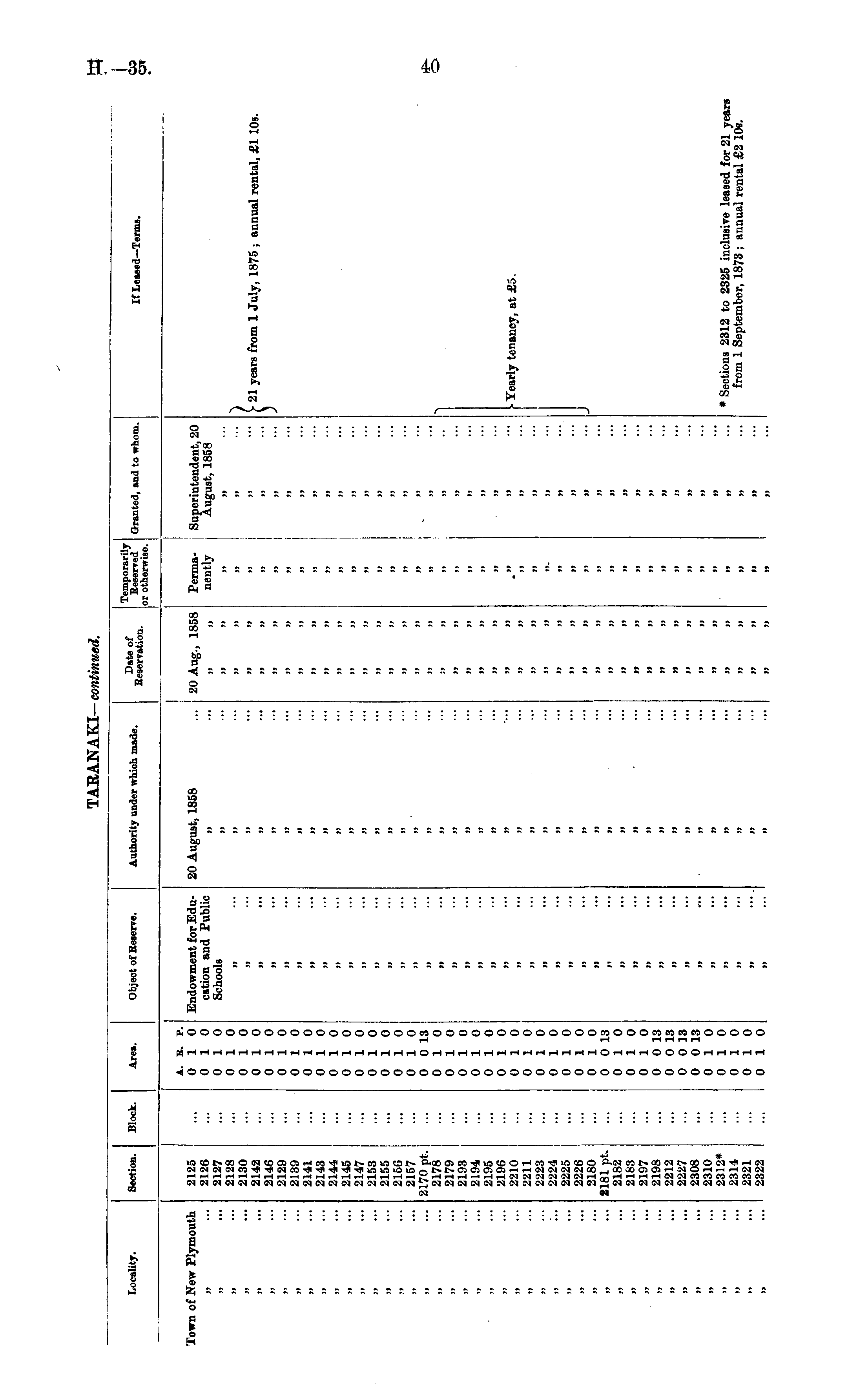 TARANAKI— continued. Locality. Section. Block. Area. Object of Reserve. Authority under which made. Date of Reservation. Temporarily Reserved or otherwise. Granted, and to whom. If Leased— Terms. Xown of New Plymouth 2125 2126 2127 2128 2130 2142 2146 2129 2139 2141 2143 2144 2145 2147 2153 2155 2156 2157 2170 pt. 2178 2179 2193 2194 2195 2196 2210 2211 2223 2224 2225 2226 2180 2181 pt. 2182 2183 2197 2198 2212 2227 2308 2310 2312* 2314 2321 2322 A. E. P. 0 10 0 10 0 10 0 10 0 10 0 10 0 10 0 10 0 10 0 10 0 10 0 10 0 10 0 10 0 10 0 10 0 10 0 10 0 0 13 0 10 0 10 0 10 0 10 0 10 0 10 0 10 0 10 0 10 0 10 0 10 0 10 0 10 0 0 13 0 10 0 10 0 10 0 0 13 0 0 13 0 0 13 0 0 13 0 10 0 10 0 10 0 10 0 10 Endowment for Education and Public Schools 20 August, 1858 20 Aug., 1858 Permanently Superintendent, 20 August, 1858 n ... » J) )» It ••• H >» H ij >i It ••• it • •• Jl JJ N ii > 21 years from 1 July, 1875 ; annual rental, £1 10s. it ... H it Jj jj ji ••■ II ••• tt ••• »J JI jj ji n II '■• n ■•• I it JJ ji u n ••• H J» j> ii »i • • • II »i '" » JJ M ii j» • • • I> ••• >i "' M it JJ ii ij *•• II ••• n '" )» u M ji jj II ••• t) '" \ M )) >» ii j, ... II ... II J» jj jj II M JJ jj >! ji »> ■•• N it jj >i ••■ II ••• II M )j jj 11 .'» ■•• n ••• n ... n ... t» ... i> ... II •• • II ■ • • II '" »» '" Jl " ' 11 ••" 11 '" \ II " * II H H H Jl H »» )) H jj n jj jj jj j> j» ;j jj jj ji jj jj jj i) ji ji ii ii JJ Jl JJ Jl JJ II ii ••• jj • •• ji ip M » j» ■ ■ * ji -Yearly tenancy, at £5. »» j) ij ii ii i> II ji ti it JJ ii II ••• M it it » II "• J» JJ jj Jl ji ••• ji JJ ji IJ ii ii ... IJ • • • )j JJ jj J) ii ■ •• »» ... II ••• N JJ ii 11 jj n • ■• II •>• l) tt ji Jl »j ••■ n ... II •»• j) ii it u • '• * Sections 2312 to 2325 inclusive leased for 21 year* from 1 September, 1873 ; annual rental £2 10s. u ... II •" ji » it ii • ■ • n ■•• II ••• it »> ji Jl II ••■ H »» jj JJ jj n ••• II ... jj » jj II ji ••• » H| II •■• jj H jj Jl ii -•• II ... II •■• • j) a ij II jj ••• l» ... II »•« M » » H ji ■ »• I| ... II ••• ji jj jj ii ii ... || ... II '" 7) ji jj JJ ji ••• n •*• II ••• . JJ J» it ii ii ... » ... ... l M tt jj ii >i