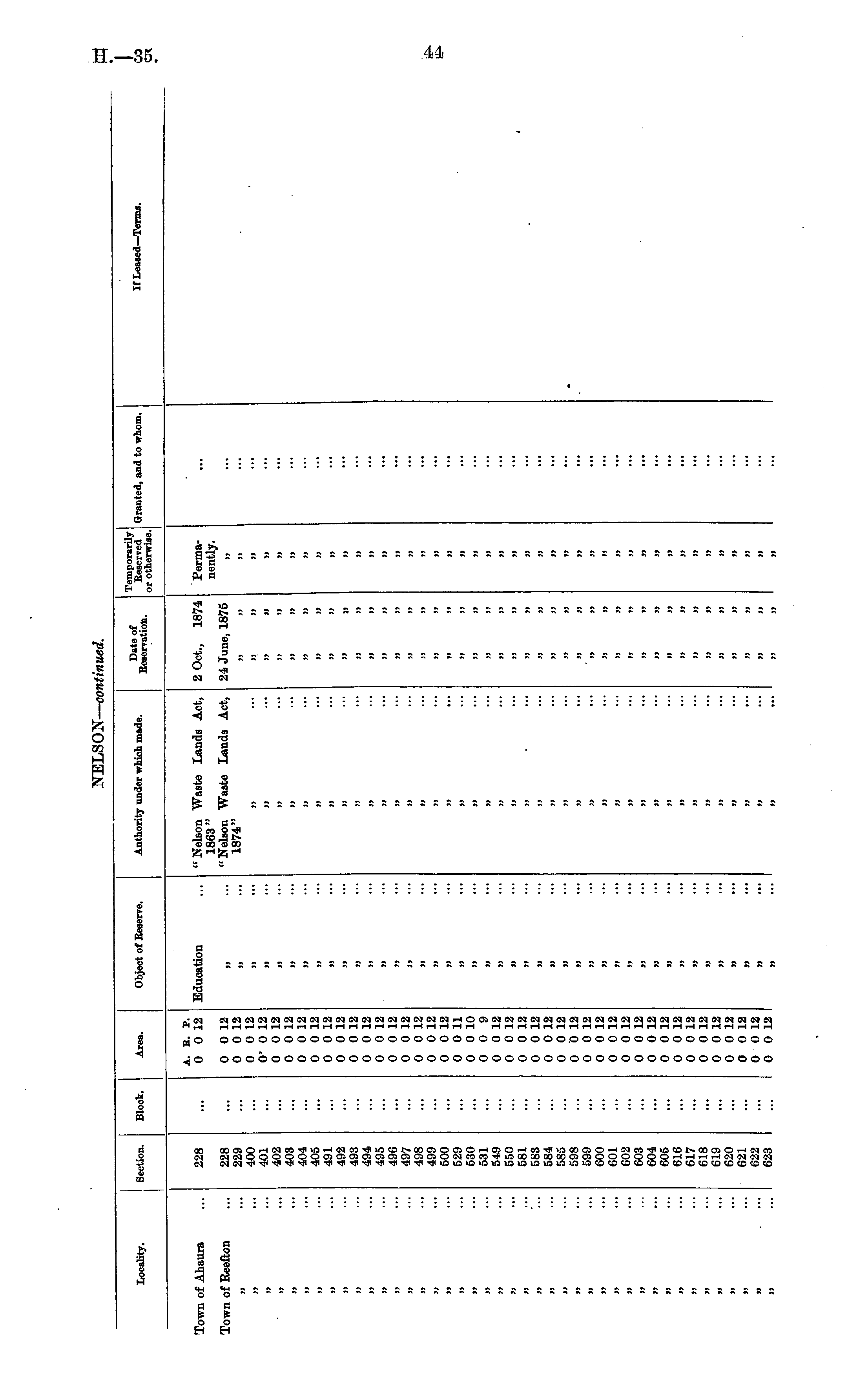NELSON — continued. Locality. Section. Block. Area. Object of Reserve. Authority under which made. Date of Eeservation. Temporarily Reserved Granted, and to whom, or otherwise. If Leased— Terms. Town of Ahaura 228 A. K. P. 0 0 12 Education " Nelson Waste Lands Act, 1863 " " Nelson Waste Lauda Act, 1874" 2 Oct., 1874 Permanently. Town of Keefton u a j» M it a II )> )> a H j) j) H )) 3) » JJ j) 228 229 400 401 402 403 404 405 491 492 493 494 495 496 497 498 499 500 529 530 531 549 550 581 583 584 585 598 599 600 601 602 603 604 605 616 617 618 619 620 621 622 623 0 0 12 0 0 12 0 0 12 0' 0 12 0 0 12 0 0 12 0 0 12 0 0 12 0 0 12 0 0 12 0 0 12 0 0 12 0 0 12 0 0 12 0 0 12 0 0 12 0 0 12 0 0 12 0 0 11 0 0 10 0 0 9 0 0 12 0 0 12 0 0 12 0 0 12 0 0 12 0 0 12 0 0 12 0 0 12 0 0 12 0 0 12 0 0 12 0 0 12 0 0 12 0 0 12 0 0 12 0 0 12 0 0 12 0 0 12 0 0 12 0 0 12 0 0 12 0 0 12 ii i> a a » M j) M it a S3 S3 ss »> a a Si S3 n M )) jj t) ■•• j, ■■■ jj . •• i) ■•• ») • •• si . .• ,, a • •> a jj ■•« j> ... u ... 9) ••• it ••■ J) •#• 3» ... ») ... )) ... 24 Juno, 1875 a )» )) i> n » a >) II a a a it S3 » » » J> n i) )S Si S3 it » !1 J) It n m n ii t» tt tt )» M J' » t» )> j» a ii »> ii » jj i] n H n jj >j ij n 3J 9) • IS )> )J ... »> I) u }; J) || ... j) If »9 n )» • ■•■ >J )i n 3J )» ... » » jj »j n »» ... *» j) 99 U » It t. . )> a 99 j) Si ,) >3 )> 99 » 3> )j ... 99 || JJ ft » » 99 M JJ II •■• )J ?) 99 M »» jj »J tt 99 M )J II ••■ J) »J 9> J) )> „ n j» H n n )) ... !> )) 99 n n 9) ... J) J» 39 j) )j >> ••• JJ )) 99 j) ?> )> ... >J )J J» M M j) ... 3J >> 99 j) J) )j ... » )) 99 j) 3) It ... )) i3 99 is J) tl •<< st is 39 ») Si It •«• » » 3>