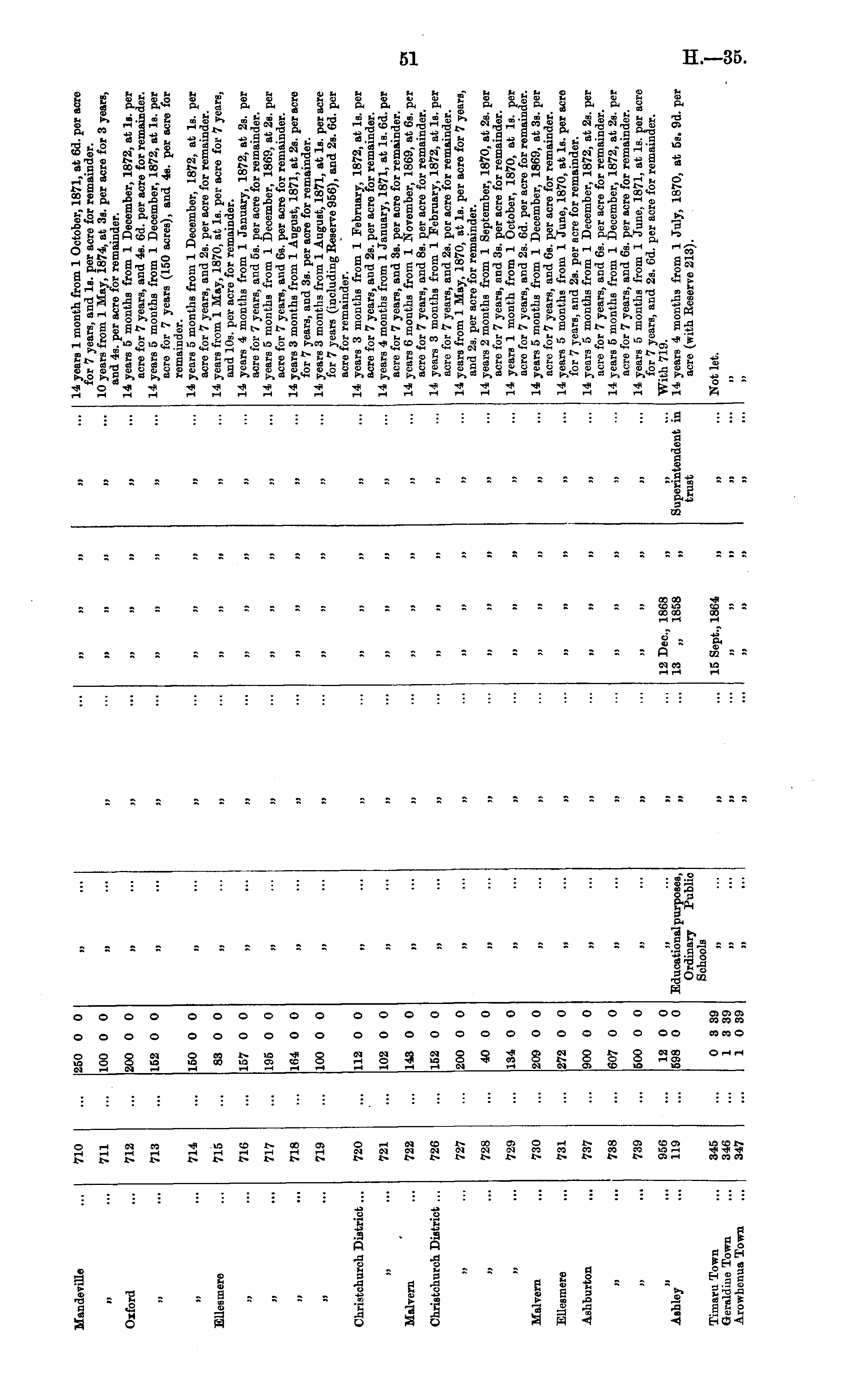 Mandeville 710 250 0 0 ), ... jj jj ft JJ ... 14 years 1 month from 1 October, 1871, at 6d. per acre for 7 years, and Is. per acre for remainder. 10 years from 1 May, 1874, at 3s. per acre for 3 years, and 4s. per acre for remainder. 14 years 5 months from 1 December, 1872, at Is. per acre for 7 years, and 4s. 6d. per acre for remainder. 14 years 5 months from 1 December, 1872, at Is. per acre for 7 years (150 acres), and 4s. per acre for remainder. 14 years 5 months from 1 December, 1872, at Is. per acre for 7 years, and 2s. per acre for remainder. 14 years from 1 May, 1870, at Is. per acre for 7 years, and 10s. per acre for remainder. 14 years 4 months from 1 January, 1872, at 2s. per acre for 7 years, and 5s. per acre for remainder. 14 years 5 months from 1 December, 1869, at 2s. per acre for 7 years, and 6s. per acre for remainder. 14 years 3 months from 1 August, 1871, at 2s. per acre for 7 years, and 3s. per aore for remainder. 14 years 3 months from 1 August, 1871, at Is. per acre for 7 years (including Reserve 956), and 2s. 6d. per acre for remainder. 14 years 3 months from 1 February, 1872, at Is. per acre for 7 years, and 2s. per acre for remainder. 14 years 4 months from 1 January, 1871, at Is. 6d. per acre for 7 years, and 3s. per acre for remainder. 14 years 6 months from 1 November, 1869, at 6s. per acre for 7 years, and 8s. per acre for remainder. 14 years 3 months from 1 February, 1872, at Is. per acre for 7 years, and 2s. per acre for remainder. 14 years from 1 May, 1870, at Is. per acre for 7 years, and 2s. per acre for remainder. 14 years 2 months from 1 September, 1870, at 2s. per acre for 7 years, and 3s. per acre for remainder. 14 years 1 month from 1 October, 1870, at Is. per acre for 7 years, and 2s. 6d. per acre for remainder. 14 years 5 months from 1 December, 1869, at 3s. per acre for 7 years, and 6s. per acre for remainder. 14 years 5 months from 1 Juno, 1870, at Is. per acre for 7 years, and 2s. per acre for remainder. 14 years 5 months from 1 December, 1872, at 2s. per acre for 7 years, and 6s. per acre for remainder. 14 years 5 months from 1 December, 1872, at 2s. per acre for 7 years, and 6s. per acre for remainder. 14 years 5 months from 1 June, 1871, at Is. per acre for 7 years, and 2s. Gd. per acre for remainder. With 719. 14 years 4 months from 1 July, 1870, at 5e. 9d. per acre (with Eeserre 213). i> ••• 711 100 0 0 JJ ... jj JJ » ji j, ... Oxford 712 200 0 0 J, ... n m n jj JJ IX )> ••• 713 152 0 0 jj ••• a >> » j» )J ... » "• 714 150 0 0 jj ••• jj >> ») j> ,} ... Ellesmere 715 83 0 0 jj jj jj » M J) ... )> ■•• 716 157 0 0 JJ ••• )J jj JJ jj J) .. I it ••• 717 195 0 0 jj H N n JJ ••■ it ... 718 164 0 0 it ... jj II J» JJ JJ ■•■ » 719 100 0 0 >t ... jj JJ M JJ JJ " ■ Christchurch District... 720 112 0 0 f) ... n j) jj JJ ... a ••• 721 102 0 0 jj ... M JI H jj JJ Malyern 722 143 0 0 ,, ... JJ J» )J JJ ... Christchurch District ... 726 152 0 0 jj ■•■ M )J JJ H I) ••■ it 727 200 0 0 j, ... M JJ JJ }) II ... a ... 728 40 0 0 j> •• • If jj is H J) ••• » ... 729 134 0 0 jj ... M »j jj ■ )J ••• Malyern 730 209 0 0 Jj j) » »j jj JJ •■• Ellesmere ,,, 731 272 0 0 )» ••■ J> » JJ H »» ••• Ashburton 737 900 0 0 jj ... n M '» U JJ " • a »•• 738 607 0 0 ji ... j» »j jj M JJ I) Ml 739 500 0 0 jj ... i) jf jj jj JJ •" • Ashley 956 119 12 0 0 598 0 0 jj • •• Educational purposes, Ordinary Public Schools M 12 Dec, 1868 13 „ 1858 M »J *'• Superintendent in trust l) Timaru Town Geraldine Town Arowhenua Town ... 345 346 347 0 3 39 1 3 39 1 0 39 n if 15 Sept., 1864 n j, ... Not let. j> ••• H »J N H jj ... n » •■• jj •••