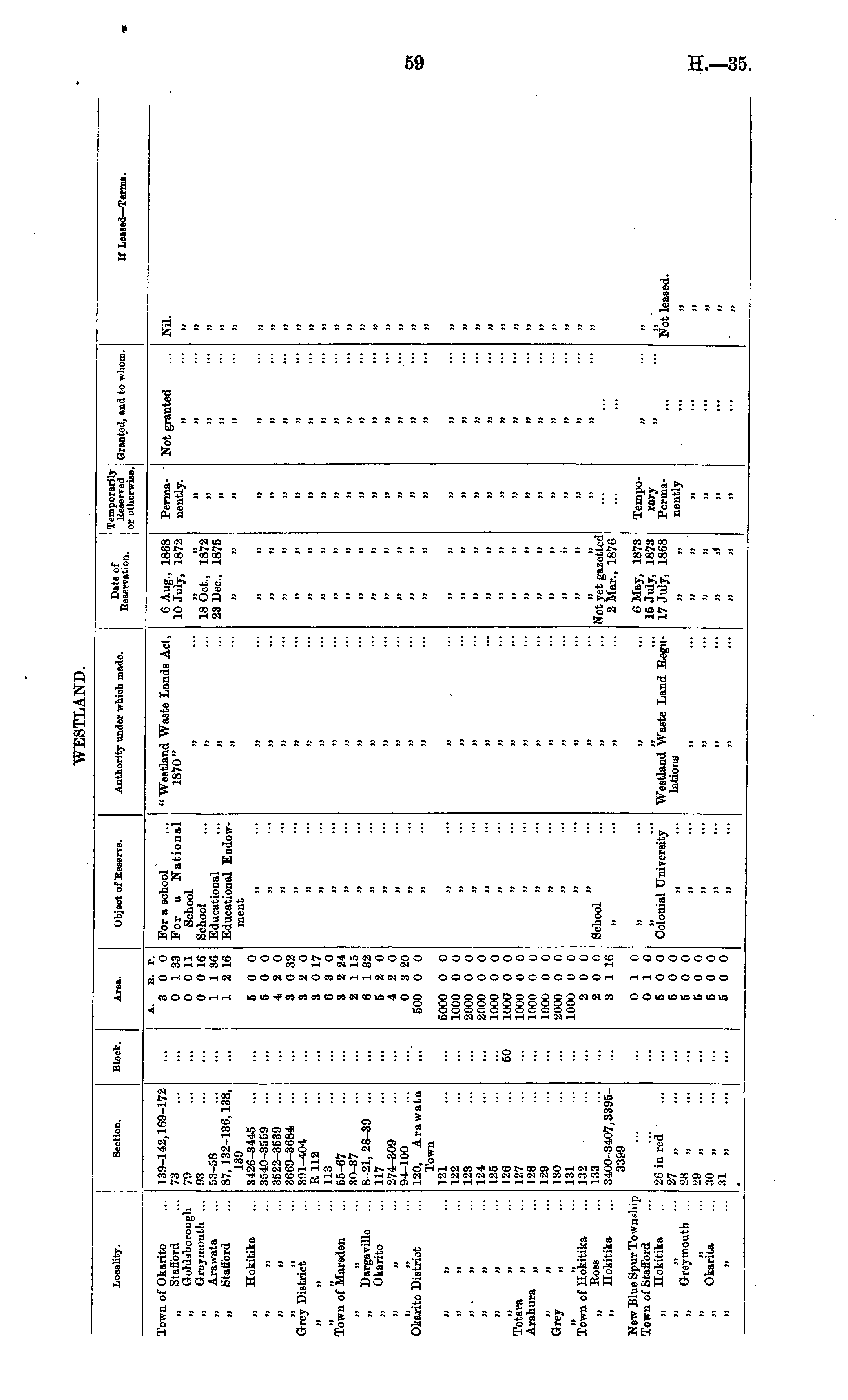 Locality. Section. Block. Area. Object of Reserve. Authority under which made. | Date of Reservation. Temporarily Beserved or otherwise.' Granted, and to whom. If LeaBed— Terms. Town of Okarito Stafford „ G-oldsborough j, Grey mouth ... ,, Arawata „ Stafford 139-142,109-172 73 79 93 53-58 87, 132-136,138, 139 3426-3445 3540-3559 3522-3539 3669-3684 391-404 K 112 113 55-67 30-37 8-21,28-39 ... 117 274-309 91-100 120, Arawata Town 121 122 123 124 125 126 127 128 129 130 131 132 133 3400-3407,3395-3399 A. B. P. 3 0 0 0 1 33 0 0 11 0 0 16 1 1 36 1 2 16 For a school For a National School School Educational Educational Endowment " Westland Waste Lands Act, 1870" )> ... 6 Aug., 1868 10 July, 1872 18 Oct., 1872 23 Dec, 1875 Permanently. N Not granted jj 91 NU. 99 91 n n 11 JJ a it I) 11 i) a H ji n „ Hokitika jj jj 99 91 Grey District a u Town of Marsden 5 0 0 5 0 0 4 2 0 3 0 32 3 2 0 3 0 17 6 3 0 3 2 24 2 1 15 6 1 32 5 2 0 4 2 0 0 3 20 500 0 0 ,, ... ,, a • •• ,, ■•■ ,, ... ,, ... j, ... JJ JJ •• • N ••' jj 91 ... 99 JJ 99 9) i> ft a t) >> 9) II M 91 M it )t n n 9) M jj n J) 91 M 91 H 19 11 99 91 |l JJ 91 19 jj ■•• 9J a h tt it „ Dargavillo „ Okarito ,, ... )> ••• a 99 jj !» 99 i) '" 11 >t n jj 91 99 ,, ... )» ... >f a 91 It 91 99 JJ j, ... }) ... 79 J) >» 11 II 19 JJ Okarito District )i • •• j) 99 it JJ It 11 it "• JJ ••• it it )J 11 JI 19 9# ••• J» 91 It • JI 99 19 19 99 91 || Totara „ Arahura „ 50 5000 0 0 1000 0 0 2000 0 0 2000 0 0 1000 0 0 1000 0 0 1000 0 0 1000 0 0 1000 0 0 2000 0 0 1000 0 0 2 0 0 2 0 0 3 1 16 ,, ... i) ... )» ■• ■ j, ... ,, ••• ,, ••. )) , •• • H J9 • •• jj ... jj ... jj ... >j ... it it It >i 9) 99 it 99 a tt it a 9) JJ 9) JJ JJ J) J] it n 91 11 )] 19 91 91 M II 11 t> It M 91 91 j, ... jj ... tt 99 >> a >J it tt '•• Grey „ j, ... jj ... it ti J> J9 a li JJ ji ... II ••• »j 19 it Town of Hokitika „ Koss ,, Hokitika It ... ,, ... School it ... )> "• 9) 9) tt It Not yet gazetted 2 Mar., 1876 >> a 1J 11 It it jj ••• n >•• New Blue Spur Town.-liip Town of Stafford „ Hokitika it tt „ Grey mouth ... 26 in red 27 „ 28 „ 29 „ 30 „ 31 0 10 0 10 5 0 0 5 0 0 5 0 0 5 0 0 5 0 0 5 0 0 JJ ..i 9J •■• Colonial University )t ... jj ... Westland Waste Land Regulations 6 May, 1873 15 July, 1873 17 July, 1868 It 9> Temporary Permanently it it 91 Not leased. tt jj ... jj ... N it tl >t >t „ Okarila a ... j> ... it it j> 11 jj it. a ••• jj >» j» ti » ... h ... 11 it » }3