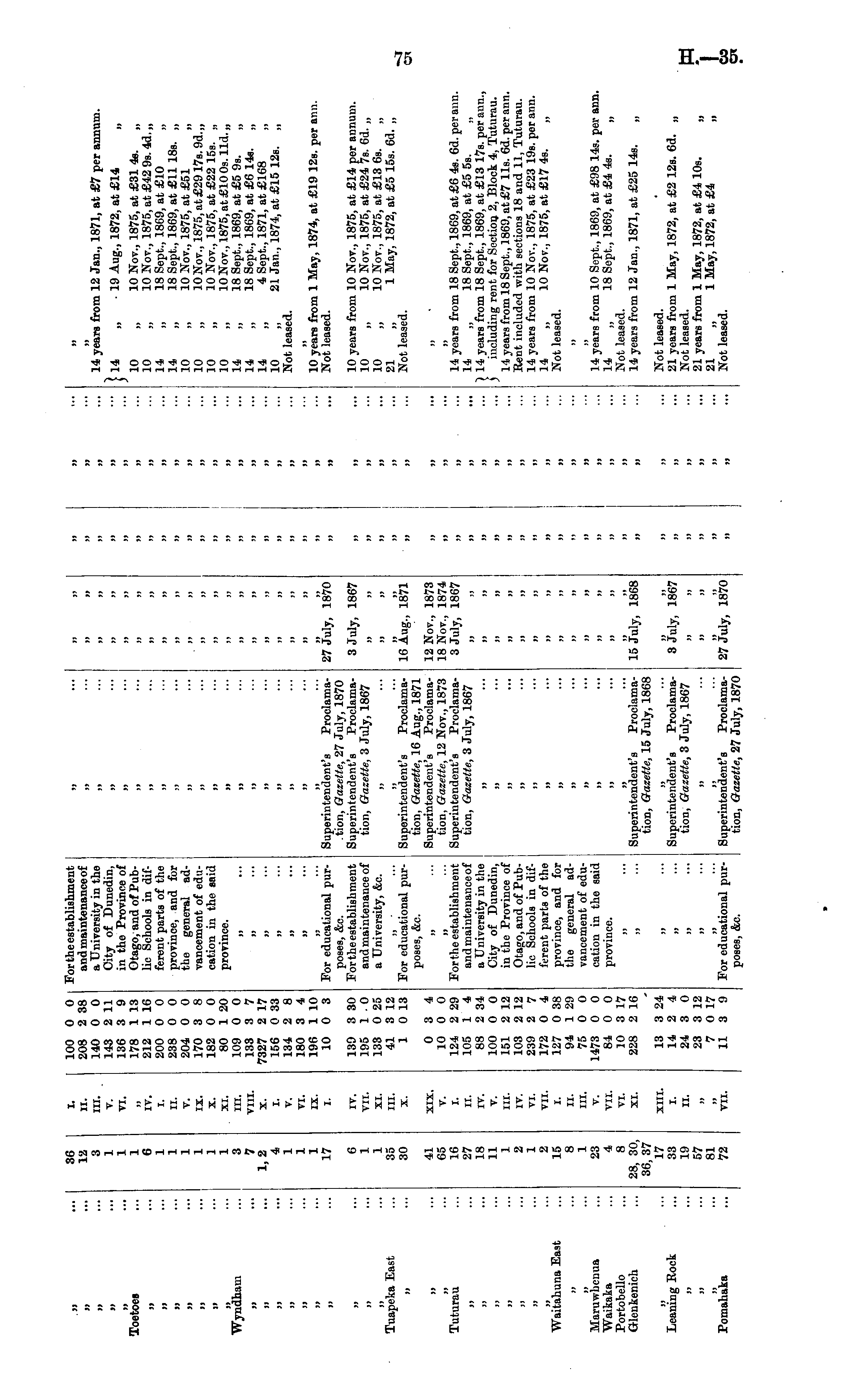jj jj jj jj jj Toetoes jj 36 12 3 1 1 1 6 1 1 1 1 1 1 3 7 1,2 4 1 1 1 17 I. ii. in. v. TI. jj IV. I. II. V. IX. X. XI. III. VIII. X. 100 0 0 208 2 38 140 0 0 143 2 11 130 3 9 178 1 13 212 1 16 200 0 0 238 0 0 204 0 0 170 3 8 182 0 0 80 1 20 109 0 0 133 3 7 7327 2 17 156 0 33 134 2 8 180 3 4 196 1 10 10 0 3 For the establishment and maintenance of a University in the City of Dunedin, in the Province of Otago, and of Publie Schools in different parts of the province, and for the general advancement of education in the snid province. it ••■ JJ • • • ,, ,, ... ,, ... ,, ... ,, n is >j it »J 33 3J >3 fl J) n j) jj >i M ii n H M I) jj }} M H n ti it it jj jj 14 years from 12 Jan., 1871, at £7 per annum. | 14 „ 19 Aug., 1872, at £14 10 „ 10 Nov., 1875, at £31 4s. „ 10 „ 10 Nov., 1875, at £42 9s. 4d. „ 14 „ 18 Sept., 1869, at £10 „ 14 „ 18 Sept., 1869, at £11 18s. „ 10 „ 10 Nov., 1875, at £51 10 „ 10 Nov., 1875, at £29 17s. 9d.,, 10 „ 10 Nov., 1875, at £22 15s. „ 10 „ 10Nov., 1875, at£10 Os. lid.,, 14 „ 18 Sept., 1869, at £5 9s. 14 „ 18 Sept., 18G9, at £6 14s. „ 14 „ 4 Sept., 1871, at £168 „ 10 „ 21 Jan., 187-1, at £15 12s. „ Not leased. jj 1J n >> >» ti n j> if it tt ii >» || it jj ,, >) jj II a jj ,, »> >> 1) II Wyndham M )> jj M jj it )> j> It n u tt ■ •• n )j ?» it jj jj a ••' ,, ... »> n jj jj jj I. V. TI. IX. I. ii ,, ... ,, ... M j> j> jj » )) N jj n m n ii 10 years from 1 May, 1874, at £19 12s. per ami. Not leased. jj jj jj 6 1 1 35 30 IV. VII. XI. III. X. 139 3 30 195 10 133 0 25 41 3 12 1 0 13 For educational purposes, &c. For the establishment and maintenance of a University, &c. Superintendent's Proclamation, Gazette, 27 July, 1870 Superintendent's Proclamation, Gazette, 3 July, 1867 27 July, 1870 3 July, 1867 ■I m }> a M »i 10 years from 10 Nov., 1875, at £14 per annum. 10 „ 10 Nov., 1875, at £24 7s. 6d. „ 10 „ 10 Nov., 1875, at £13 6s. „ 21 „ 1 May, 1872, at £5 15s. 6d. „ Not leased. jj n m » >) Tuapeka East jj i» n )i u For educational purposes, &c. J» • • • Superintendent's Proclamation, Gazette, 16 Aug., 1871 Superintendent's Proclamation, Gazette, 12 Nov., 1873 Superintendent's Proclamation, Gazette, 3 July, 1867 16 Aug., 1871 tt >» jj jj jj jj Tuturau jj jj jj jj jj Waitahuna East jj 41 65 16 27 18 11 1 2 1 2 15 8 1 23 4 8 28, 30, 36,37 17 33 19 57 81 72 XIX. V. I. II. IV. III. IV. VI. VII. I. II. III. V. 0 3 4 10 0 0 124 2 29 105 1 4 88 2 34 100 0 0 151 2 12 103 2 12 239 2 7 172 0 4 127 0 38 94 1 29 75 0 0 1473 0 0 84 0 0 10 3 17 228 2 16 Fort-he establishment and maintenance of a University in the City of Dunedin, in the Province of Otago, and of Public Schools in different parts of the province, and for the general advancement of education in the said province. it •• • ), ... j) ... »> ... ,, ... 33 •■• a •" jj ... 12 Nov., 1873 18 Nov., 1874 3 July, 1867 JJ )J it >t JJ ti a it ti it ti >i )> » J) J! H 91 t> i) ii ii jj n n a a j) ti M )) J* 3) M n 31 M )) M M 3» 14 years from 18 Sept., 1869, at £6 4s. 6d. per aim. 14 „ 18 Sept., 1869, at £5 5s. | 14 years from 18 Sept., 1869, at £13 17s. per ann., ) including rent for Section 2, Block 4, Tuturau. 14 years from 18 Sept., 1869, at £7 11s. 6d. per ann. Rent included with sections 18 and 11, Tuturau. 14 years from 10 Nov., 1875, at £23 19s. per ann. 14 „ 10 Nov., 1875, at £17 4s. „ Not leased. jj Marmvhcnua Waikaka Portobello CHenkenieh » ••• it it it Jl 14 years from 10 Sept., 1869, at £98 14s. per ann. 14 „ 18 Sept., 1869, at £4 4s. „ Not leased. 14 years from 12 Jan., 1871, at £25 14s. „ )) ••• j> n II n VII. VI. XI. ,, ... II ... it ... Superintendent's Proclamation, Gazette, 15 July, 1868 H )) 15 July, 1868 n n n j> ,, ... n ») jj Leaning Bock jj XIII. I. II. 13 3 24 14 2 4 24 3 0 23 3 12 7 0 17 11 3 9 ,, ... ,, ,, ... Superintendent's Proclamation, Gazette, 3 July, 1867 3 July, 1867 jj » ■i it 33 j» 3) 33 Not leased. 21 years from 1 May, 1872, at £2 12s. 6d. „ Not leased. 21 years from 1 May, 1872, at £4 10s. „ 21 „ 1 May, 1872, at £4 „ Not leased. jj JJ ,, ... jj jj 3) JJ jj Pomahaka VII. For educational purposes, &c. Superintendent's Proclamation, Gazette, 27 July, 1870 27 July, 1870 M ft 33 JJ