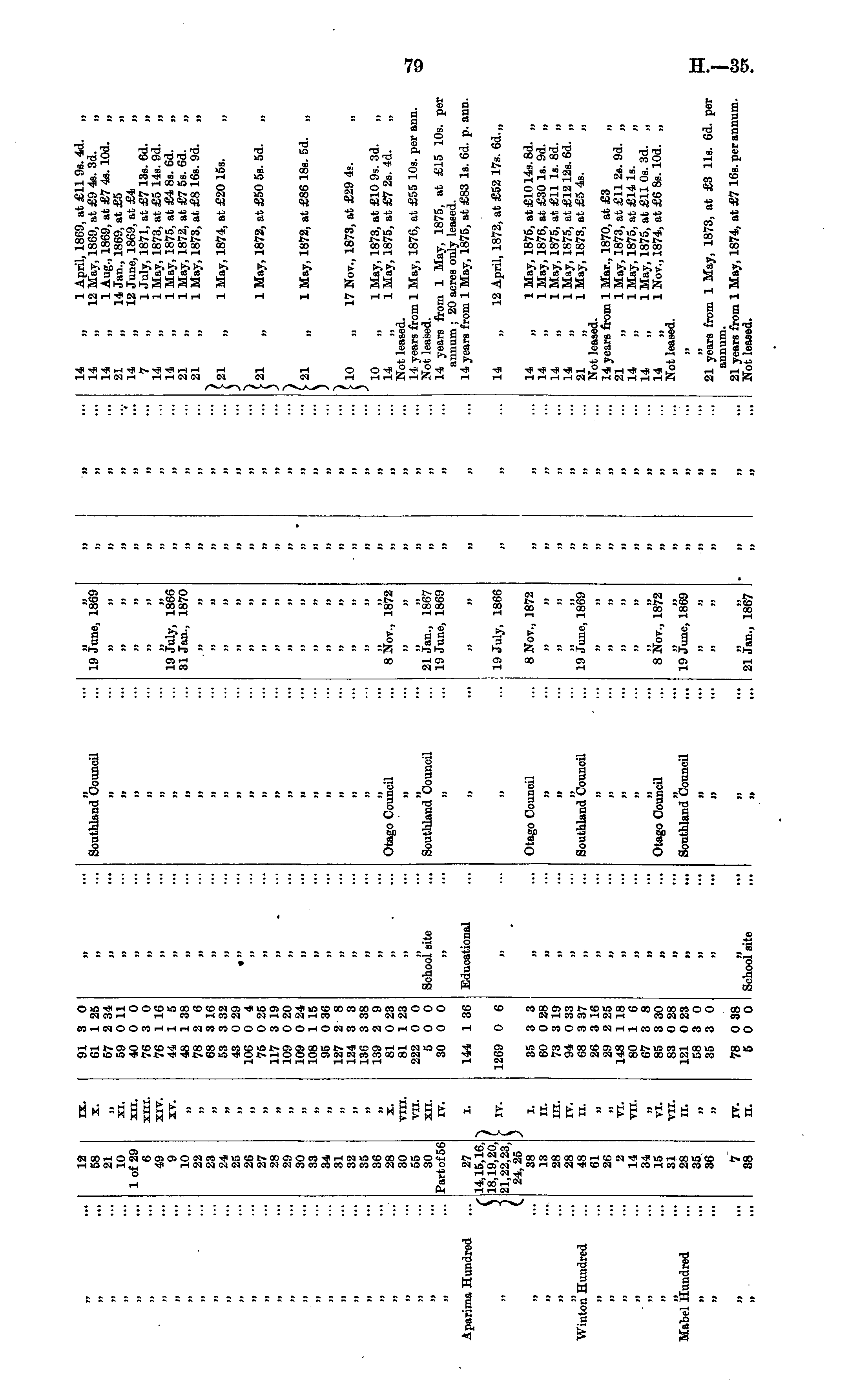 IT !» »! 11 ... 12 58 21 10 1 of 29 6 49 9 10 22 23 24 25 26 27 28 29 30 33 34 31 32 35 36 28 30 55 30 Part of 56 IX. X. JJ XI. XII. XIII. XIV. XV. 91 3 0 61 1 25 57 2 34 69 0 11 40 0 0 76 3 0 76 1 16 44 1 5 48 1 38 78 2 6 68 3 16 53 3 32 43 0 29 106 0 4 75 0 25 117 3 19 109 0 20 109 0 24 108 1 15 95 0 36 127 2 8 124 3 3 136 3 38 139 2 9 81 0 23 81 1 23 222 0 0 5 0 0 30 0 0 II ■| )) H 11 Southland Council i) M H 19 June, 1869 >i ii ii ii i) ii •| )] JJ 11 I] ■jj tt it it tt "V 14 „ 1 April, 1869, at £11 9s. 4d. „ 14 „ 12 May, 1869, at £9 4s. 3d. „ 14 „ 1 Aug., 1869, at £7 4s. lOd. „ 21 „ 14 Jan., 1869, at £5 „ 14 „ 12 June, 1869, at £4 „ 7 „ 1 July, 1871, at £7 13s. 6d. „ 14 „ 1 May, 1873, at £5 14a. 9d. „ 14 „ 1 May, 1875, at £4 8s. 6d. 21 „ 1 May, 1872, at £7 5s. 6d. „ 21 „ 1 May, 1873, at £8 16s. 9d. „ M ii ii it u it H || || 19 July, 1866 31 Jan., 1870 It tt M M n il H M J) 1} tt n JJ H n 11 II 11 n jj n M if II II 11 91 21 „ 1 May, 1874, at £20 15s. >i it n n il H Jl M it « H m ii il JJ n ii ii tt >> j» i) h u tt ii ii ij Jl 1) tt tt 21 „ 1 May, 1872, at £50 5s. 5d. „ ii it n M ii i) Jl it n tt n 11 ii il 11 ii 21 „ 1 May, 1872, at £86 18s. 5d. „ ]J li ii ■ H tt » Jl ii a H 11 ii ii Jl n ii tt 11 II ii ii Jl N 10 „ 17 Nov., 1873, at £29 4s. ii n n Ii il ii JJ ii it j> II ii ii ■ JJ n ii it M n ii tt 11 u 10 „ 1 May, 1873, at £10 9s. 3d. „ 14 „ 1 May, 1875, at £7 2s. Id. „ Not leased. 14 years from 1 May, 1876, at £55 10s. per ann. Not leased. 14 yoars from 1 May, 1875, at £15 10s. per annum ; 20 acres only leased. 14 years from 1 May, 1875, at £83 Is. 6d. p. ann. ii >! X. VIII. VII. XII. IV. n •i School site ii Otago Council ii ii Southland Council 8 Not., 1872 M ii 21 Jan., 1867 19 June, 1869 JJ JJ 11 Jj n it it ji n Jl M ji ... ii ii H 11 Apariina Hundred ii 27 14,15,16, 18,19,20, 21,22,23, 24,25 38 13 28 28 48 61 26 2 14 34 15 31 28 35 36 I. 144 1 36 Educational it M tt jj M C IT1269 0 6 u tt 19 July, 1866 u It 14 „ 12 April, 1872, at £52 17s. 6d.,, n ii H li Winton Hundred ii *•• i. ii. in. IV. II. M 35 3 3 60 0 28 73 3 19 94 0 33 68 3 37 26 3 16 29 2 25 148 1 18 80 1 6 67 3 8 85 3 30 83 0 28 121 0 23 58 3 0 35 3 0 M »> n M 11 It Otago Council tt t$ tt Southland Council j) 8 Nov., 1872 » tt tt tt 19 June, 1869 11 11 ii ii i) jl jj jj n it it M u ji 14 „ 1 May, 1875, at £1014s. 8d. „ 14 „ 1 May, 1876, at £30 Is. 9d. „ 14 „ 1 May, 1875, at £11 Is. 8d. „ 14 „ 1 May, 1875, at £12 12s. 6d. „ 21 „ 1 May, 1873, at £5 4s. „ Not leased. 14 years from 1 Mar., 1870, at £3 „ 21 „ 1 May, 1873, at £11 2s. 9d. „ 14 „ 1 May, 1875, at £14 Is. „ 14 „ 1 May, 1875, at £11 Os. 3d. „ 14 „ 1 Nov., 1874, at £6 8s. lOd. „ Not leased. ii VI. VII. M i> 11 11 jj M M N ii 11 11 jj 1) ii II tt 11 >! jj )» >! IJ JJ VI. VII. II. If M ii Otago Council 8 Nov., 1872 jl Jl 11 11 Mabel Hundred 11 Southland Council 19 June, 1869 11 11 11 H jj u ii u ii tt tt JJ 11 21 years from 1 May, 1873, at £3 11s. 6d. per annum. 21 years from 1 May, 1874, at £7 16s. per annum. Not leased. tt It u i> tt jl 11 a 7 38 rv. ii. 78 0 38 5 0 0 11 School site ii 21 Jan., 1867 il JJ ii ... i ii 11 J»