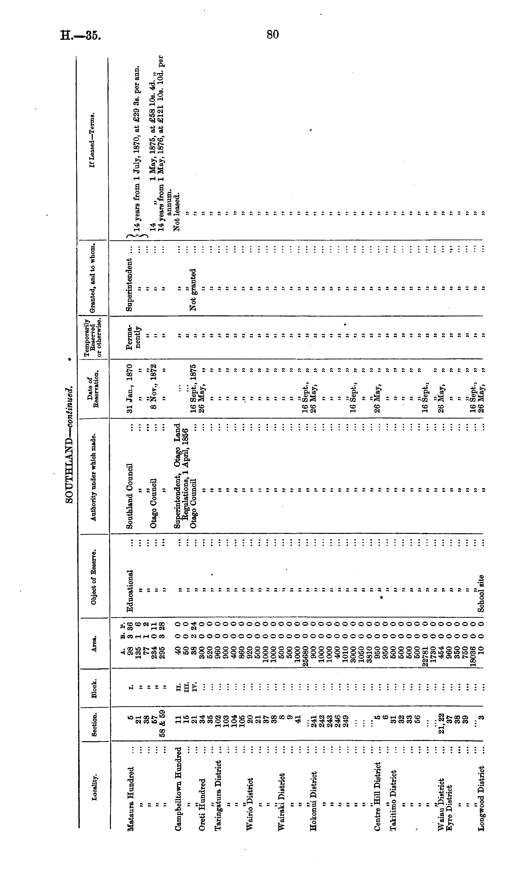 SOUTHLAND— continued. Locality. Section. Block. Area. Object of Reserve. Authority under which made. Date of Reservation. Temporarily Reserved or otherwise. Granted, and to whom. If Leased— Terms. Mataura Hundred „ ... 5 21 38 57 58&59 I. j» >> A. B. P. 98 3 36 135 1 6 77 1 2 234 0 11 295 3 28 Educational M M Southland Council a ••• Otago Council 31 Jan., 1870 }i jj 8 Not., 1872 Permanently jj Superintendent ... jj ••• jj • •• 1 14 years from 1 July, 1870, at £29 3s. per ann. jj ••■ 14 „ 1 May, 1875, at £58 10s. 4d. „ 14 years from 1 May, 1876, at £121 10s. lOd. pe; annum. Not leased. jj ••■ j» H jj jj * ■ * jj ••• jj II » ••• JJ J) j> jj •" Campbelltown Hundred 11 15 21 34 35 102 103 104 105 20 21 37 38 8 9 41 II. III. IV. 40 0 0 50 0 0 38 2 24 300 0 0 520 0 0 960 0 0 900 0 0 400 0 0 860 0 0 920 0 0 500 0 0 1000 0 0 1000 0 0 500 0 0 500 0 0 1000 0 0 25680 0 0 900 0 0 1000 0 0 1000 0 0 400 0 0 1010 0 0 3000 0 0 1050 0 0 3810 0 0 950 0 0 950 0 0 500 0 0 500 0 0 500 0 0 500 0 0 22781 0 0 1730 0 0 454 0 0 960 0 0 350 0 0 750 0 0 18036 0 0 10 0 0 M Ji Superintendent, Otago Land Regulations, 1 April, 1856 Otago Council 16 Sept, 1875 26 May, „ j» jj jj *•• jj •*• Not granted jj jj • •• Oreti Hundred I) jj jj II ,, .. • jj jj Taringatura District ... )» „ ... JJ JJ a jj • •• jj ,, ... JJ JJ jj » • •■ jj jj *• • n ,j ... JJ JJ jj u jj ••■ H it * •• )J JJ u j» * •> ti • *• Wairio District jj a ••• .JJ I> a jj ••• jj ii >» •• • J) JJ jj ,, jj jj ■ ■• ii J) JJ jj jj ■ • • i) •■ • )j ,, ■•• JJ JJ jj jj ■ • • Wairaki District M ,, .•• JJ JJ jj jj • • • II ,, ... JJ II j» j> • • • jj jj ••• it !» ••• JJ JJ jj jj H jj •" Hokonui District 241 242 243 246 249 9) M it "• j, ■•( 16 Sept., ]', 26 May, „ j) jj jj • • ■ jj ■ *• jj % )) it j» • ■ • >J it ••■ II ,, jj jj Jj „ ... Jj » H J) ■•• JJ 19 jj u ■ • * j, ... n JJ •*• JJ JJ jj j» ■ ■ ■ jj ••• j) JJ ••• 16 Sept., ," Jj * jj • ■ * jj »j «•• n JJ • •• »j jj ••• jj jj ■ •• m JJ ••' JJ JJ JJ » jj Centre Hill District ... 5 6 31 32 33 5G }) J> • ■• 26 May, » jj jj • ■• jj « w JJ • • • jj jj •■ • H Takitimo District it JJ • • • jj jj jj jj jj i) J> ■ ■• it >* jj jj », ... ii »J ••• jj JJ Jj jj ,j ... )) JJ • •• Jj it jj jj jj j, <.i t> J» •** Ii II 16 Sept., »j jj j» ... j, ... jj it t> "• a j, ... „ ... Waiau District Eyre District ... 21,22 37 38 39 Jj JJ ••• 26 May, "„ Jj jj • •* n H JJ ••• J) jj ••• jj a JJ ••• Ii JJ jj jj •*• jj a a jj JJ 9$ »j jj n •>• S3 it • ■ ■ 16 Sept., " 26 May, „ it jj ■ •• ii Longwood District "*3 it School site jj ■ •■ jj jj jj ioni i) ... jj j, jj