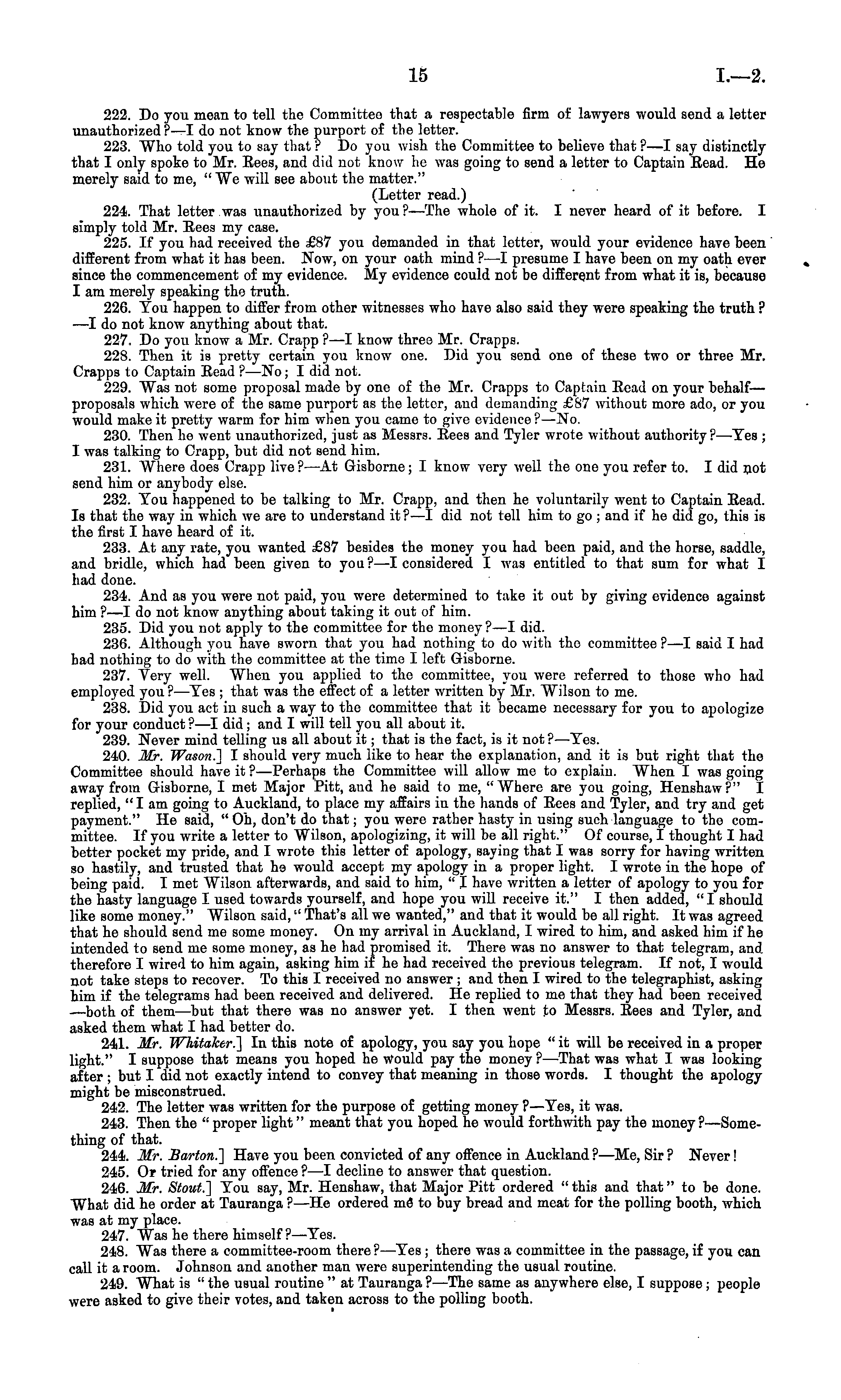 222. Do you mean to tell the Committee that a respectable firm of lawyers would send a letter unauthorized ?—I do not know the purport of the letter. 223. Who told you to say that ? Do you wish the Committee to believe that ?—I say distinctly that I only spoke to Mr. Bees, and did not know he was going to send a letter to Captain Read. He merely said to me, " We will see about tho matter." (Letter read.) 224. That letter was unauthorized by you ? —The whole of it. I never heard of it before. I simply told Mr. Rees my case. 225. If you had received the £87 you demanded in that letter, would your evidence have been different from what it has been. Now, on your oath mind ? —I presume I have been on my oath ever % since the commencement of my evidence. My evidence could not be different from what it is, because I am merely speaking the truth. 226. Tou happen to differ from other witnesses who have also said they were speaking the truth ? —I do not know anything about that. 227. Do you know a Mr. Crapp ? —I know threo Mr. Crapps. 228. Then it is pretty certain you know one. Did you send one of these two or three Mr. Crapps to Captain Read ?—No; I did. not. 229. Was not some proposal made by one of the Mr. Crapps to Captain Read on your behalf— proposals which were of the same purport as the letter, aud demanding £87 without more ado, or you would make it pretty warm for him when you came to give evidence ?—No. 230. Then he went unauthorized, just as Messrs. Rees and Tyler wrote without authority?—Tes ; I was talking to Crapp, but did not send him. 231. Where does Crapp live?—At Gisborne; I know very well the one you refer to. I did not send him or anybody else. 232. Tou happened to be talking to Mr. Crapp, and then he voluntarily went to Captain Read. Is that the way in which we are to understand it ? —I did not tell him to go ; and if he did go, this is the first I have heard of it. 233. At any rate, you wanted £87 besides the money you had been paid, and the horse, saddle, and bridle, which had been given to you?—l considered I was entitled to that sum for what I had done. 234. And as you were not paid, you were determined to take it out by giving evidence against him ?—I do not know anything about taking it out of him. 235. Did you not apply to the committee for the money?—l did. 236. Although you have sworn that you had nothing to do with tho committee ?—I said I had had nothing to do with the committee at the time I left Gisborne. 237. Very well. When you applied to the committee, you were referred to those who had employed you ? —Tes ; that was the effect of a letter written by Mr. Wilson to me. 238. Did you act iv such a way to the committee that it became necessary for you to apologize for your conduct?—l did ; and I will tell you all about it. 239. Never mind telling us all about it; that is the fact, is it not ? —-Tes. 240. Mr. Wason.] I should very much like to hear the explanation, and it is but right that the Committee should have it ?—Perhaps the Committee will allow me to explain. When I was going away from Gisborne, I met Major Pitt, and he said to me, "Where are you going, Henshaw?" I replied, "I am going to Auckland, to place my affairs in the hands of Rees and Tyler, and try and get payment." He said, " Oh, don't do that; you were rather hasty in using such language to tho committee. If you write a letter to Wilson, apologizing, it will be all right." Of course, I thought I had better pocket my pride, and I wrote this letter of apology, saying that I was sorry for having written so hastily, and trusted that he would accept my apology in a proper light. I wrote in the hope of being paid. I met Wilson afterwards, and said to him, " I have written a letter of apology to you for the hasty language I used towards yourself, and hope you will receive it." I then added, "I should like some money." Wilson said," That's all we wanted," and that it would be all right. It was agreed that he should send me some money. On my arrival in Auckland, I wired to him, and asked him if he intended to send me some money, as he had promised it. There was no answer to that telegram, and therefore I wired to him again, asking him if he had received the previous telegram. If not, I would not take steps to recover. To this I received no answer ; and then I wired to the telegraphist, asking him if the telegrams had been received and delivered. He replied to me that they had been received —both of them —but that there was no answer yet. I then went to Messrs. Bees and Tyler, and asked them what I had better do. 241. Mr. Whitaker.] In this note of apology, you say you hope "it will be received in a proper light." I suppose that means you hoped he Would pay the money ?—-That was what I was looking after ; but I did not exactly intend to convey that meaning in those words. I thought the apology might be misconstrued. 242. The letter was written for the purpose of getting money ?—Tes, it was. 243. Then the " proper light" meant that you hoped he would forthwith pay the money ?—Something of that. 244. Mr. Barton.] Have you been convicted of any offence in Auckland ? —Me, Sir ? Never! 245. Or tried for any offence ?• —I decline to answer that question. 246. Mr. Stout.] Tou say, Mr. Henshaw, that Major Pitt ordered " this and that" to be done. What did he order at Tauranga ? —He ordered md to buy bread and meat for the polling booth, which was at my place. 247. Was he there himself ?—Tes. 248. Was there a committee-room there ? —Tes ; there was a committee in the passage, if you can call it a room. Johnson and another man were superintending the usual routine. 249. What is " the usual routine " at Tauranga ? —The same as anywhere else, I suppose ; people were asked to give their votes, and taken across to the polling booth.