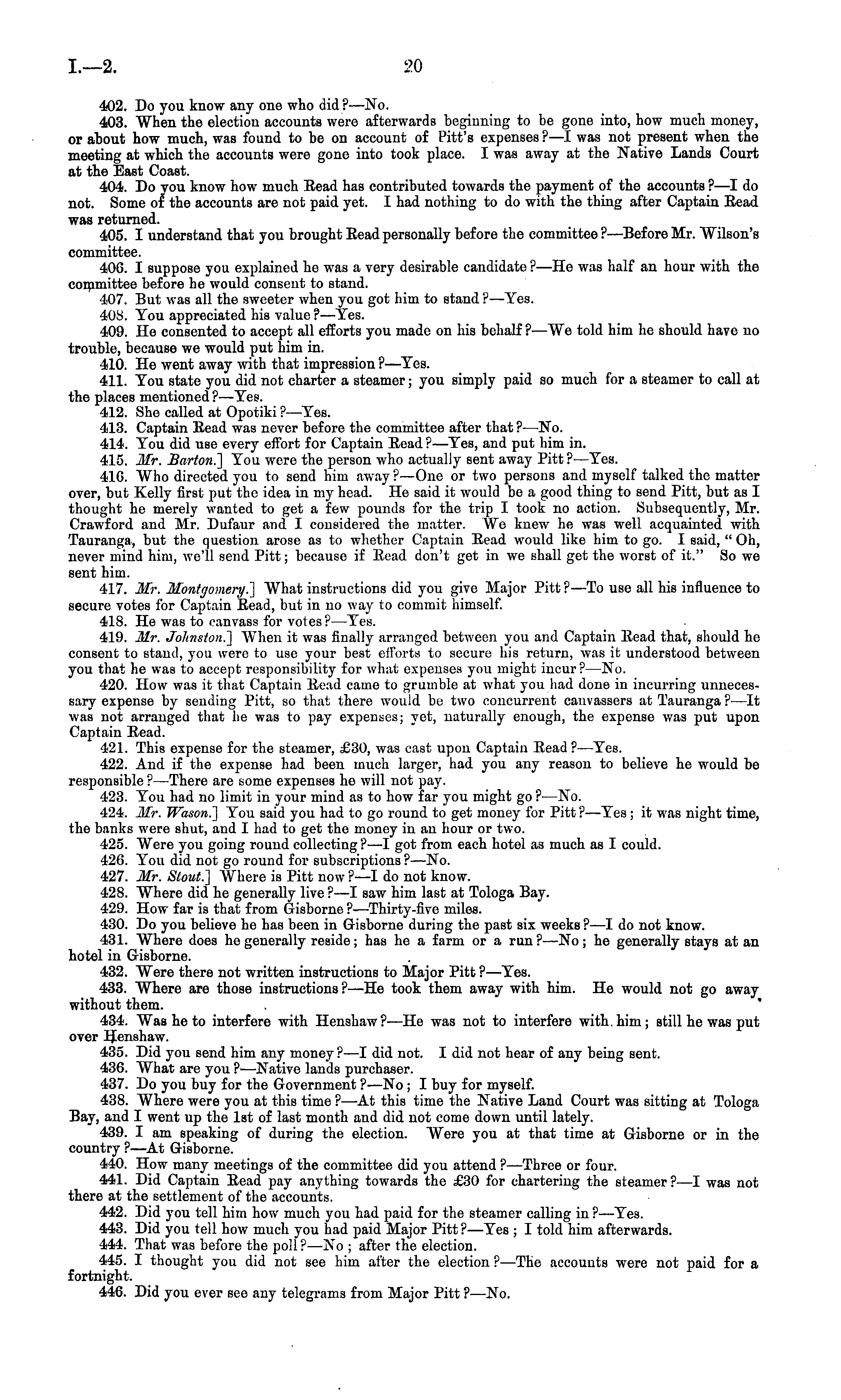 402. Do you know any one who did ?—No. 403. When the election accounts were afterwards beginning to be gone into, how much money, or about how much, was found to be on account of Pitt's expenses ? —I was not present when the meeting at which the accounts were gone into took place. I was away at the Native Lands Court at the East Coast. 404. Do you know how much Bead has contributed towards the payment of the accounts ?—I do not. Some of the accounts are not paid yet. I had nothing to do with the thing after Captain Read was returned. 405. I understand that you brought Read personally before the committee ?—Before Mr. Wilson's committee. 406. I suppose you explained he was a very desirable candidate ? —He was half an hour with the committee before he would consent to stand. 407. But was all the sweeter when you got him to stand ? —Yes. 408. You appreciated his value ?—Yes. 409. He consented to accept all efforts you made on his behalf ? —AVe told him he should have no trouble, because we would put him in. 410. He went away with that impression ?—Yes. 411. You state you did not charter a steamer; you simply paid so much for a steamer to call at the places mentioned ? —Yes. 412. She called at Opotiki ?—Yes. 413. Captain Bead was never before the committee after that ? —No. 414. You did use every effort for Captain Bead ?—Yes, and put him in. 415. Mr. Barton.] You were the person who actually sent away Pitt?- —Yes. 416. Who directed you to send him away ?—One or two persons and myself talked the matter over, but Kelly first put the idea in my head. He said it would be a good thing to send Pitt, but as I thought he merely wanted to get a few pounds for the trip I took no action. Subsequently, Mr. Crawford and Mr. Dufaur and I considered the matter. We knew he was well acquainted with Tauranga, but the question arose as to whether Captain Bead would like him to go. I said, " Oh, never mind him, we'll send Pitt; because if Bead don't get in we shall get the worst of it." So we sent him. 417. Mr. Montgomery.] What instructions did you give Major Pitt ?—To use all his influence to secure votes for Captain Bead, but in no way to commit himself. 418. He was to canvass for votes? —Tea. 419. Mr. Johnston^] When it was finally arranged between you and Captain Bead that, should he consent to stand, you were to use your best efforts to secure his return, was it understood between you that he was to accept responsibility for what expenses you might incur? —No. 420. How was it that Captain Bead came to grumble at what you had done in incurring unnecessary expense by sending Pitt, so that there would be two concurrent canvassers at Tauranga ? —lt was not arranged that he was to pay expenses; yet, naturally enough, the expense was put upon Captain Bead. 421. This expense for the steamer, £30, was cast upon Captaiu Bead? —Yes. 422. And if the expense had been much larger, had you any reason to believe he would be responsible ? —There are some expenses he will not pay. 423. You had no limit in your mind as to how far you might go ? —No. 424. Mr. Wason7\ You said you had to go round to get money for Pitt ? —Yes ; it was night time, tho banks were shut, and I had to get the money in an hour or two. 425. Were you going round collecting? —I got from each hotel as much as I could. 426. You did not go round for subscriptions?— No. 427. Mr. Stout.] AVhere is Pitt now ? —I do not know. 428. Where did he generally live ? —I saw him last at Tologa Bay. 429. How far is that from Gisborne ?-—Thirty-five miles. 430. Do you believe he has been in Gisborne during the past six weeks?—l do not know. 431. Where does he generally reside; has he a farm or a run ?—No; ho generally stays at an hotel in Gisborne. 432. Were there not written instructions to Major Pitt ? —Yes. 433. Where are those instructions?—He took them away with him. He would not go away without them. 434. Was he to interfere with Henshaw? —He was not to interfere with him; still he was put over Henshaw. 435. Did you send him any money ? —I did not. I did not hear of any being sent. 436. What are you ?• —Native lands purchaser. 437. Do you buy for the Government ?—No; I buy for myself. 438. Where were you at this time ?—At this time the Native Land Court was sitting at Tologa Bay, and I went up the Ist of last month and did not come down until lately. 439. I am speaking of during the election. AVere you at that time at Gisborne or in the country- ?—At Gisborne. 440. How many meetings of the committee did you attend ? —Three or four. 441. Did Captain Bead pay anything towards the £30 for chartering the steamer?—l was not there at the settlement of the accounts. 442. Did you tell him how much you had paid for tho steamer calling in ? —Yes. 443. Did you tell how much you had paid Major Pitt?—Yes ; I told him afterwards. 444. That was before the poll?—No ; after the election. 445. I thought you did not see him after the election ?—The accounts were not paid for a fortnight. 446. Did you ever see any telegrams from Major Pitt ? —No.