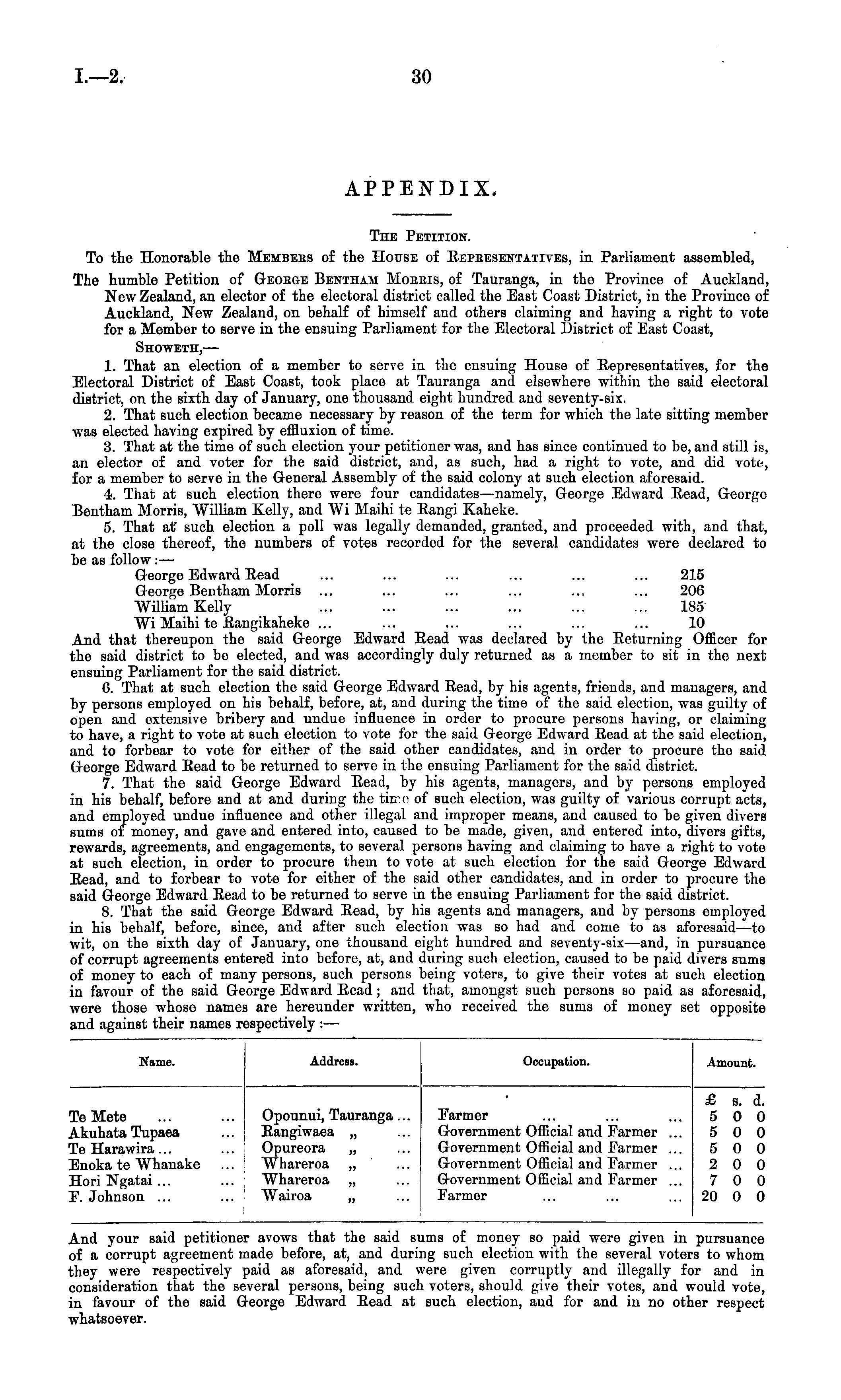 APPENDIX. The Petition. To the Honorable the Members of the House of Representatives, in Parliament assembled, The humble Petition of George Bentham Morris, of Tauranga, in the Province of Auckland, New Zealand, an elector of the electoral district called the East Coast District, in the Province of Auckland, New Zealand, on behalf of himself and others claiming and having a right to vote for a Member to serve in the ensuing Parliament for the Electoral District of East Coast, Showeth, — 1. That an election of a member to serve in the ensuing House of Bepresentatives, for the Electoral District of East Coast, took place at Tauranga and elsewhere within the said electoral district, on the sixth day of January, one thousand eight hundred and seventy-six. 2. That such election became necessary by reason of the term for which the late sitting member was elected having expired by effluxion of time. 3. That at the time of such election your petitioner was, and has since continued to be, and still is, an elector of and voter for the said district, and, as such, had a right to vote, and did vote, for a member to serve in the General Assembly of the said colony at such election aforesaid. 4. That at such election there were four candidates—namely, George Edward Read, Georgo Bentham Morris, William Kelly, and Wi Maihi te Rangi Kaheke. 5. That at' such election a poll was legally demanded, granted, and proceeded with, and that, at the close thereof, the numbers of votes recorded for the several candidates were declared to be as follow: — George Edward Bead ... ... ... ... ... ... 215 George Bentham Morris ... ... ... ... .., ... 206 William Kelly ... ... ... ... ... ... 185 Wi Maihi te Bangikaheke ... ... ... ... ... ... 10 And that thereupon the said George Edward Read was declared by the Beturning Officer for the said district to be elected, and was accordingly duly returned as a member to sit in the next ensuing Parliament for the said district. 6. That at such election the said George Edward Read, by his agents, friends, and managers, and by persons employed on his behalf, before, at, and during the time of the said election, was guilty of open and extensive bribery and undue influence in order to procure persons having, or claiming to have, a right to vote at such election to vote for the said George Edward Read at the said election, and to forbear to vote for either of the said other candidates, and in order to procure the said George Edward Read to be returned to serve in the ensuing Parliament for the said district. 7. That the said George Edward Read, by his agents, managers, and by persons employed in his behalf, before and at and during the tine of such election, was guilty of various corrupt acts, and employed undue influence and other illegal and improper means, and caused to be given divers sums of money, and gave and entered into, caused to be made, given, and entered into, divers gifts, rewards, agreements, and engagements, to several persons having and claiming to have a right to vote at such election, in order to procure them to vote at such election for the said George Edward Read, and to forbear to vote for either of the said other candidates, and in order to procure the said George Edward Read to be returned to serve in the ensuing Parliament for the said district. 8. That the said George Edward Read, by his agents and managers, and by persons employed in his behalf, before, since, and after such election was so had and come to as aforesaid —to wit, on the sixth day of January, one thousand eight hundred and seventy-six —and, in pursuance of corrupt agreements entered into before, at, and during such election, caused to be paid divers sums of money to each of many persons, such persons being voters, to give their votes at such election in favour of the said George Edward Read; and that, amongst such persons so paid as aforesaid, were those whose names are hereunder written, who received the sums of money set opposite and against their names respectively : —