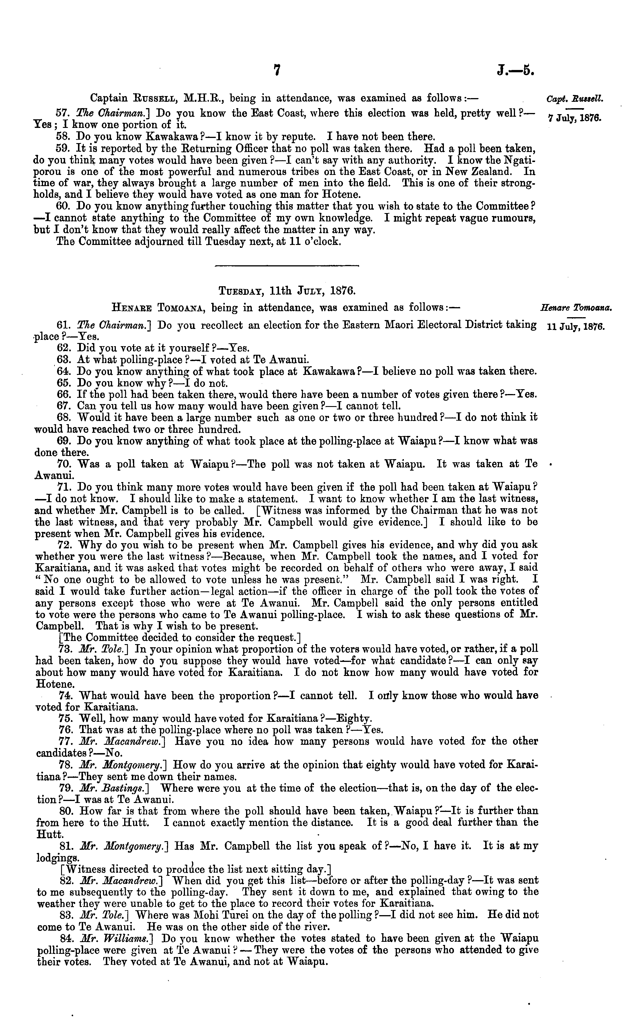 Tuesday, 11th July, 1876. Henaee Tomoana, being in attendance, was examined as follows: — 61. The Chairman.] Do you recollect an election for the Eastern Maori Electoral District taking place ? —-Yes. 62. Did you vote at it yourself ?—Yes. 63. At what polling-place ?—I voted at Te xiwanui. 64. Do you know anything of what took place at Kawakawa ?—I believe no poll was taken there. 65. Do you know why ? —I do not. 66. If the poll had been taken there, would there have been a number of votes given there ? —Yes. 67. Can you tell us how many would have been given ? —I cannot tell. 68. "Would it have been a large number such as one or two or three hundred ?—I do not think it would have reached two or three hundred. 69. Do you know anything of what took place at the polling-place at Waiapu ?—I know what was done there. 70. Was a poll taken at Waiapu?—The poll was not taken at Waiapu. It was taken at Te Awanui. 71. Do you think many more votes would have been given if the poll had been taken at Waiapu P —I do not know. I should like to make a statement. I want to know whether lam the last witness, and whether Mr. Campbell is to be called. [Witness was informed by the Chairman that he was not the last witness, and that very probably Mr. Campbell would give evidence.] I should like to be present when Mr. Campbell gives his evidence. 72. Why do you wish to be present when Mr. Campbell gives his evidence, and why did you ask whether you were the last witness ?—Because, when Mr. Campbell took the names, and I voted for Karaitiana, and it was asked that votes might be recorded on behalf of others who were away, I said "No one ought to be allowed to vote unless he was present." Mr. Campbell said I was right. I said I would take further action—legal action—if the officer in charge of the poll took the votes of any persons except those who were at Te Awanui. Mr. Campbell said the only persons entitled to vote were the persons who came to Te Awanui polling-place. I wish to ask these questions of Mr. Campbell. That is why I wish to be present. [The Committee decided to consider the request.] 73. Mr. Tole.] In your opinion what proportion of the voters would have voted, or rather, if a poll had been taken, how do you suppose they would have voted—for what candidate ?—I can only say about how many would have voted for Karaitiana. I do not know how many would have voted for Hotene. 74. What would have been the proportion ?—I cannot tell. I only know those who would have voted for Karaitiana. 75. Well, how many would have voted for Karaitiana ?—Eighty. 76. That was at the polling-place where no poll was taken ? —Yes. 77. Mr. Macandrew.] Have you no idea how many persons would have voted for the other candidates ?—No. 78. Mr. Montgomery.] How do you arrive at the opinion that eighty would have voted for Karaitiana ?—They sent me down their names. 79. Mr. Bastings.] Where were you at the time of the electiou —that is, on the day of the election?—l was at Te Awanui. 80. How far is that from where the poll should have been taken, Waiapu?—lt is further than from here to the Hutt. I cannot exactly mention the distance. It is a good deal further than the Hutt. 81. Mr. Montgomery.] Has Mr. Campbell the list you speak of ?—No, I have it. It is at my lodgings. "" [Witness directed to produce the list next sitting day.] 82. Mr. Macandrew.] AVhen did you get this list—before or after the polling-day? —It was sent to me subsequently to the polling-day. They sent it down to me, and explained that owing to the weather they were unable to get to the place to record their votes for Karaitiana. 83. Mr. Tole.] Where was Mohi Turei on the day of the polling ?—I did not see him. He did not come to Te Awanui. He was on the other side of the river. 84. Mr. Williams.] Do you know whether the votes stated to have been given at the Waiapu polling-place were given at Te Awanui ? — They were the votes of the persons who attended to give their votes. They voted at Te Awanui, and not at Waiapu.