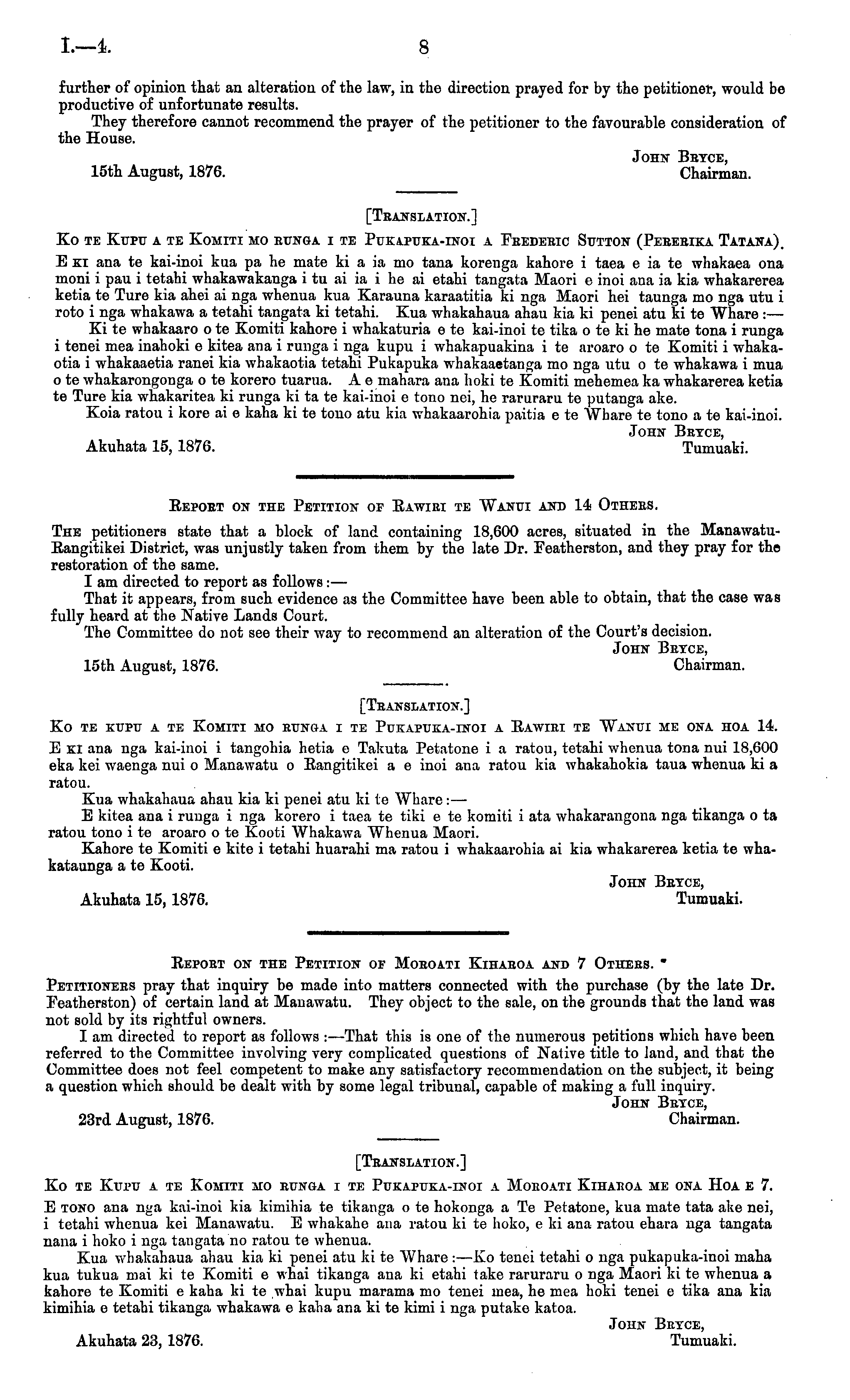 Report on the Petition of Moroati Kiharoa and 7 Others. * Petitioners pray that inquiry be made into matters connected with the purchase (by the late Dr. Featherston) of certain land at Manawatu. They object to the sale, on the grounds that the land was not sold by its rightful owners. I am directed to report as follows : —That this is one of the numerous petitions which have been referred to the Committee involving very complicated questions of Native title to land, and that the Committee does not feel competent to make any satisfactory recommendation on the subject, it being a question which should be dealt with by some legal tribunal, capable of making a full inquiry. John Brtce, 23rd August, 1876. Chairman. [Translation.] Ko te Kupu a te Komiti mo runga i te Pukapuka-inoi a Moroati Kiharoa me ona Hoa c 7. E tono ana nga kai-inoi kia kimihia te tikanga o te hokonga a Te Petatone, kua mate tata ake nei, i tetahi whenua kei Manawatu. E whakahe ana ratou kite hoko, eki ana ratou ehara nga tangata nana i hoko i nga tangata no ratou te whenua. Kua whakahaua ahau kia ki penei atu kite Whare : —Ko tenei tetahi o nga pukapuka-inoi inaka kua tukua mai kite Komiti c whai tikanga ana ki etahi take raruraru o nga Maori kite whenua a kahore te Komiti c kaha kite whai kupu marama mo tenei mea, he mea hoki tenei c tika ana kia kimihia c tetahi tikanga whakawa c kaha ana kite kimi i nga putake katoa. John Brtce, Akuhata 23, 1876. Tumuaki.