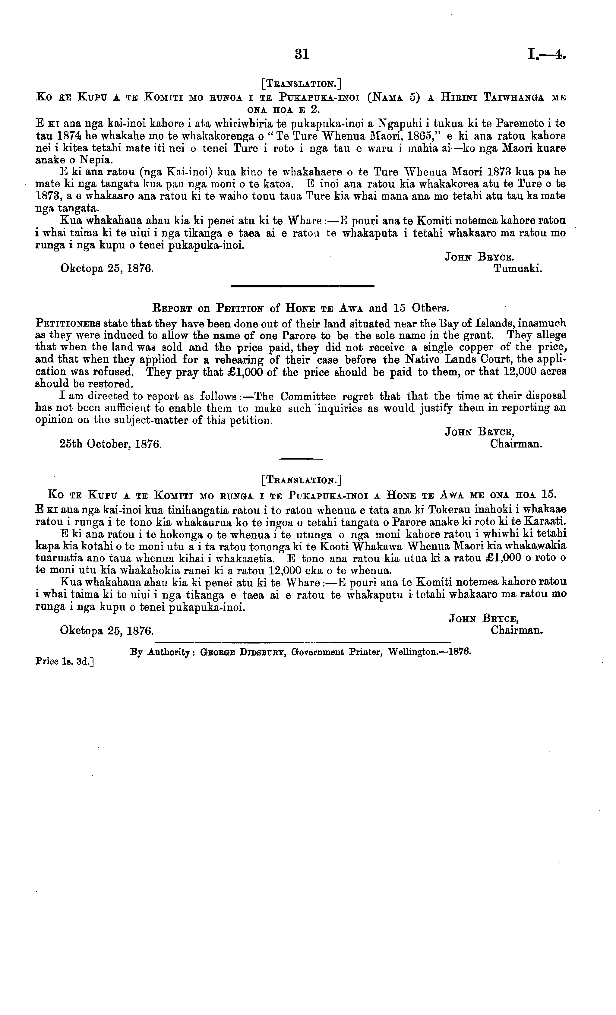 [Translation.] Ko ke Kupu a te Komiti mo runga i te Pukapuka-inoi (Nama 5) a Hirini Taiwhanga me ona hoa c 2. E ki ana nga kai-inoi kahore i ata whiriwhiria te pukapuka-inoi a Ngapuhi i tukua kite Paremete i te tau 1874 he whakahe mo te whakakorenga o "Te Ture Whenua Maori, 1865," c ki ana ratou kahore nei i kitea tetahi mate iti nei o tenei Ture i roto i nga tau c waru i mahia ai—ko nga Maori kuare anake o Nepia. E ki ana ratou (nga Kai-inoi) kua kino te whakahaere o te Ture Whenua Maori 1873 kua pa he mate ki nga tangata kua pau nga moni ote katoa. E inoi ana ratou kia whakakorea atu te Ture ote 1873, a c whakaaro ana ratou kite waiho tonu taua Ture kia whai mana ana mo tetahi atu tau ka mate nga tangata. Kua whakahaua ahau kia ki penei atu kite Whare: —E pouri ana te Komiti notemea kahore ratou i whai taima kite uiui i nga tikanga c taea ai c ratou te whakaputa i tetahi whakaaro ma ratou mo runga i nga kupu o tenei pukapuka-inoi. John Brtce. Oketopa 25, 1876. Tumuaki.