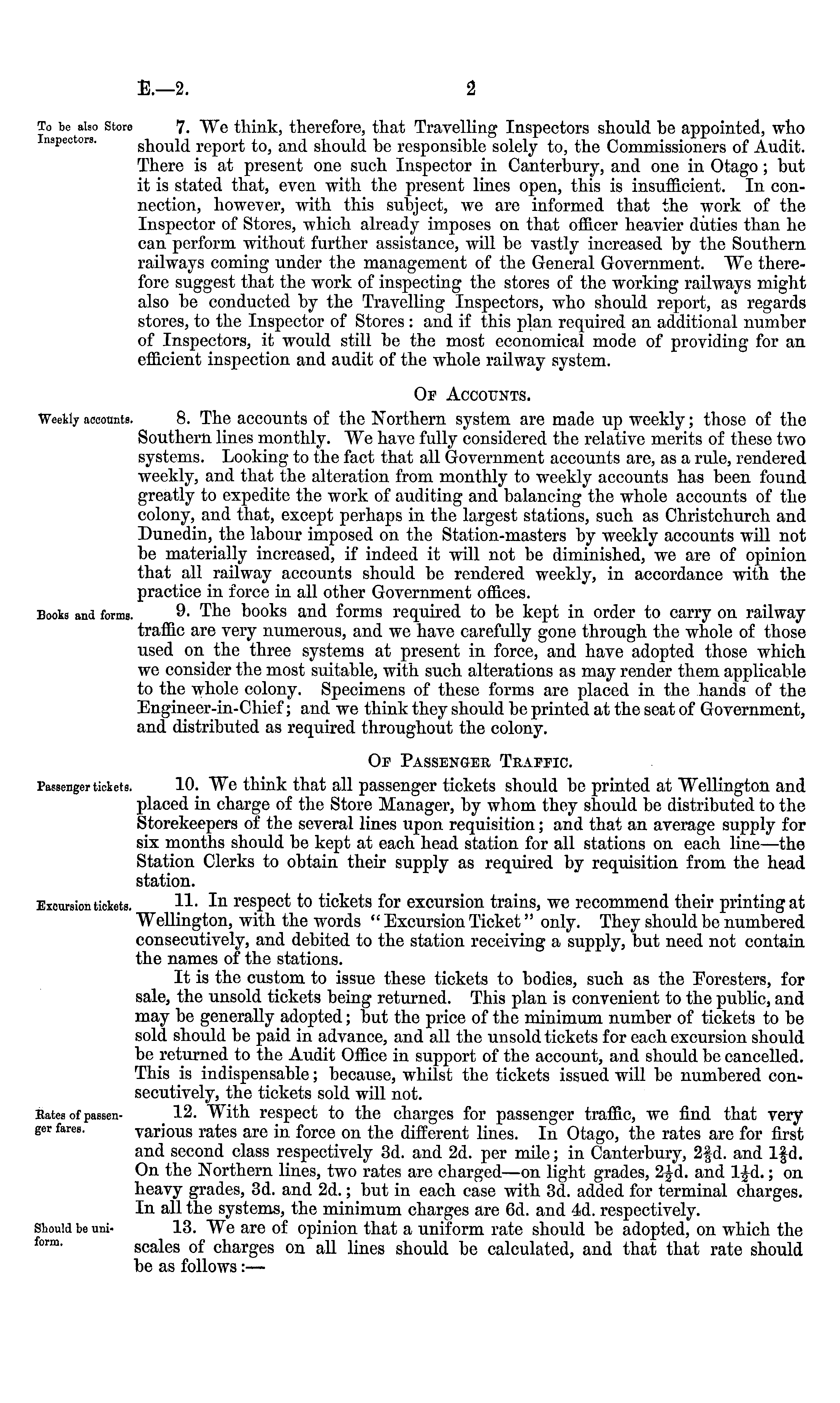 7. We think, therefore, that Travelling Inspectors should be appointed, who should report to, and should be responsible solely to, the Commissioners of Audit. There is at present one such Inspector in Canterbury, and one in Otago; but it is stated that, even with the present lines open, this is insufficient. In connection, however, with this subject, we are informed that the work of the Inspector of Stores, which already imposes on that officer heavier duties than he can perform without further assistance, will be vastly increased by the Southern railways coming under the management of the General Government. We therefore suggest that the work of inspecting the stores of the working railways might also be conducted by the Travelling Inspectors, who should report, as regards stores, to the Inspector of Stores : and if this plan required an additional number of Inspectors, it would still be the most economical mode of providing for an efficient inspection and audit of the whole railway system. Of Accounts. 8. The accounts of the Northern system are made up weekly; those of the Southern lines monthly. We have fully considered the relative merits of these two systems. Looking to the fact that all Government accounts are, as a rule, rendered weekly, and that the alteration from monthly to weekly accounts has been found greatly to expedite the work of auditing and balancing the whole accounts of the colony, and that, except perhaps in the largest stations, such as Christchurch and Dunedin, the labour imposed on the Station-masters by weekly accounts will not be materially increased, if indeed it will not be diminished, we are of opinion that all railway accounts should be rendered weekly, in accordance with the practice in force in all other Government offices. 9. The books and forms required to be kept in order to carry on railway traffic are very numerous, and we have carefully gone through the whole of those used on the three systems at present in force, and have adopted those which we consider the most suitable, with such alterations as may render them applicable to the whole colony. Specimens of these forms are placed in the hands of the Engineer-in-Chief; and we think they should be printed at the seat of Government, and distributed as required throughout the colony. Of Passenger Traffic. 10. We think that all passenger tickets should be printed at Wellington and placed in charge of the Store Manager, by whom they should be distributed to the Storekeepers of the several lines upon requisition; and that an average supply for six months should be kept at each head station for all stations on each line—the Station Clerks to obtain their supply as required by requisition from the head station. U- In respect to tickets for excursion trains, we recommend their printing at Wellington, with the words " Excursion Ticket" only. They should be numbered consecutively, and debited to the station receiving a supply, but need not contain the names of the stations. It is the custom to issue these tickets to bodies, such as the Eoresters, for sale, the unsold tickets being returned. This plan is convenient to the public, and may be generally adopted; but the price of the minimum number of tickets to be sold should be paid in advance, and all the unsold tickets for each excursion should be returned to the Audit Office in support of the account, and should be cancelled. This is indispensable; because, whilst the tickets issued will be numbered consecutively, the tickets sold will not. 12. With respect to the charges for passenger traffic, we find that very various rates are in force on the different lines. In Otago, the rates are for first and second class respectively 3d. and 2d. per mile; in Canterbury, 2fd. and lfd. On the Northern lines, two rates are charged—on light grades, 2^d. and l|d.; on heavy grades, 3d. and 2d.; but in each case with 3d. added for terminal charges. In all the systems, the minimum charges are Od. and 4<d. respectively. 13. We are of opinion that a uniform rate should be adopted, on which the scales of charges on all lines should be calculated, and that that rate should be as follows :—