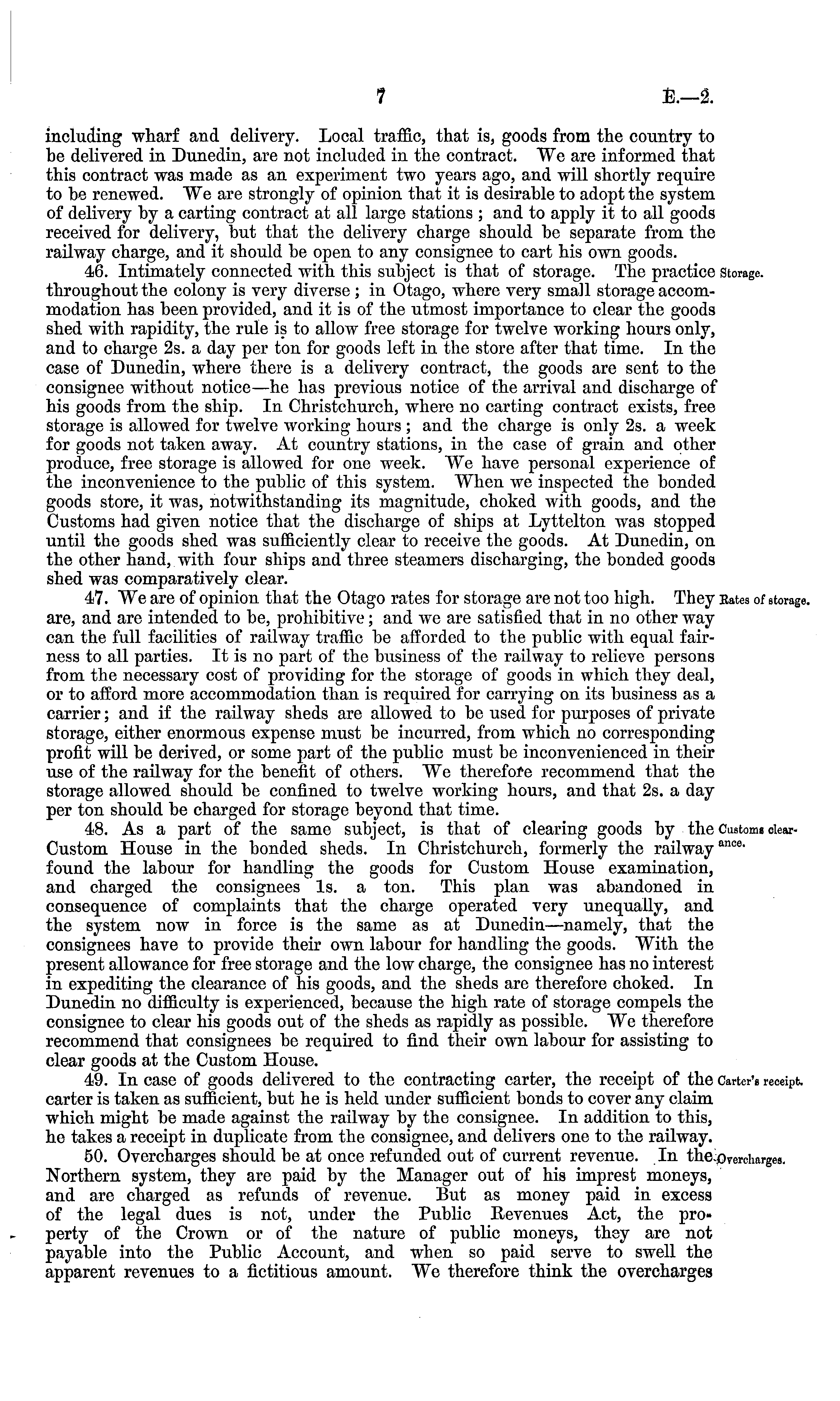 including wharf and delivery. Local traffic, that is, goods from the country to he delivered in Dunedin, are not included in the contract. We are informed that this contract was made as an experiment two years ago, and will shortly require to he renewed. "We are strongly of opinion that it is desirahle to adopt the system of delivery by a carting contract at all large stations ; and to apply it to all goods received for delivery, but that the delivery charge should be separate from the railway charge, and it should be open to any consignee to cart his own goods. 46. Intimately connected with this subject is that of storage. The practice throughout the colony is very diverse ; in Otago, where very small storage accommodation has been provided, and it is of the utmost importance to clear the goods shed with rapidity, the rule is to allow free storage for twelve working hours only, and to charge 2s. a day per ton for goods left in the store after that time. In the case of Dunedin, where there is a delivery contract, the goods are sent to the consignee without notice—he has previous notice of the arrival and discharge of his goods from the ship. In Christchurch, where no carting contract exists, free storage is allowed for twelve working hours ; and the charge is only 2s. a week for goods not taken away. At country stations, in the case of grain and other produce, free storage is allowed for one week. We have personal experience of the inconvenience to the public of this system. When we inspected the bonded goods store, it was, notwithstanding its magnitude, choked with goods, and the Customs had given notice that the discharge of ships at Lyttelton was stopped until the goods shed was sufficiently clear to receive the goods. At Dunedin, on the other hand, with four ships and tbree steamers discharging, the bonded goods shed was comparatively clear. 47. We are of opinion that the Otago rates for storage are not too high. They are, and are intended to be, prohibitive; and we are satisfied that in no other way can the full facilities of railway traffic be afforded to the public with equal fairness to all parties. It is no part of the business of the railway to relieve persons from the necessary cost of providing for the storage of goods in which they deal, or to afford more accommodation than is required for carrying on its business as a carrier; and if the railway sheds are allowed to be used for purposes of private storage, either enormous expense must be incurred, from which no corresponding profit will be derived, or some part of the public must be inconvenienced in their use of the railway for the benefit of others. We therefore recommend that the storage allowed should be confined to twelve working hours, and that 2s. a day per ton should be charged for storage beyond that time. 48. As a part of the same subject, is that of clearing goods by the Custom House in the bonded sheds. In Christchurch, formerly the railway found the labour for handling the goods for Custom House examination, and charged the consignees Is. a ton. This plan was abandoned in consequence of complaints that the charge operated very unequally, and the system now in force is the same as at Dunedin—namely, that the consignees have to provide their own labour for handling the goods. With the present allowance for free storage and the low charge, the consignee has no interest in expediting the clearance of his goods, and the sheds are therefore choked. In Dunedin no difficulty is experienced, because the high rate of storage compels the consignee to clear his goods out of the sheds as rapidly as possible. We therefore recommend that consignees be required to find their own labour for assisting to clear goods at the Custom House. 49. In case of goods delivered to the contracting carter, the receipt of the carter is taken as sufficient, but he is held under sufficient bonds to cover any claim which might be made against the railway by the consignee. In addition to this, he takes a receipt in duplicate from the consignee, and delivers one to the railway. 50. Overcharges should be at once refunded out of current revenue. In the.j Northern system, they are paid by the Manager out of his imprest moneys, and are charged as refunds of revenue. But as money paid in excess of the legal dues is not, under the Public Revenues Act, the pro« perty of the Crown or of the nature of public moneys, they are not payable into the Public Account, and when so paid serve to swell the apparent revenues to a fictitious amount. We therefore think the overcharges