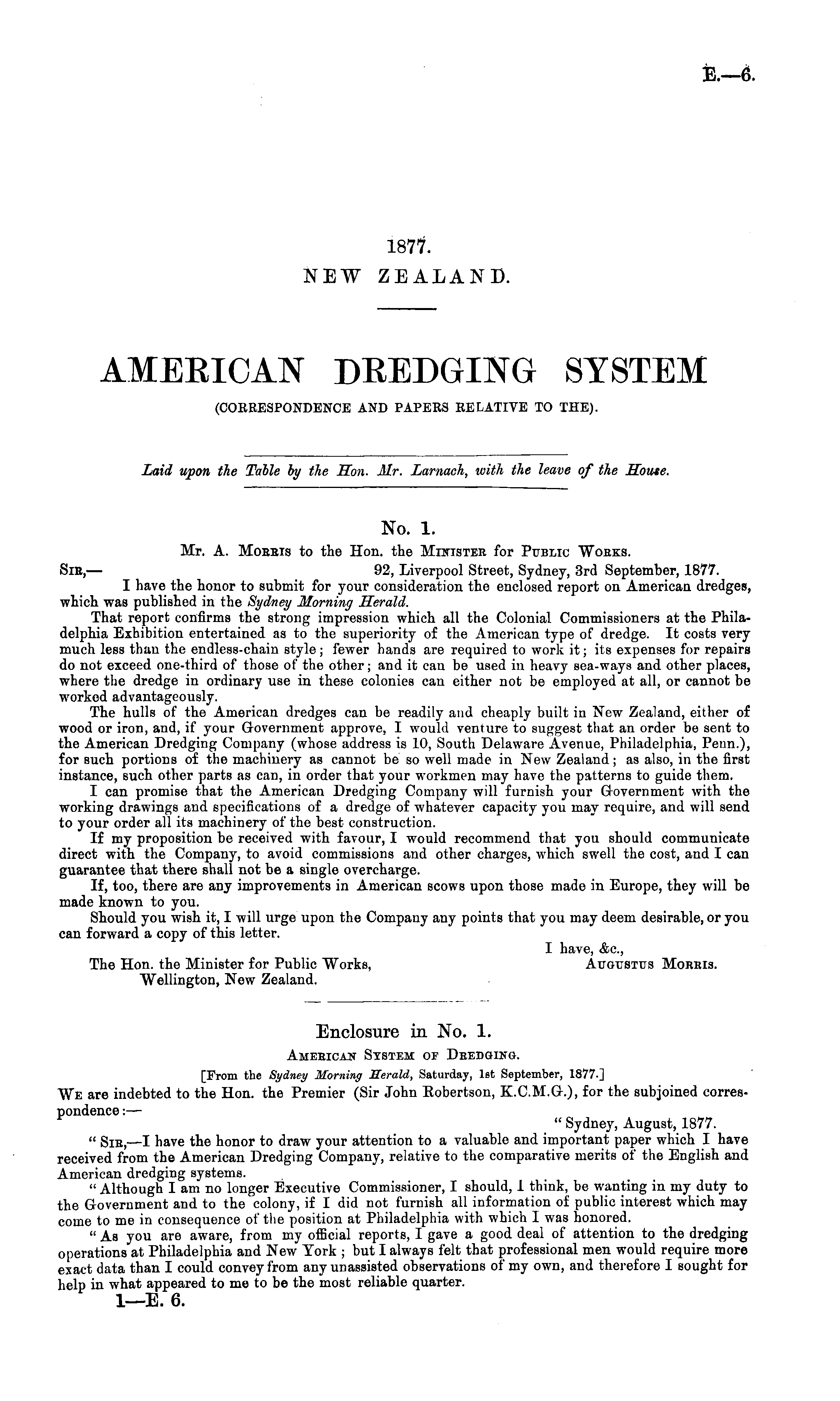 No. 1. Mr. A. Mobbis to the Hon. the Minister for Public Wobks. Sic, — 92, Liverpool Street, Sydney, 3rd September, 1877. I have the honor to submit for your consideration the enclosed report on American dredges, which was published in the Sydney Morning Herald. That report confirms the strong impression which all the Colonial Commissioners at the Philadelphia Exhibition entertained as to the superiority of the American type of dredge. It costs very much less than the endless-chain style ; fewer hands are required to work it; its expenses for repairs do not exceed one-third of those of the other; and it can be used in heavy sea-ways and other places, where the dredge in ordinary use in these colonies can either not be employed at all, or cannot be worked advantageously. The hulls of the American dredges can be readily and cheaply built in New Zealand, either of wood or iron, and, if your Government approve, I would venture to suggest that an order be sent to the American Dredging Company (whose address is 10, South Delaware Avenue, Philadelphia, Perm.), for such portions of the machinery as cannot be so well made in New Zealand; as also, in the first instance, such other parts as can, in order that your workmen may have the patterns to guide them. I can promise that the American Dredging Company will furnish your Government with the working drawings and specifications of a dredge of whatever capacity you may require, and will send to your order all its machinery of the best construction. If my proposition be received with favour, I would recommend that you should communicate direct with the Company, to avoid commissions and other charges, which swell the cost, and I can guarantee that there shall not be a single overcharge. If, too, there are any improvements in American scows upon those made in Europe, they will be made known to you. Should you wish it, I will urge upon the Company any points that you may deem desirable, or you can forward a copy of this letter. I have, &c, The Hon. the Minister for Public Works, Augustus Moeeis. Wellington, New Zealand.