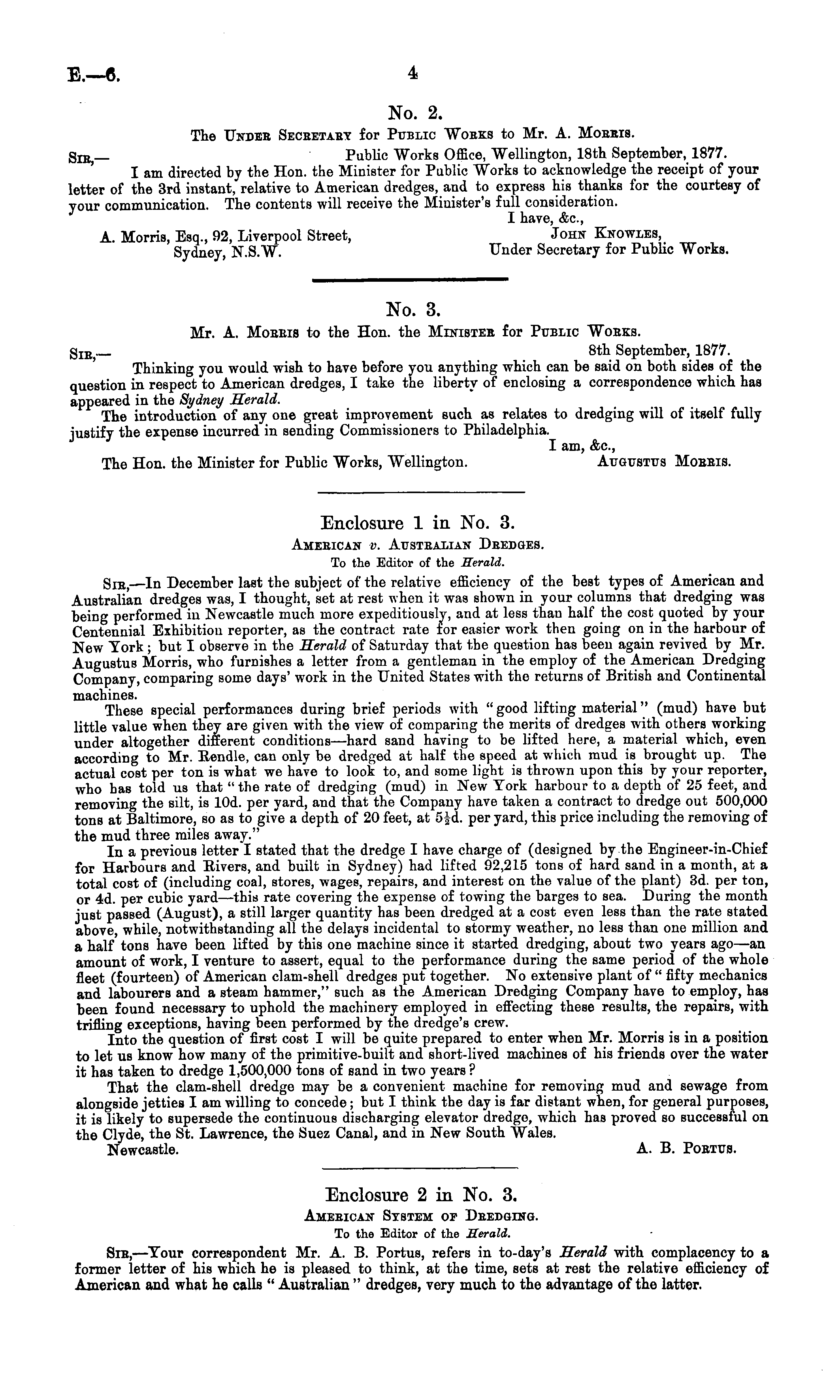 No. 3. Mr. A. Moeeis to the Hon. the Ministee for Public Wobks. g IE Bth September, 1877. Thinking you would wish to have before you anything which can be said on both sides of the question in respect to American dredges, I take the liberty of enclosing a correspondence which has appeared in the Sydney Herald. The introduction of any one great improvement such as relates to dredging will of itself fully justify the expense incurred in sending Commissioners to Philadelphia. I am, &c, The Hon. the Minister for Public Works, Wellington. Augustus Moebis.