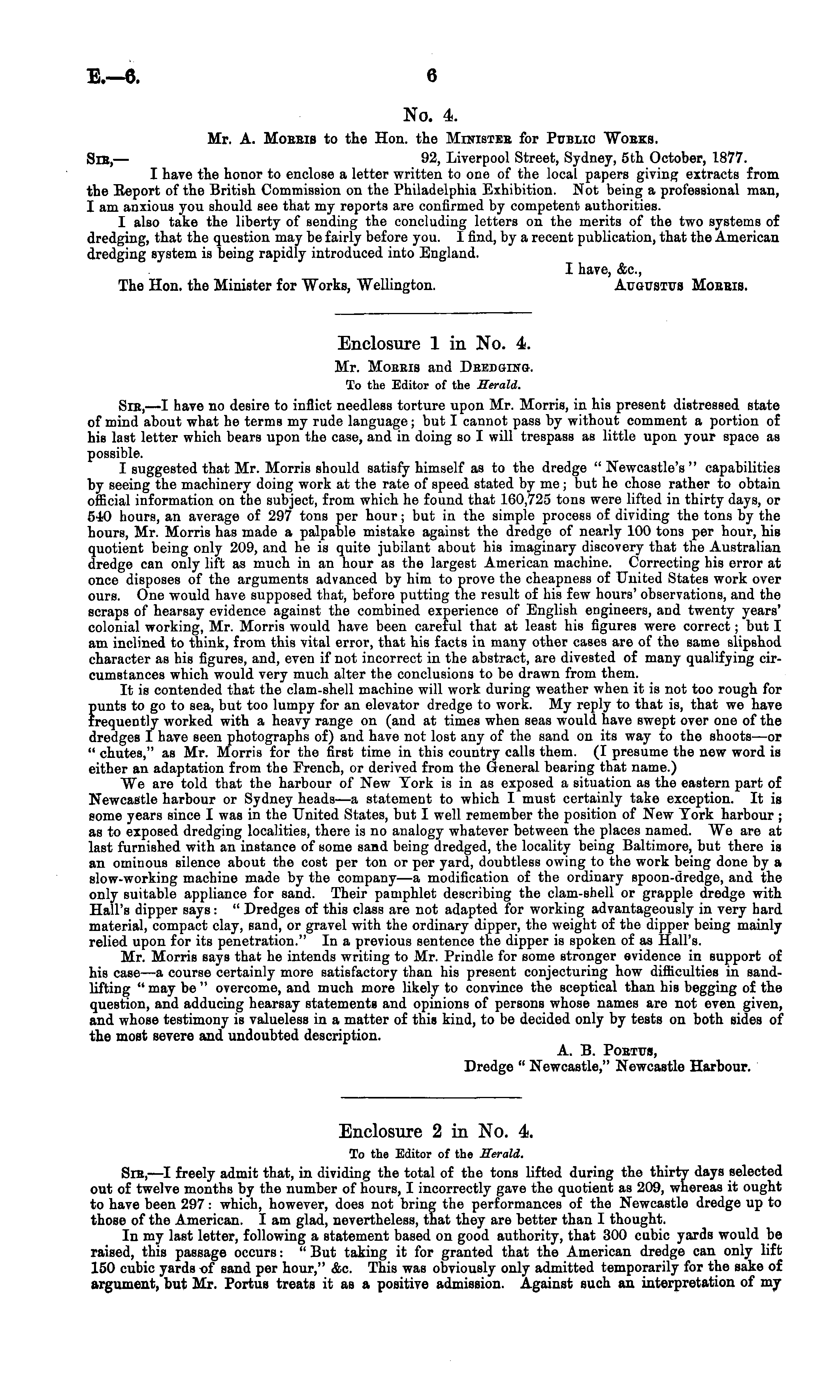No. 4. Mr. A. Moeeis to the Hon. the Ministee for Public Wobks. Sib, — 92, Liverpool Street, Sydney, sth October, 1877. I have the honor to enclose a letter written to one of the local papers giving extracts from the Eeport of the British Commission on the Philadelphia Exhibition. Not being a professional man, I am anxious you should see that my reports are confirmed by competent authorities. I also take the liberty of sending the concluding letters on the merits of the two systems of dredging, that the question may be fairly before you. I find, by a recent publication, that the American dredging system is being rapidly introduced into England. I have, &c, The Hon. the Minister for Works, Wellington. Augustus Moeeis.