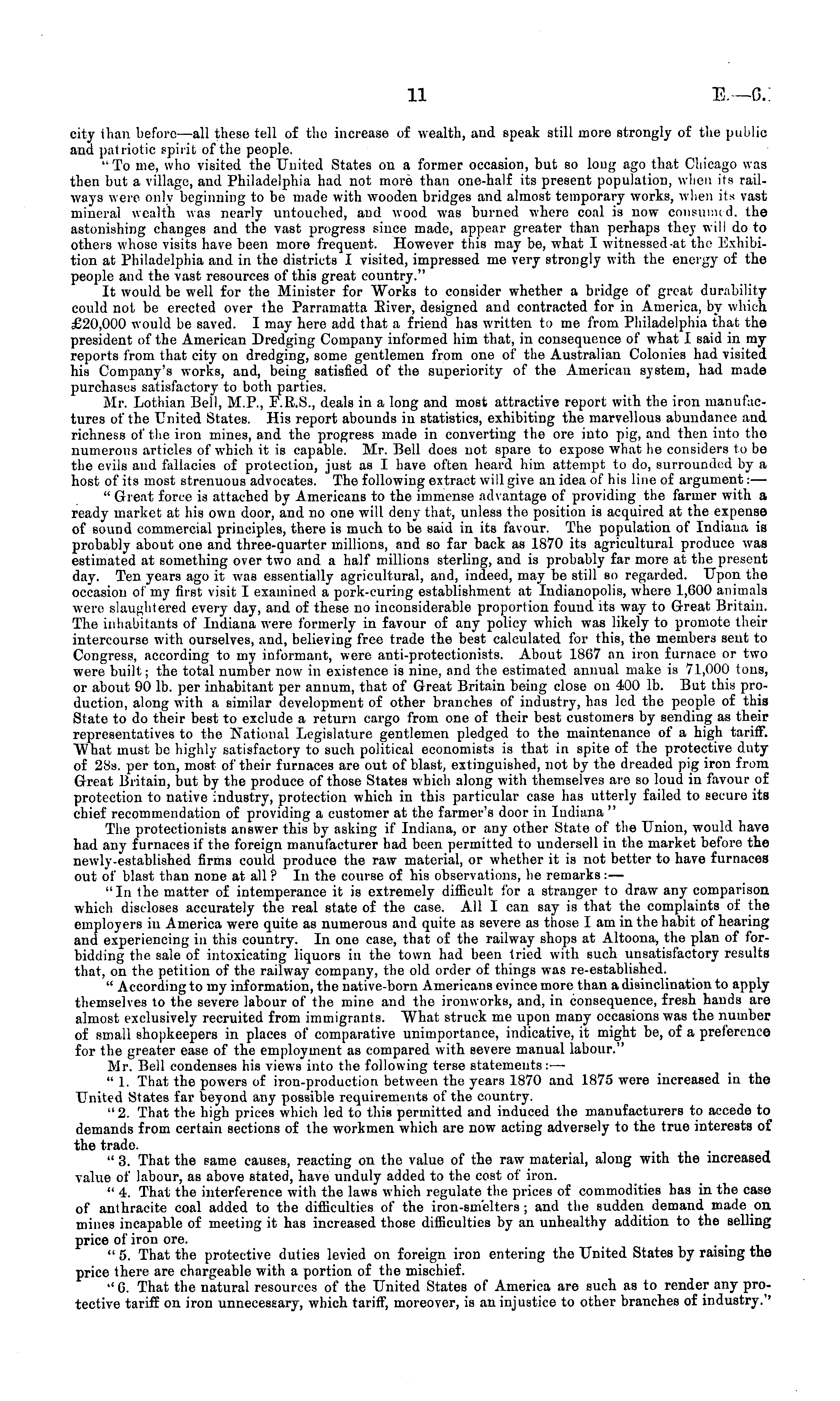 city than before —all these tell of tho increase of wealth, aud speak still more strongly of the public and patriotic spirit of the people. " To me, who visited the United States ou a former occasion, but so long ago that Chicago was then but a village, aud Philadelphia had not more than one-half its present population, when its railways were only beginning to be made with wooden bridges and almost temporary works, when its vast mineral wealth was nearly untouched, and wood was burned where coal is now consumed-, the astonishing changes and the vast progress since made, appear greater than perhaps they will do to others whose visits have been more frequent. However this may be, what 1 witnessed-at the Exhibition at Philadelphia and in the districts I visited, impressed me very strongly with the energy of the people and the vast resources of this great country." It would be well for the Minister for Works to consider whether a bridge of great durability could not be erected over the Parramatta Eiver, designed and contracted for in America, by which £20,000 would be saved. I may here add that a friend has written to me from Philadelphia that the president of the American Dredging Company informed him that, in consequence of what I said in my reports from that city on dredging, some gentlemen from one of the Australian Colonies had visited his Company's works, aud, being satisfied of the superiority of the American system, had made purchases satisfactory to both parties. Mr. Lothian Bell, M.P., F.R.S., deals in a long and most attractive report with the iron manufactures of the United States. His report abounds in statistics, exhibiting the marvellous abundance and richness of the iron mines, and the progress made in converting the ore into pig, and then into the numerous articles of which it is capable. Mr. Bell does not spare to expose what he considers to be the evils and fallacies of protection, just as I have often heard him attempt to do, surrounded by a host of its most strenuous advocates. The following extract will give an idea of his line of argument:— " Great force is attached by Americans to the immense advantage of providing the farmer with a ready market at his own door, and no one will deny that, unless the position is acquired at the expense of sound commercial principles, there is much to be said in its favour. The population of Indiana is probably about one and three-quarter millions, and so far back as 1870 its agricultural produce was estimated at something over two and a half millions sterling, and is probably far more at the present day. Ten years ago it was essentially agricultural, and, indeed, may be still so regarded. Upon the occasion of my first visit I examined a pork-curing establishment at Indianopolis, where 1,600 animals were slaughtered every day, and of these no inconsiderable proportion found its way to Great Britain. The inhabitants of Indiana were formerly in favour of any policy which was likely to promote their intercourse with ourselves, and, believing free trade the best calculated for this, the members sent to Congress, according to my informant, were anti-protectionists. About 1867 an iron furnace or two were built; the total number now in existence is nine, and the estimated annual make is 71,000 tons, or about 90 lb. per inhabitant per annum, that of Great Britain being close on 400 lb. But this production, along with a similar development of other branches of industry, has led the people of this State to do their best to exclude a return cargo from one of their best customers by sending as their representatives to the National Legislature gentlemen pledged to the maintenance of a high tariff. What must be highly satisfactory to such political economists is that in spite of the protective duty of 28s. per ton, most of their furnaces are out of blast, extinguished, not by the dreaded pig iron from Great Britain, but by the produce of those States which along with themselves are so loud in favour of protection to native industry, protection which in this particular case has utterly failed to secure its chief recommendation of providing a customer at the farmer's door in Indiana " The protectionists answer this by asking if Indiana, or any other State of the Union, would have had any furnaces if the foreign manufacturer had been permitted to undersell iv the market before the newly-established firms could produce the raw material, or whether it is not better to have furnaces out of blast than none at all ? In the course of his observations, he remarks:— "In the matter of intemperance it is extremely difficult for a stranger to draw any comparison which discloses accurately the real state of the case. All I can say is that the complaints of the employers iv America were quite as numerous and quite as severe as those I am in the habit of hearing and experiencing in this country. In one case, that of the railway shops at Altoona, the plan of forbidding the sale of intoxicating liquors in the town had been tried with such unsatisfactory results that, on the petition of the railway company, the old order of things was re-established. " According to my information, the native-born Americans evince more than a disinclination to apply themselves to the severe labour of the mine and the ironworks, and, in consequence, fresh hands are almost exclusively recruited from immigrants. What struck me upon many occasions was the number of small shopkeepers in places of comparative unimportance, indicative, it might be, of a preference for the greater ease of the employment as compared with severe manual labour." Mr. Bell condenses his views into the following terse statements: —■ " 1. That the powers of iron-production between the years 1870 and 1875 were increased in the TTnited States far beyond any possible requirements of the country. "2. That the high prices which led to this permitted and induced the manufacturers to accede to demands from certain 