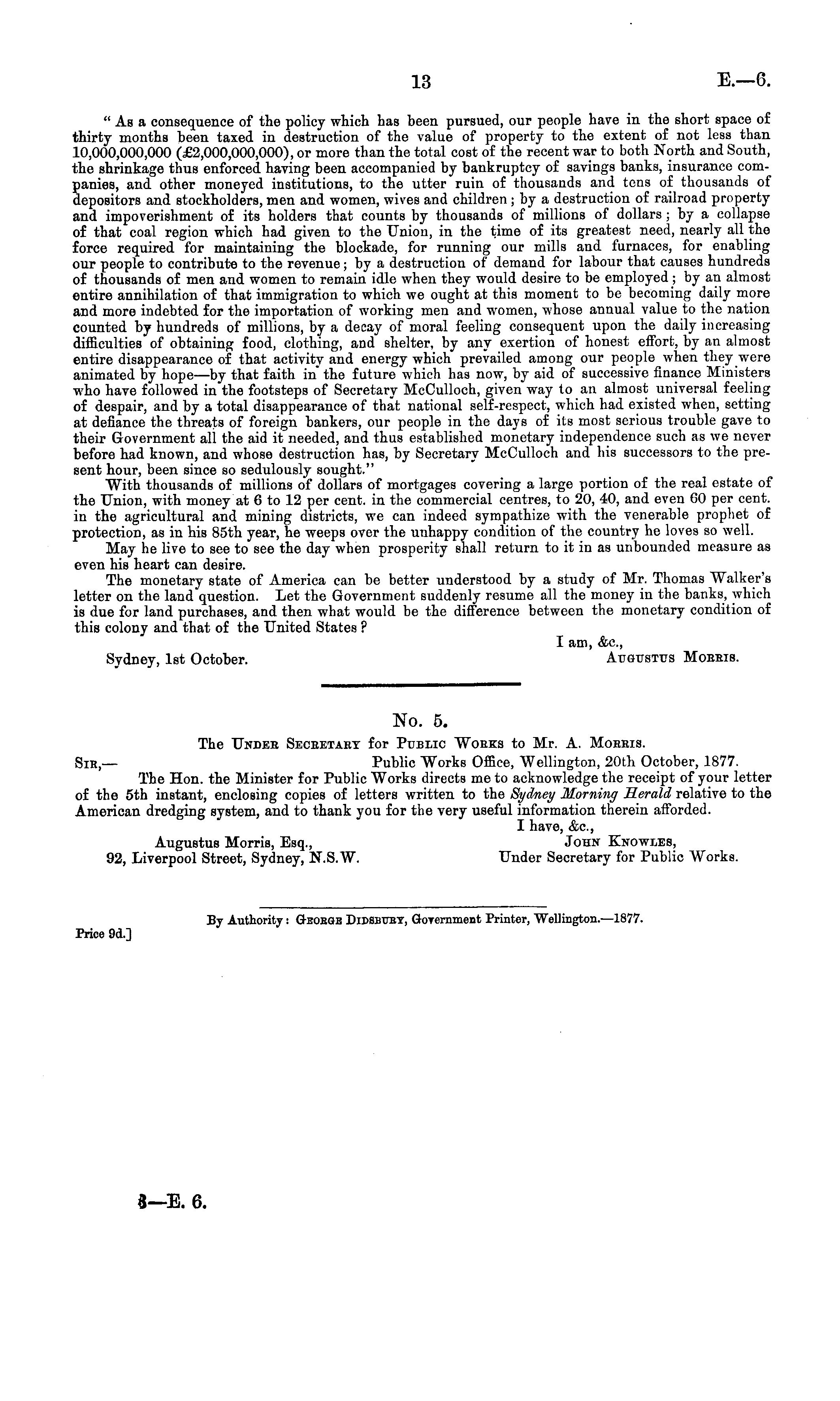 No. 5. The Undee Seceetaet for Public Woeks to Mr. A. Moeeis. Sir — Public Works Office, Wellington, 20th October, 1877. The Hon. the Minister for Public Works directs me to acknowledge the receipt of your letter of the sth instant, enclosing copies of letters written to the Sydney Morning Herald relative to the American dredging system, and to thank you for the very useful information therein afforded. I have, &c, Augustus Morris, Esq., John Knowles, 92, Liverpool Street, Sydney, N.S.W. Under Secretary for Public Works. By Authority: Geobge Didsbttbt, Government Printer, Wellington. —1877. Price 9d.] 3—E. 6.