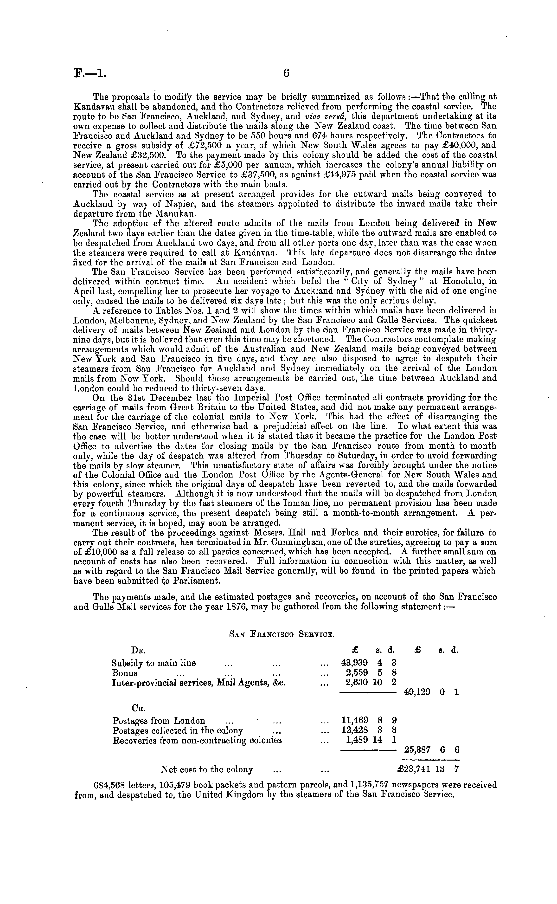 The proposals to modify the service may be briefly summarized as follows : —That the calling at Kandavau shall be abandoned, and the Contractors relieved from performing the coastal service. The route to be i^au Francisco, Auckland, and Sydney, and vice versa, this department undertaking at its own expense to collect and distribute the mails along the New Zealand coast. Tho time between San Francisco and Auckland and Sydney to be 550 hours and 674 hours respectively. The Contractors to receive a gross subsidy of £72,500 a year, of which New South Wales agrees to pay £40,000, and New Zealand £32,500. To the payment made by this colony should be added the cost of the coastal service, at present carried out for £5,000 per aunum, which increases the colony's annual liability on account of the San Francisco Service to £37,500, as against £44,975 paid when the coastal service was carried out by the Contractors with the main boats. The coastal service as at present arranged provides for the outward mails being conveyed to Auckland by way of Napier, and the steamers appointed to distribute the inward mails take their departure from the Manukau. The adoption of the altered route admits of the mails from London being delivered in New Zealand two days earlier than the dates given in the time-table, while the outward mails are enabled to be despatched from Auckland two days, and from all other ports one day, later than was the case when the steamers were required to call at Kandavau. This late departure does not disarrange the dates fixed for the arrival of the mails at San Francisco and London. The San Francisco Service has beeti performed satisfactorily, and generally the mails have been delivered within contract time. An accident which befel the "City of Sydney" at Honolulu, in April last, compelling her to prosecute her voyage to Auckland and Sydney with the aid of one engine only, caused the mails to be delivered six days late; but this was the only serious delay. A reference to Tables Nos. 1 and 2 will show the times within which mails have been delivered hi London, Melbourne, Sydney, and New Zealand by the San Francisco and Galle Services. The quickest delivery of mails between New Zealand and London by the San Francisco Service was made in thirtynine days, but it is believed that even this time may be shortened. The Contractors contemplate making arrangements which would admit of the Australian and New Zealand mails being conveyed between New York and San Francisco in five days, and they are also disposed to agree to despatch their steamers from San Francisco for Auckland and Sydney immediately on the arrival of the London mails from New York. Should these arrangements be carried out, the time between Auckland and London could be reduced to thirty-seven days. On the 31st December last the Imperial Post Office terminated all contracts providing for the carriage of mails from Great Britain to the United States, and did not make any permanent arrangement for the carriage of tho colonial mails to New York. This had the effect of disarranging the San Francisco Service, and otherwise had a prejudicial effect on the line. To what extent this was tho case will be better understood when it is stated that it became the practice for the London Post Office to advertise the dates for closing mails by the San Francisco route from month to month only, while the day of despatch was altered from Thursday to Saturday, in order to avoid forwarding the mails by slow steamer. This unsatisfactory state of affairs was forcibly brought under the notice of the Colonial Office and the London Post Office by the Agents-General for New South Wales and this colony, since which the original days of despatch have been reverted to, and the mails forwarded by powerful steamers. Although it is now understood that the mails will be despatched from London every fourth Thursday by the fast steamers of the Inman line, no permanent provision has been made for a continuous service, the present despatch being still a month-to-month arrangement. A permanent service, it is hoped, may soon be arranged. The result of the proceedings against Messrs. Hall and Forbes and their sureties, for failure to carry out their contracts, has terminated in Mr. Cunningham, one of the sureties, agreeing to pay a sum of £10,000 as a full release to all parties concerned, which has been accepted. A further small sum on account of costs has also been recovered. Full information in connection with this matter, as well as with regard to the San Francisco Mail Service generally, will be found in the printed papers which have been submitted to Parliament. The payments made, and the estimated postages and recoveries, on account of the San Francisco and Galle Mail services for the year 1876, may be gathered from the following statement: — San Feancisco Seevice. Db. £ s. d. £ s. d. Subsidy to main line ... ... ... 43,939 4 3 Bonus ... ... ... ... 2,559 5 8 Inter-provincial services, Mail Agents, &c. ... 2,630 10 2 49,129 0 1 Cr. Postages from London ... ■ ... ... 11,469 8 9 Postages collected in the colony ... ... 12,428 3 8 Eecoveries from non-contracting colonies ... 1,489 14 1 25,387 6 G Net cost to the colony ... ... £23,741 13 7 684,568 letters, 105,479 book packets and pattern parcels, and 1,135,757 newspapers were received from, and despatched to, the United Kingdom by the steamers of the San Francisco Service.