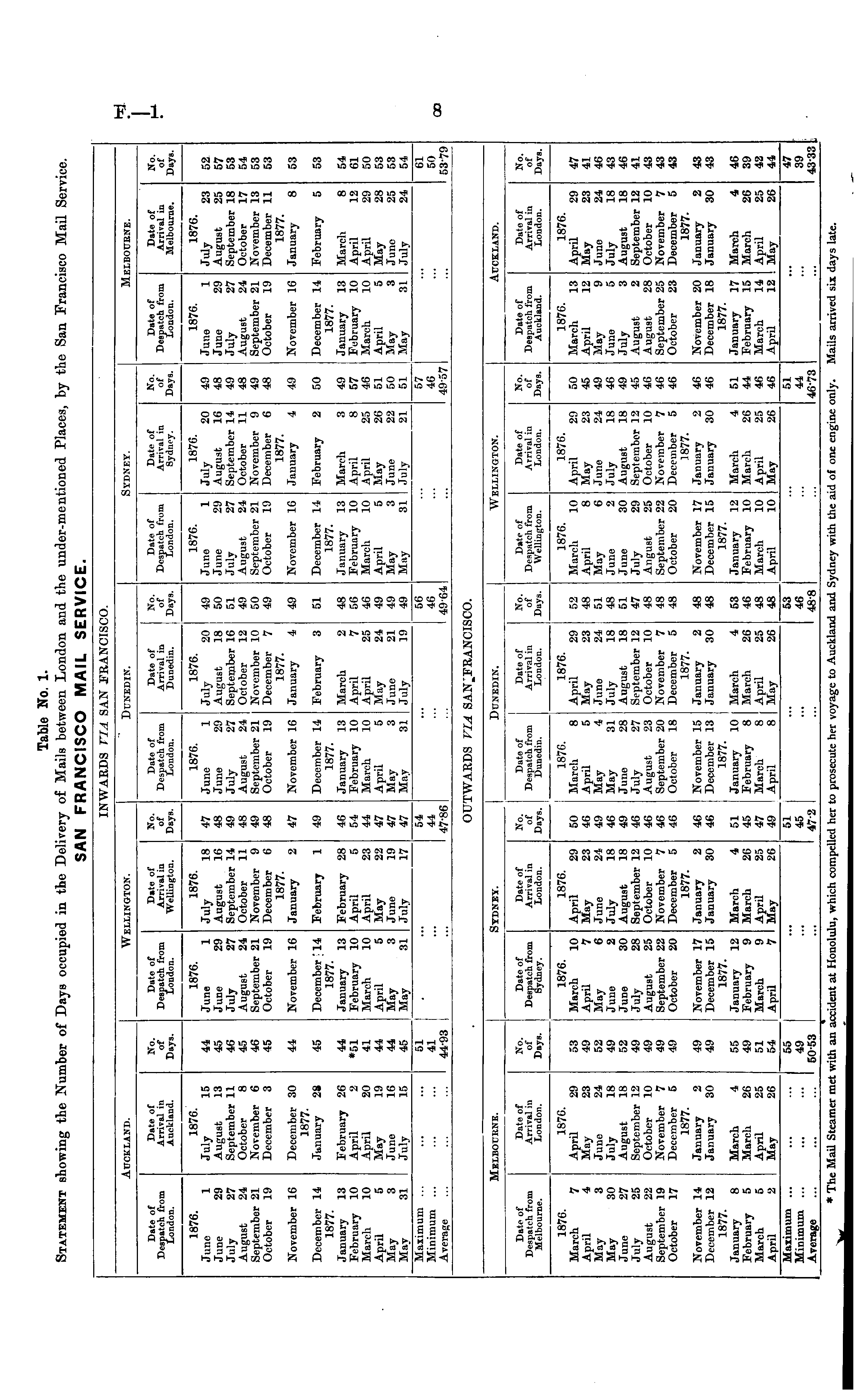 Melbourne. Sydney. Dunedin. Wellington. Auckland. Date of Despatch from Melbourne. Date of Arrival in London. No. of Days. Date of Despatch from Sydney. Date of Arrival in London. No. of Days. Date of Despatch from Dunedin. Date of Arrival in London. No. of Days. Date of Despatch from Wellington. 1876. March 10 April 8 May 6 June 2 June 30 July 29 Angust 25 September 22 October 20 Date of Arrival in London. No. of Days. Date of Despatch from Auckland. Date of Arrival in London. No. of Days. 1876. March 7 April 4 May 3 May 30 June 27 July 25 August 22 September 19 October 17 1876. April 29 May 23 June 24 July 18 August 18 September 12 October 10 November 7 December 5 1877. January 2 January 30 58 40 52 49 .",2 49 48 4!) 1876. March 10 April 7 May 6 Juno 2 June 30 July 28 August 25 September 22 October 20 1876. April 29 May 23 June 24 July 18 August 18 September 12 October 10 November 7 December 5 1877. January 2 January 30 50 46 49 46 49 46 46 46 46 187G. March 8 April 5 May 4 May 31 June 28 July 27 August 23 September 20 October 18 1876. April 29 May 23 Juno 24 July 18 August 18 September 12 October 10 November 7 December 5 1877. January 2 January 30 52 48 51 48 51 47 48 48 48 1870. April 29 May 23 June 24 July 18 August 18 September 12 October 10 November 7 December 5 1877. January 2 January 30 50 45 49 46 49 45 46 46 46 1876. March 13 April 12 May 9 June 5 July 3 August 2 August 28 September 25 October 23 1870. April 29 May 23 June 24 July 18 August 18 September 12 October 10 November 7 December 5 1877. January 2 January 30 47 41 46 43 46 41 43 43 43 November 14 December 12 1877. January 8 February 5 March 5 April 2 J9 48 November 17 December 15 1877. January 12 February 9 March 9 April 7 46 46 November 15 December 13 1877. January 10 February 8 March 8 April 8 48 48 November 17 December 15 1877. January 12 February 10 March 10 April 10 46 46 November 20 December 18 1877. January 17 February 15 March 14 April 12 43 43 Marcli 4 March 26 April 25 May 26 56 48 51 64 March 4 March 26 April 25 May 26 51 45 47 49 March 4 March 26 April 25 May 26 53 46 48 48 March 4 March 26 April 25 May 26 51 44 46 46 March 4 March 26 April 25 May 26 46 39 42 44 Maximum ... Minimum ... Average 55 49 50-53 51 45 472 53 46 48-8 51 44 46-73 47 39 43-33 * The Mail Steamer met with an accident at Honolulu, which compelled her to prosecute her voyage to Auckland and Sydney with the aid of one engine only. Mails arrived six days late.