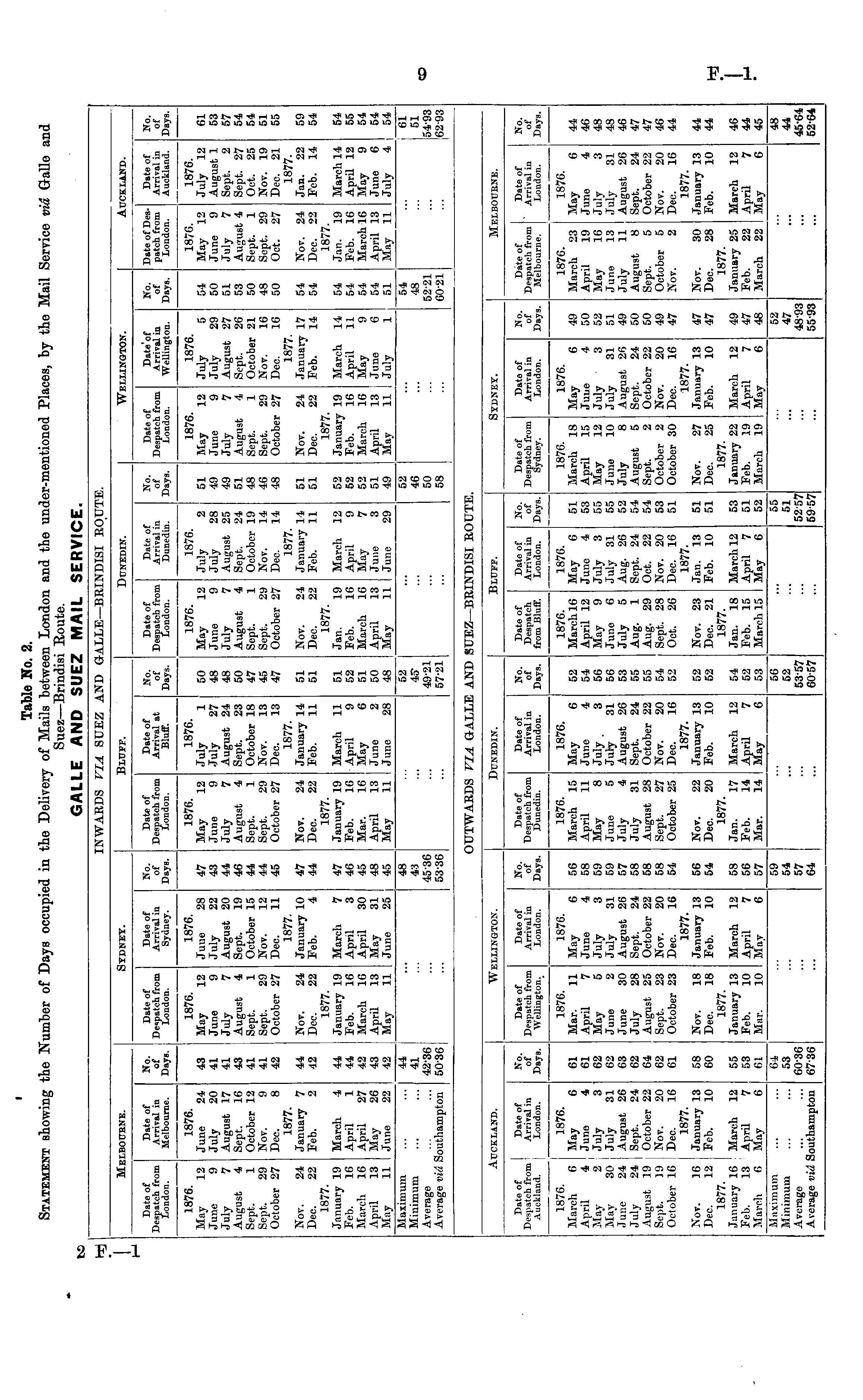 INWARDS VIA SUEZ AND GALLE—BRINDISI ROUTE. H Melbourne. Sydney. Bluff. Dunedin. Wellington. Auckland. Date of Despatch from London. Date of Arrival in Melbourne. No. of Days. Date of Despatch from London. Date of Arrival in Sydney. 1876. June 28 July 22 August 20 Sept. 19 October 15 Nov. 12 Dec. 11 1877. No. of Days. Date of Despatch from London. Date of Arrival at Bluff. No. of Days. Date of Despatch from London. Date of Arrival in Dunedin. No. of Days. Date of Despatch from London. Date'of Arrival in Wellington. No. of Days. Date of Despatch from London. Date of Arrival in Auckland. No. of Days. 1876. May 12 June 9 July 7 August 4 Sept. 1 Sept. 29 October 27 1876. June 24 July 20 August 17 Sept. 16 October 12 Nov. 9 Dee. 8 1877. 43 41 41 43 41 41 42 1876. May 12 June 9 July 7 August 4 Sept. 1 Sept. 29 October 27 47 43 44 46 44 44 45 1876. May 12 June 9 July 7 August 4 Sept. 1 Sept. 29 October 27 1876. July 1 July 27 August 24 Sept. 23 October 18 Nov. 13 Dec. 13 1877. 50 48 48 50 47 45 47 1876. May 12 June 9 July 7 August 4 Sept. 1 Sept. 29 October 27 1876. July 2 July 28 August 25 Sept. 24 October 19 Nov. 14 Dee. 14 1877. January 14 Feb. 11 51 49 49 51 48 46 48 1876. May 12 June 9 July 7 August 4 Sept. 1 Sept. 29 October 27 1876. July 5 July 29 August 27 Sept. 26 October 21 Nov. 16 Dec. 16 1877. January 17 Feb. 14 64 50 51 53 50 48 50 1876. May 12 June 9 July 7 August 4 Sept. 1 Sept. 29 Oct. 27 1876. July 12 August 1 Sept. 2 Sept. 27 Oct. 25 Nov. 19 Dec. 21 1877. Jan. 22 Feb. 14 01 58 57 51 54 61 56 Nov. 24 Dec. 22 1877. January 19 Feb. 10 March 16 April 13 May 11 January 7 Feb. ' 2 44 42 Nov. 24 Dec. 22 1877. January 19 Feb. 16 March 16 April 13 May 11 January 10 Feb. 4 47 44 Nov. 24 Dec. 22 1877. January 14 Feb. 11 51 51 Nov. 24 Dec. 22 1877. 51 51 Nov. 24 Dec. 22 1877. January 19 Feb. 16 March 16 April 13 May 11 54 54 Nov. 24 Dec. 22 1877. Jan. 19 Feb. 16 March 16 April 13 May 11 50 51 March 4 April 1 April 27 May 26 June 22 44 44 42 43 42 March 7 April 3 April 30 May 31 June 25 47 46 45 48 45 January 19 Feb. ' 10 Mar. 16 April 13 May 11 March 11 April 9 May 6 June 2 June 28 51 52 51 50 48 Jan. 19 Feb. 16 March 10 April 13 May 11 March 12 April 9 May 7 June 3 June 29 52 52 52 51 49 March 14 April 11 May 9 Juno 6 July 1 54 54 54 54 51 54 48 52-21 60-21 March 14 April 12 May 9 June 6 July 4 51 56 6 > 64 64 Maximum Minimum Average Average via Southampton 44 41 42-36 50-30 48 43 45-30 53-36 52 45-49-21 57-21 52 46 60 58 51 54-93 62-93