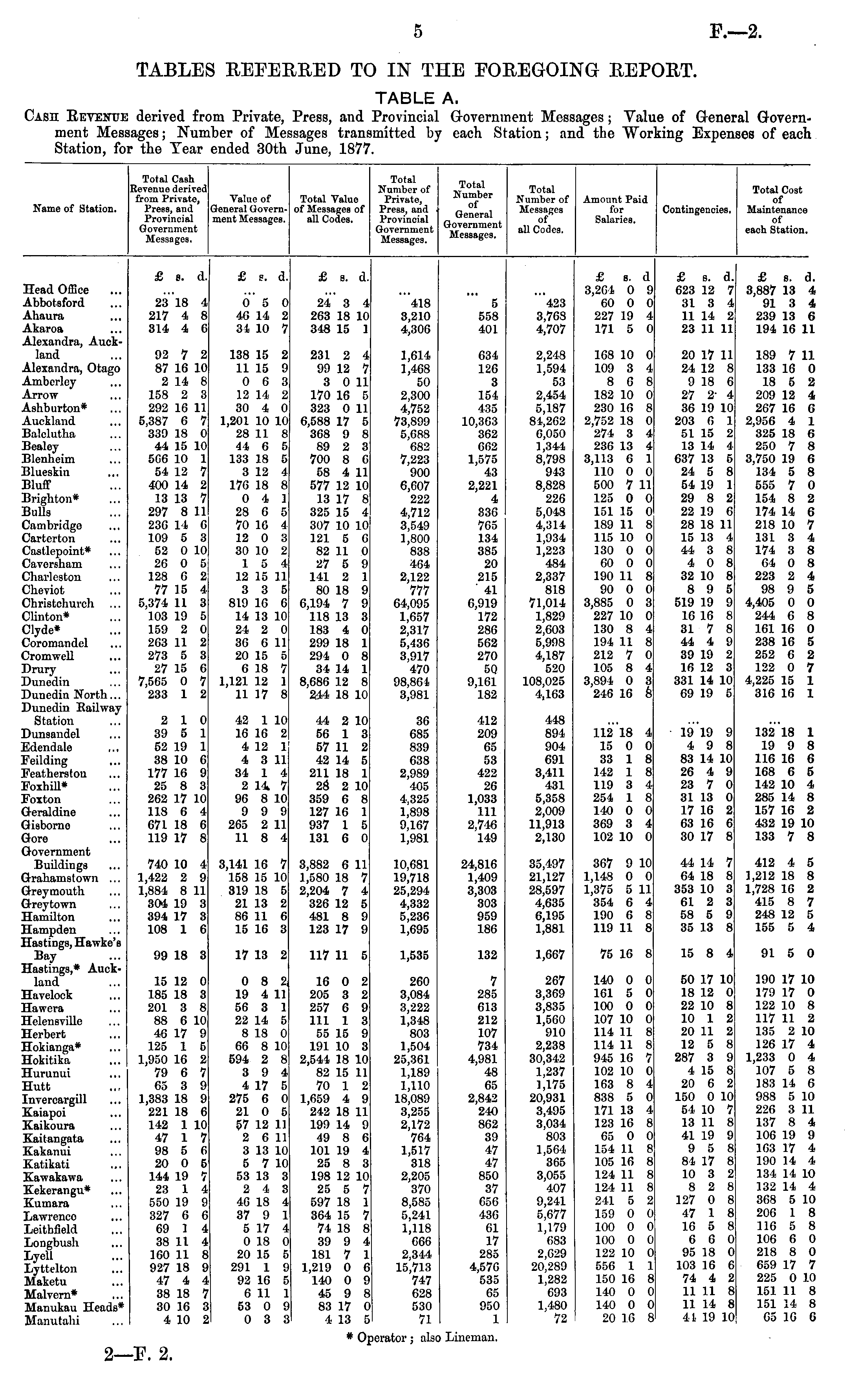 TABLES REFERRED TO IN THE FOREGOING REPORT. TABLE A. CASH REVENUE derived from Private, Press, and Provincial Government Messages; Value of General Government Messages; Number of Messages transmitted by each Station; and the Working Expenses of each Station, for the Tear ended 30th June, 1877.