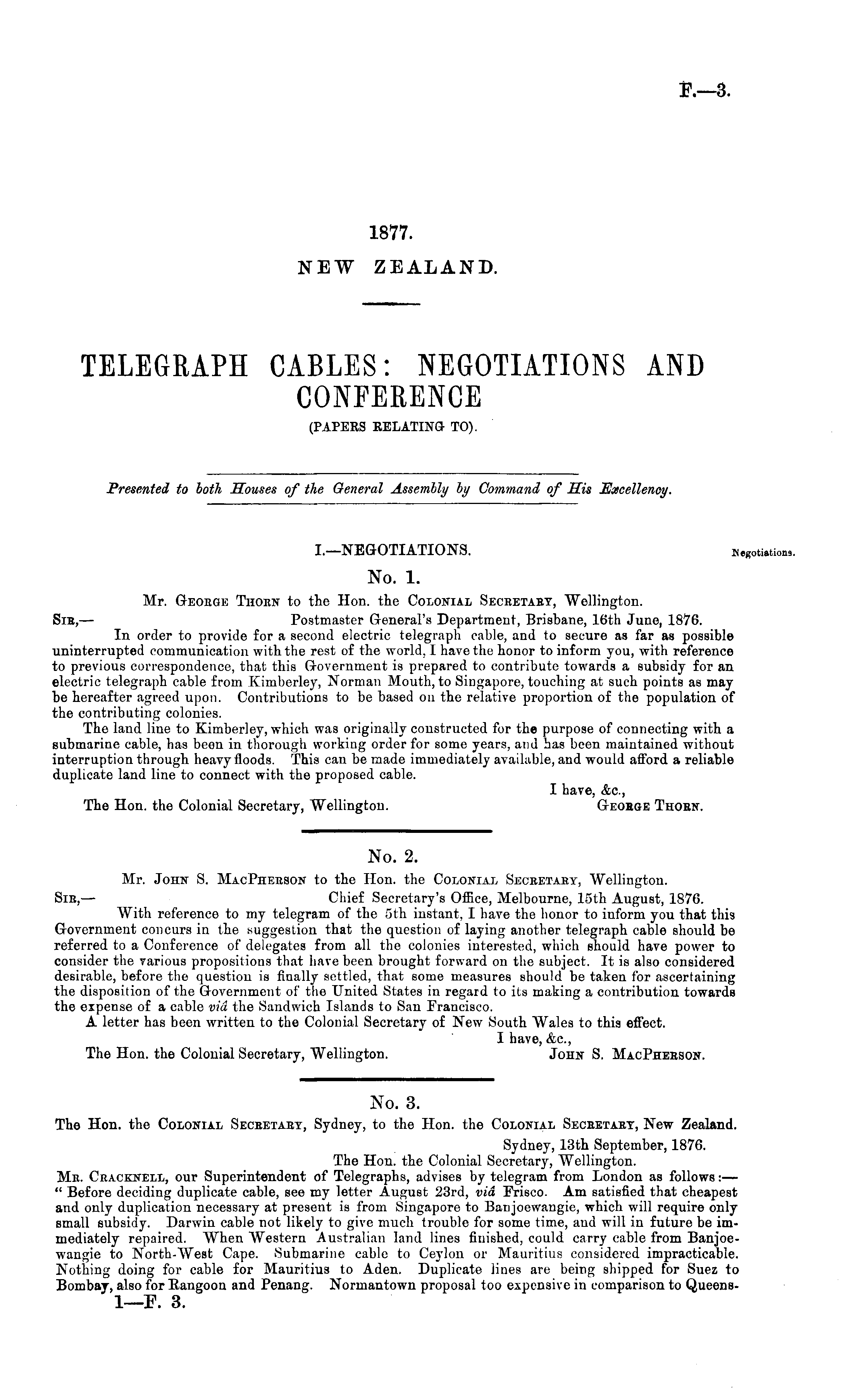 I.—NEGOTIATIONS. a, No. 1. Mr. George Thorn to the Hon. the Colonial Secretaey, Wellington. Sir, — Postmaster General's Department, Brisbane, 16th June, 1876. In order to provide for a second electric telegraph cable, and to secure as far as possible uninterrupted communication with the rest of the world. I have the honor to inform you, with reference to previous correspondence, that this Government is prepared to contribute towards a subsidy for an electric telegraph cable from Kimberley, Norman Mouth, to Singapore, touching at such points as may be hereafter agreed upon. Contributions to be based on the relative proportion of the population of the contributing colonies. The land line to Kimberley, which was originally constructed for the purpose of connecting with a submarine cable, has been in thorough working order for some years, and has been maintained without interruption through heavy floods. This can be made immediately available, and would afford a reliable duplicate land line to connect with the proposed cable. I have, &c, The Hon. the Colonial Secretary, Wellington. George Thorn.