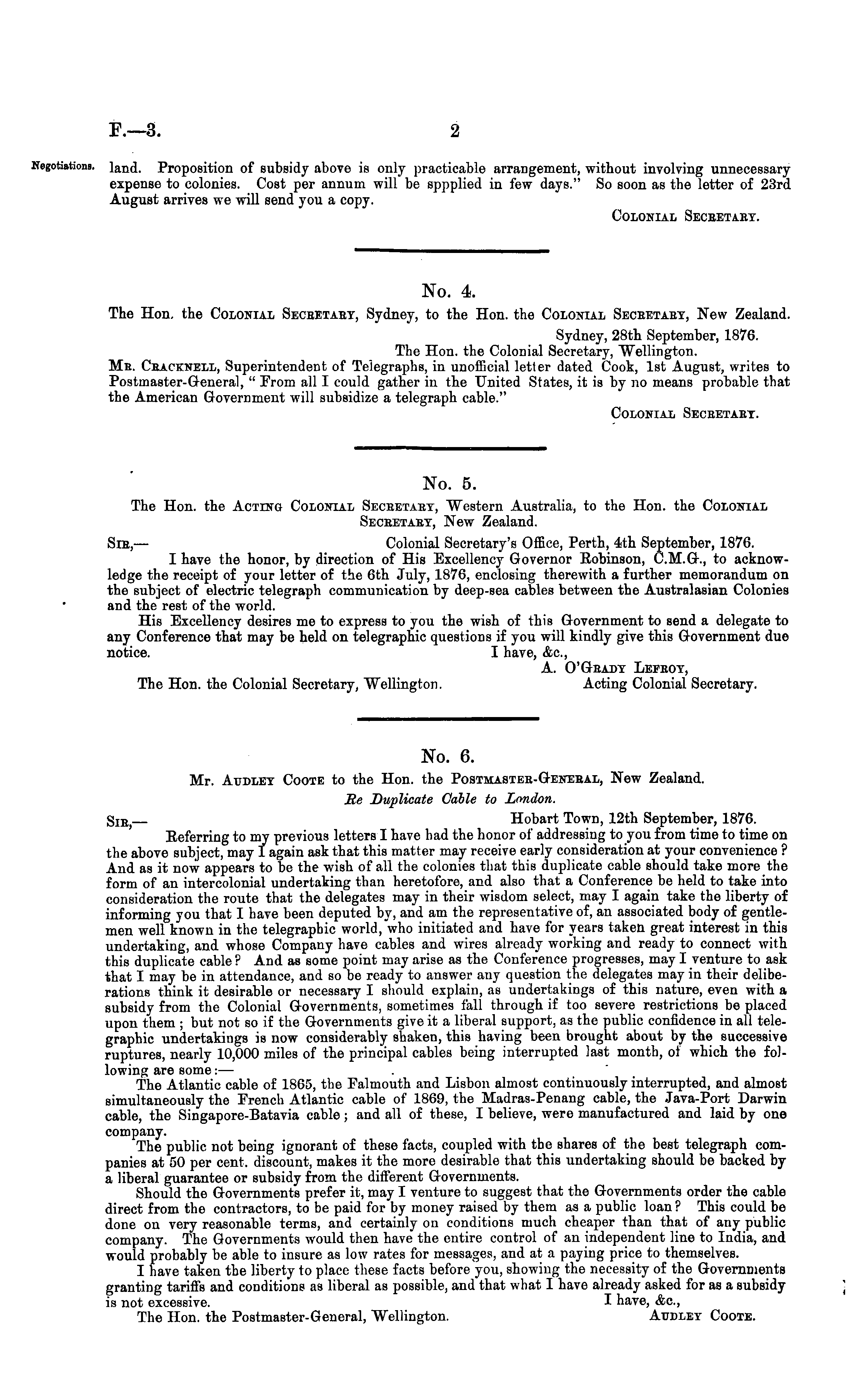 No. 6. Mr. Audley Coote to the Hon. the Postmaster-General, New Zealand. Re Duplicate Cable to London. S IE; Hobart Town, 12th September, 1876. Referring to my previous letters I have had the honor of addressing to you from time to time on the above subject, may I again ask that this matter may receive early consideration at your convenience ? And as it now appears to be the wish of all the colonies that this duplicate cable should take more the form of an intercolonial undertaking than heretofore, and also that a Conference be held to take into consideration the route that the delegates may in their wisdom select, may I again take the liberty of informing you that I have been deputed by, and am the representative of, an associated body of gentlemen well known in the telegraphic world, who initiated and have for years taken great interest in this undertaking, and whose Company have cables and wires already working and ready to connect with this duplicate cable ? And as some point may arise as the Conference progresses, may I venture to ask that I may be in attendance, and so be ready to answer any question the delegates may in their deliberations think it desirable or necessary I should explain, as undertakings of this nature, even with a subsidy from the Colonial Governments, sometimes fall through if too severe restrictions be placed upon them ; but not so if the Governments give it a liberal support, as the public confidence in all telegraphic undertakings is now considerably shaken, this having been brought about by the successive ruptures, nearly 10,000 miles of the principal cables being interrupted last month, of which the following are some: — The Atlantic cable of 1865, the Falmouth and Lisbon almost continuously interrupted, and almost simultaneously the French Atlantic cable of 1869, the Madras-Penang cable, the Java-Port Darwin cable, the Singapore-Batavia cable; and all of these, I believe, were manufactured and laid by one company. The public not being ignorant of these facts, coupled with the shares of the best telegraph companies at 50 per cent, discount, makes it the more desirable that this undertaking should be backed by a liberal guarantee or subsidy from the different Governments. Should the Governments prefer it, may I venture to suggest that the Governments order the cable direct from the contractors, to be paid for by money raised by them as a public loan ? This could be done on very reasonable terms, and certainly on conditions much cheaper than that of any public company. The Governments would then have the entire control of an independent line to India, and would probably be able to insure as low rates for messages, and at a paying price to themselves. I have taken the liberty to place these facts before you, showing the necessity of the Governments granting tariff's and conditions as liberal as possible, and that what I have already asked for as a subsidy is not excessive. I have, &c., The Hon. the Postmaster-General, Wellington. Audley Coote.