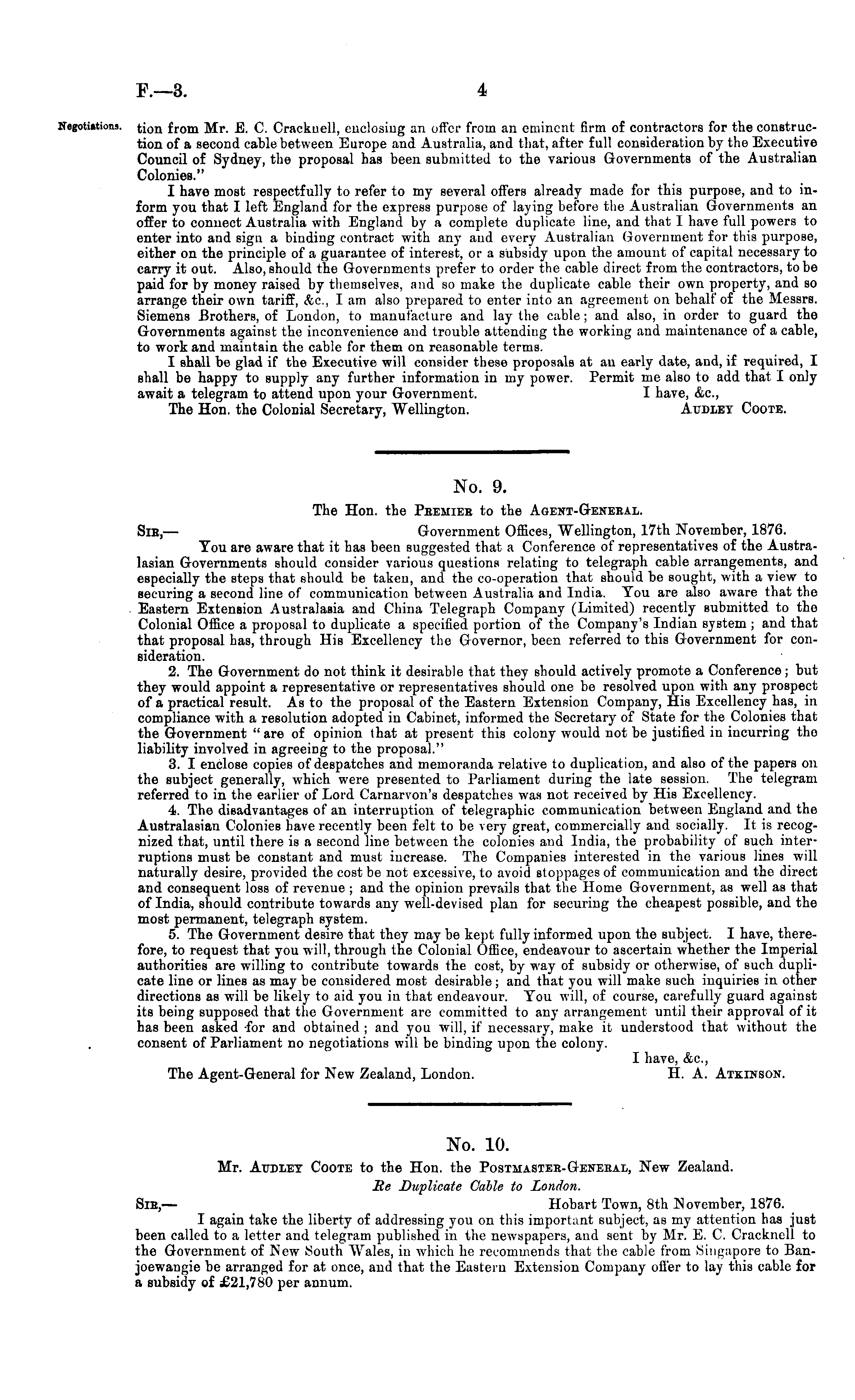 No. 9. The Hon. the Premier to the Agent-General. Sir,— Government Offices, Wellington, 17th November, 1876. You are aware that it has been suggested that a Conference of representatives of the Australasian Governments should consider various questions relating to telegraph cable arrangements, and especially the steps that should be taken, and the co-operation that should be sought, with a view to securing a second line of communication between Australia and India. Tou are also aware that the Eastern Extension Australasia and China Telegraph Company (Limited) recently submitted to tho Colonial Office a proposal to duplicate a specified portion of the Company's Indian system ; and that that proposal has, through His Excellency the Governor, been referred to this Government for consideration. 2. The Government do not think it desirable that they should actively promote a Conference; but they would appoint a representative or representatives should one be resolved upon with any prospect of a practical result. As to the proposal of the Eastern Extension Company, His Excellency has, in compliance with a resolution adopted in Cabinet, informed the Secretary of State for the Colonies that the Government " are of opinion that at present this colony would not be justified in incurring tho liability involved in agreeing to the proposal." 3. I enclose copies of despatches and memoranda relative to duplication, and also of the papers on the subject generally, which were presented to Parliament during the late session. The telegram referred to in the earlier of Lord Carnarvon's despatches was not received by His Excellency. 4. Tho disadvantages of an interruption of telegraphic communication between England and tho Australasian Colonies have recently been felt to be very great, commercially and socially. It is recognized that, until there is a second line between the colonies and India, the probability of such interruptions must be constant and must increase. The Companies interested in the various lines will naturally desire, provided the cost be not excessive, to avoid stoppages of communication and the direct and consequent loss of revenue ; and the opinion prevails that the Home Government, as well as that of India, should contribute towards any well-devised plan for securing the cheapest possible, and the most permanent, telegraph system. 5. The Government desire that they may be kept fully informed upon the subject. I have, therefore, to request that you will, through the Colonial Office, endeavour to ascertain whether the Imperial authorities are willing to contribute towards the cost, by way of subsidy or otherwise, of such duplicate line or lines as may be considered most desirable; and that you will make such inquiries in other directions as will be likely to aid you in that endeavour. Tou will, of course, carefully guard against its being supposed that the Government are committed to any arrangement until their approval of it has been asked for and obtained ; and you will, if necessary, make it understood that without the consent of Parliament no negotiations will be binding upon the colony. I have, &c, The Agent-General for New Zealand, London. H. A. Atkinson.