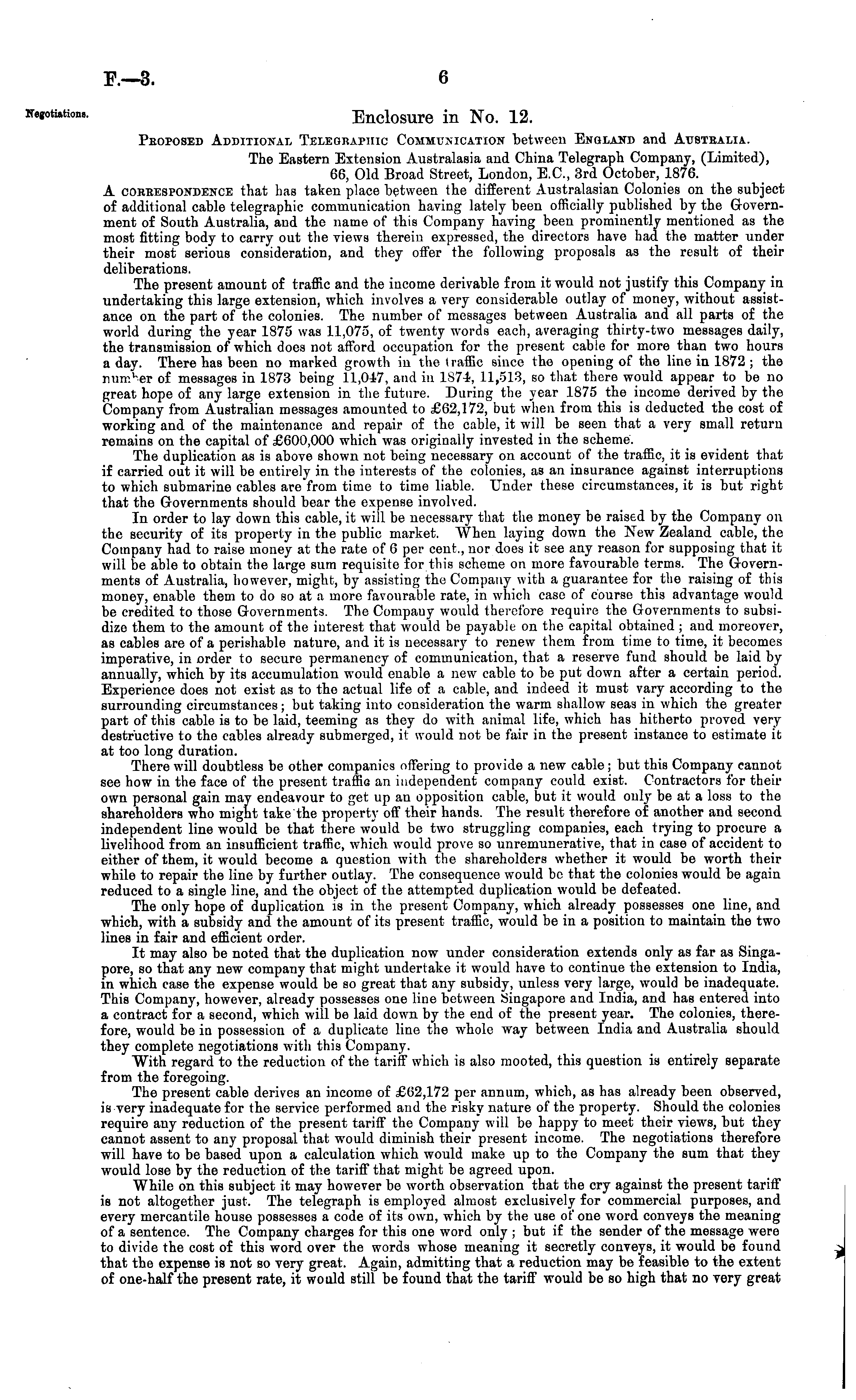 Enclosure in No. 12. Proposed Additional Telegbapiiic Communication between England and Australia. The Eastern Extension Australasia and China Telegraph Company, (Limited), 66, Old Broad Street, London, E.C., 3rd October, 1876. A correspondence that has taken place between the different Australasian Colonies on the subject of additional cable telegraphic communication having lately been officially published by the Government of South Australia, and the name of this Company having been prominently mentioned as the most fitting body to carry out the views therein expressed, the directors have had the matter under their most serious consideration, and they offer the following proposals as the result of their deliberations. The present amount of traffic and the income derivable from it would not justify this Company in undertaking this large extension, which involves a very considerable outlay of money, without assistance on the part of the colonies. The number of messages between Australia and all parts of the world during the year 1875 was 11,075, of twenty words each, averaging thirty-two messages daily, the transmission of which does not afford occupation for the present cable for more than two hours a day. There has been no marked growth in the traffic since the opening of the line in 1872 ; the number of messages in 1873 being 11,047, and in 1874, 11,513, so that there would appear to be no great hope of any large extension in the future. During the year 1875 the income derived by the Company from Australian messages amounted to £62,172, but when from this is deducted the cost of working and of the maintenance and repair of the cable, it will be seen that a very small return remains on the capital of £600,000 which was originally invested in the scheme. The duplication as is above shown not being necessary on account of the traffic, it is evident that if carried out it will be entirely in the interests of the colonies, as an insurance against interruptions to which submarine cables are from time to time liable. Under these circumstances, it is but right that the Governments should bear the expense involved. In order to lay down this cable, it will be necessary that the money be raised by the Company on the security of its property in the public market. When laying down the New Zealand cable, the Company had to raise money at the rate of 6 per cent., nor does it see any reason for supposing that it will be able to obtain the large sum requisite for this scheme on more favourable terms. The Governments of Australia, however, might, by assisting the Company with a guarantee for the raising of this money, enable them to do so at a more favourable rate, in which case of course this advantage would be credited to those Governments. The Compauy would therefore require the Governments to subsidize them to the amount of the interest that would be payable on the capital obtained ; aud moreover, as cables are of a perishable nature, and it is necessary to renew them from time to time, it becomes imperative, in order to secure permanency of communication, that a reserve fund should be laid by annually, which by its accumulation would enable a new cable to be put down after a certain period. Experience does not exist as to the actual life of a cable, and indeed it must vary according to the surrounding circumstances; but taking into consideration the warm shallow seas in which the greater part of this cable is to be laid, teeming as they do with animal life, which has hitherto proved very destructive to the cables already submerged, it would not be fair in the present instance to estimate it at too long duration. There will doubtless be other companies offering to provide a new cable ; but this Company cannot see how in the face of the present traffiG an independent company could exist. Contractors for their own personal gain may endeavour to get up an opposition cable, but it would only be at a loss to the shareholders who might take the property off their hands. The result therefore of another and second independent line would be that there would be two struggling companies, each trying to procure a livelihood from an insufficient traffic, which would prove so unremunerative, that in case of accident to either of them, it would become a question with the shareholders whether it would be worth their while to repair the line by further outlay. The consequence would be that the colonies would be again reduced to a single line, and the object of the attempted duplication would be defeated. The only hope of duplication is in the present Company, which already possesses one line, and which, with a subsidy and the amount of its present traffic, would be in a position to maintain the two lines in fair and efficient order. It may also be noted that the duplication now under consideration extends only as far as Singapore, so that any new company that might undertake it would have to continue the extension to India, in which case the expense would be so great that any subsidy, unless very large, would be inadequate. This Company, however, already possesses one line between Singapore and India, and has entered into a contract for a second, which will be laid down by the end of the present year. The colonies, therefore, would be in possession of a duplicate line the whole way between India and Australia should they complete negotiations with this Company. With regard to the reduction of the tariff which is also mooted, this question is entirely separate from the foregoing. The present cable derives an income of £62,172 per annum, which, as has already been observed, is very inadequate for the service performed and the risky nature of the property. Should the colonies require any reduction of the present tariff the Company will be happy to meet their views, but they cannot assent to any proposal that would diminish their present income. The negotiations therefore will have to be based upon a calculation whi