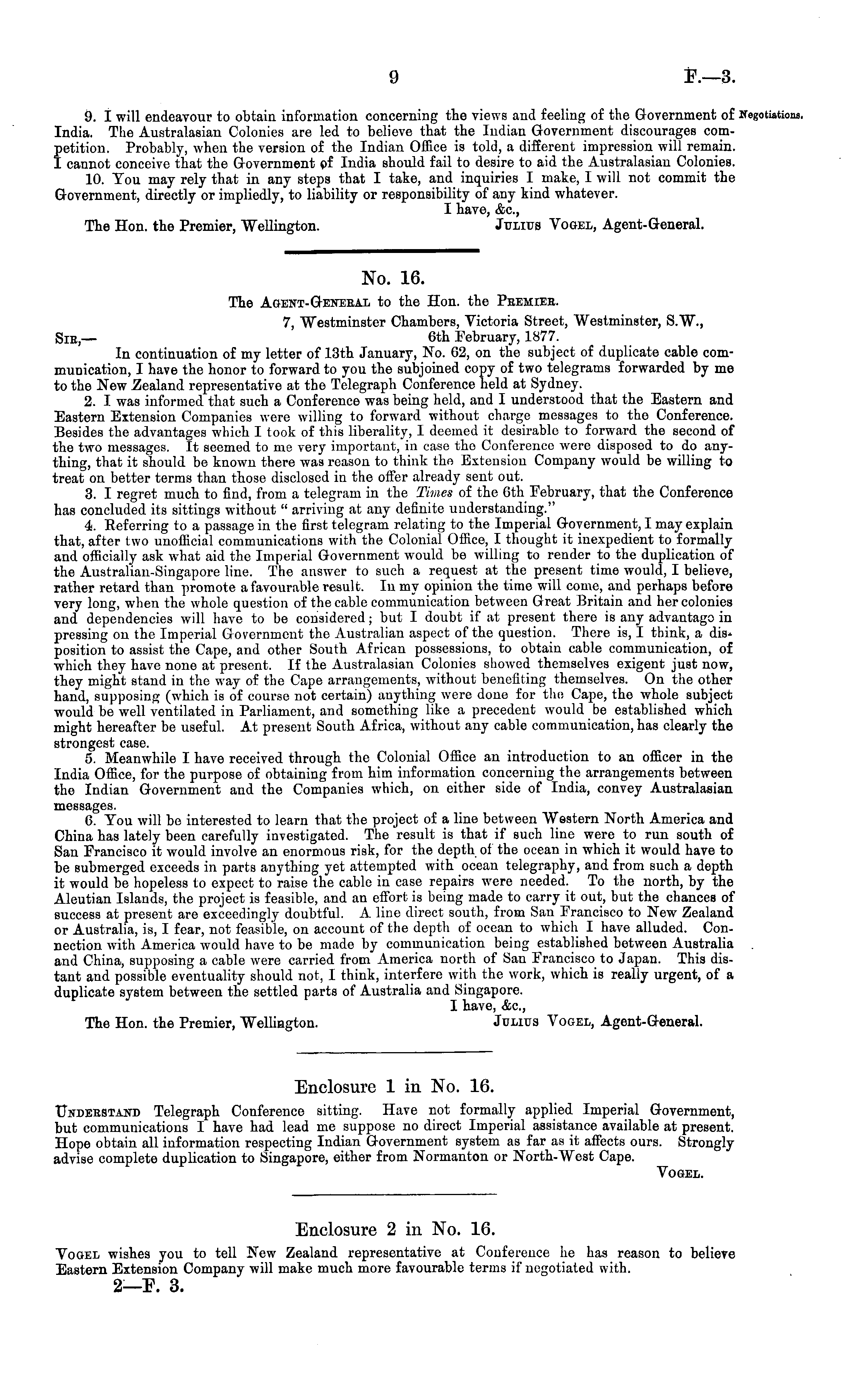 No. 16. The Agent-General to the Hon. the Premier. 7, Westminster Chambers, Victoria Street, Westminster, S.W., Sir,— 6th February, 1877. In continuation of my letter of 13th January, No. 62, on the subject of duplicate cable communication, I have the honor to forward to you the subjoined copy of two telegrams forwarded by me to the New Zealand representative at the Telegraph Conference held at Sydney. 2. I was informed that such a Conference was being held, and I understood that the Eastern and Eastern Extension Companies were willing to forward without charge messages to the Conference. Besides the advantages which I took of this liberality, I deemed it desirable to forward the second of tho two messages. It seemed to me very important, in case tho Conference were disposed to do anything, that it should be known there was reason to think tho Extension Company would be willing to treat on better terms than those disclosed in the offer already sent out. 3. I regret much to find, from a telegram in the Times of the 6th February, that the Conference has concluded its sittings without " arriving at any definite understanding." 4. Referring to a passage in the first telegram relating to the Imperial Government, I may explain that, after two unofficial communications with the Colonial Office, I thought it inexpedient to formally and officially ask what aid the Imperial Government would be willing to render to the duplication of the Australian-Singapore line. The answer to such a request at the present time would, I believe, rather retard than promote a favourable result. In my opinion the time will come, and perhaps before very long, when the whole question of the cable communication between Great Britain and her colonies and dependencies will have to be considered; but I doubt if at present there is any advantage in pressing on the Imperial Government the Australian aspect of the question. There is, I think, a disposition to assist the Cape, and other South African possessions, to obtain cable communication, of which they have none at present. If the Australasian Colonies showed themselves exigent just now, they might stand in the way of the Cape arrangements, without benefiting themselves. On the other hand, supposing (which is of course not certain) anything were done for the Cape, the whole subject would be well ventilated in Parliament, and something like a precedent would be established which might hereafter be useful. At present South Africa, without any cable communication, has clearly the strongest case. 5. Meanwhile I have received through tho Colonial Office an introduction to an officer in the India Office, for the purpose of obtaining from him information concerning the arrangements between the Indian Government and the Companies which, on either side of India, convey Australasian messages. 6. You will be interested to learn that the project of a line between Western North America and China has lately been carefully investigated. The result is that if such line were to run south of San Francisco it would involve an enormous risk, for the depth of the ocean in which it would have to be submerged exceeds in parts anything yet attempted with ocean telegraphy, and from such a depth it would be hopeless to expect to raise the cable in case repairs were needed. To the north, by the Aleutian Islands, the project is feasible, and an effort is being made to carry it out, but the chances of success at present are exceedingly doubtful. A line direct south, from San Francisco to New Zealand or Australia, is, I fear, not feasible, on account of the depth of ocean to which I have alluded. Connection with America would have to be made by communication being established between Australia and China, supposing a cable were carried from America north of San Francisco to Japan. This distant and possible eventuality should not, I think, interfere with the work, which is really urgent, of a duplicate system between the settled parts of Australia and Singapore. I have, &c, The Hon. the Premier, Wellington. Julius Vogel, Agent-General.
