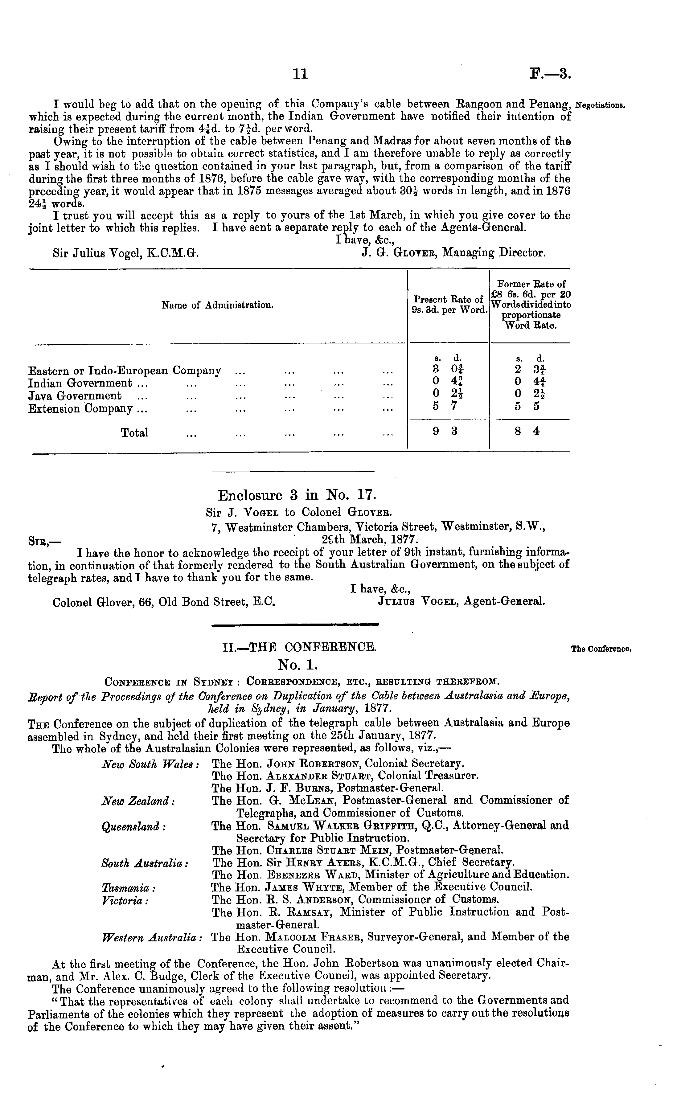 I would beg to add that on the opening of this Company's cable between Rangoon and Penang, which is expected during the current month, the Indian Government have notified their intention of raising their present tariff from 4|d. to 7_i. per word. Owing to the interruption of the cable between Penang and Madras for about seven months of the past year, it is not possible to obtain correct statistics, and I am therefore unable to reply as correctly as I should wish to the question contained in your last paragraph, but, from a comparison of the tariff during the first three months of 1876, before the cable gave way, with the corresponding months of the preceding year, it would appear that in 1875 messages averaged about 30^ words in length, and in 1876 24j words. I trust you will accept this as a reply to yours of the Ist March, in which you give cover to the joint letter to which this replies. I have sent a separate reply to each of the Agents-General. I have, &c, Sir Julius Vogel, K.C.M.G. J. G. Glovee, Managing Director.