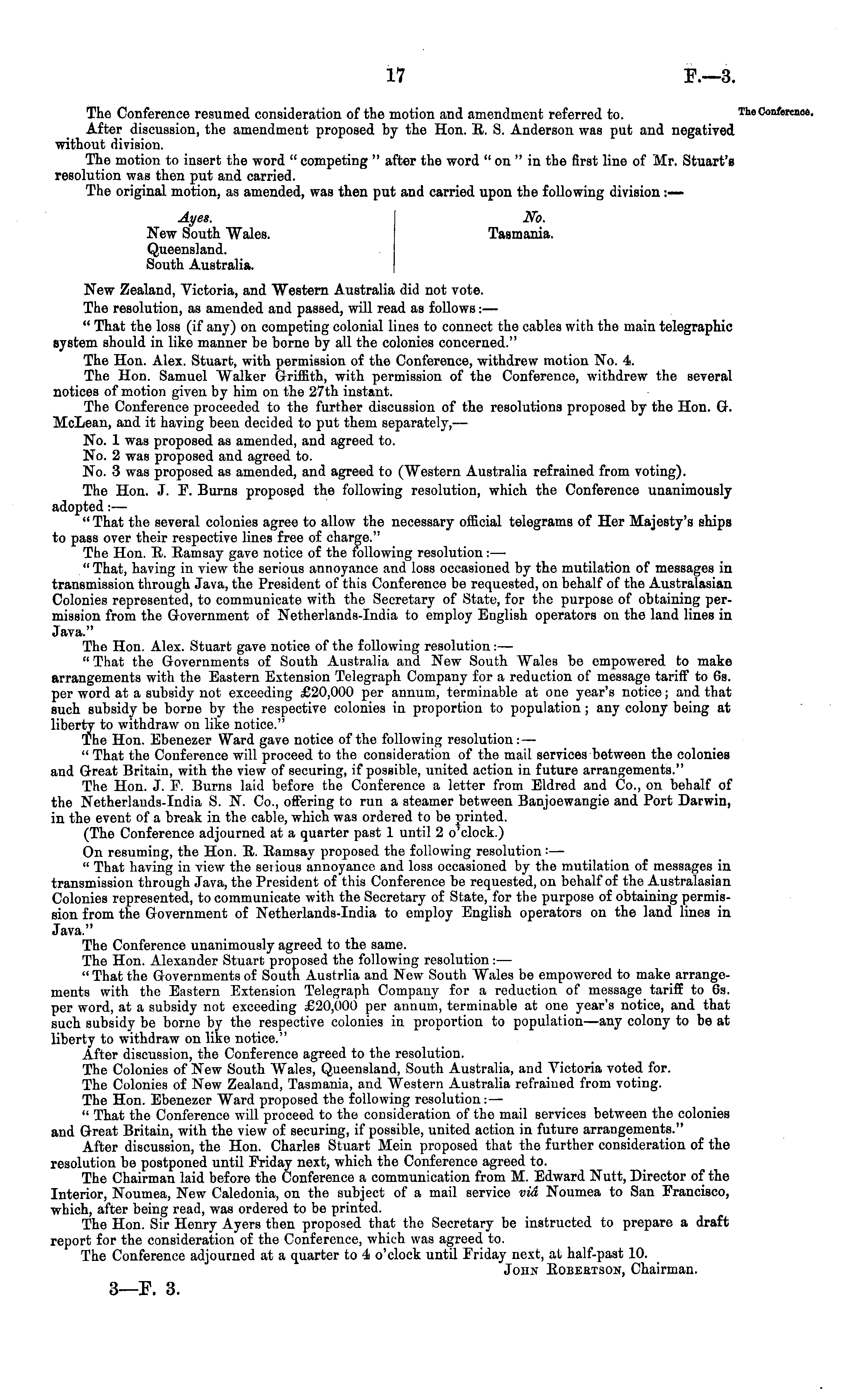 The Conference resumed consideration of the motion and amendment referred to. After discussion, the amendment proposed by the Hon. R. S. Anderson was put and negatived without division. The motion to insert the word " competing " after the word " on " in the first line of Mr. Stuart's resolution was then put and carried. The original motion, as amended, was then put and carried upon the following division:— Ayes. No. New South Wales, Tasmania. Queensland. South Australia. New Zealand, Victoria, and Western Australia did not vote. The resolution, as amended and passed, will read as follows: — " That the loss (if any) on competing colonial lines to connect the cables with the main telegraphic system should in like manner be borne by all the colonies concerned." The Hon. Alex. Stuart, with permission of the Conference, withdrew motion No. 4. The Hon. Samuel Walker Griffith, with permission of the Conference, withdrew the several notices of motion given by him on the 27th instant. The Conference proceeded to the further discussion of the resolutions proposed by the Hon. G. McLean, and it having been decided to put them separately, — No. 1 was proposed as amended, and agreed to. No. 2 was proposed and agreed to. No. 3 was proposed as amended, and agreed to (Western Australia refrained from voting). The Hon. J. F. Burns proposed the following resolution, which the Conference unanimously adopted:— " That the several colonies agree to allow the necessary official telegrams of Her Majesty's ships to pass over their respective lines free of charge." The Hon. R. Ramsay gave notice of the following resolution: — " That, having in view the serious annoyance and loss occasioned by the mutilation of messages in transmission through Java, the President of this Conference be requested, on behalf of the Australasian Colonies represented, to communicate with the Secretary of State, for the purpose of obtaining permission from the Government of Netherlands-India to employ English operators on the land lines in Java." The Hon. Alex. Stuart gave notice of the following resolution : — " That the Governments of South Australia and New South Wales be empowered to make arrangements with the Eastern Extension Telegraph Company for a reduction of message tariff to 6s. per word at a subsidy not exceeding £20,000 per annum, terminable at one year's notice; and that such subsidy be borne by the respective colonies in proportion to population; any colony being at liberty to withdraw on like notice." The Hon. Ebenezer Ward gave notice of the following resolution: — " That the Conference will proceed to the consideration of the mail services between the colonies and Great Britain, with the view of securing, if possible, united action in future arrangements." The Hon. J. P. Burns laid before the Conference a letter from Eldred and Co., on behalf of the Netherlands-India S. N. Co., offering to run a steamer between Banjoewangie and Port Darwin, in the event of a break in the cable, which was ordered to be printed. (The Conference adjourned at a quarter past 1 until 2 o'clock.) On resuming, the Hon. R. Ramsay proposed the following resolution : — " That having in view the sei ious annoyance and loss occasioned by the mutilation of messages in transmission through Java, the President of this Conference be requested, on behalf of the Australasian Colonies represented, to communicate with the Secretary of State, for the purpose of obtaining permission from the Government of Netherlands-India to employ English operators on the land lines in Java." The Conference unanimously agreed to the same. The Hon. Alexander Stuart proposed the following resolution:— " That the Governments of South Austrlia and New South Wales be empowered to make arrangements with the Eastern Extension Telegraph Company for a reduction of message tariff to 6s. per word, at a subsidy not exceeding £20,000 per annum, terminable at one year's notice, and that such subsidy be borne by the respective colonies in proportion to population—any colony to be at liberty to withdraw on like notice." After discussion, the Conference agreed to the resolution. The Colonies of New South Wales, Queensland, South Australia, and Victoria voted for. The Colonies of New Zealand, Tasmania, and Western Australia refrained from voting. The Hon. Ebenezer Ward proposed the following resolution: — " That tho Conference will proceed to the consideration of the mail services between the colonies and Great Britain, with the view of securing, if possible, united action in future arrangements." After discussion, the Hon. Charles Stuart Mem proposed that tho further consideration of the resolution be postponed until Friday next, which the Conference agreed to. The Chairman laid before the Conference a communication from M. Edward Nutt, Director of the Interior, Noumea, New Caledonia, on the subject of a mail service via Noumea to San Francisco, which, after being read, was ordered to be printed. The Hon. Sir Henry Ayers then proposed that the Secretary be instructed to prepare a draft report for the consideration of the Conference, which was agreed to. The Conference adjourned at a quarter to 4 o'clock until Friday next, at half-past 10. John Robertson, Chairman. 3—E. 3.
