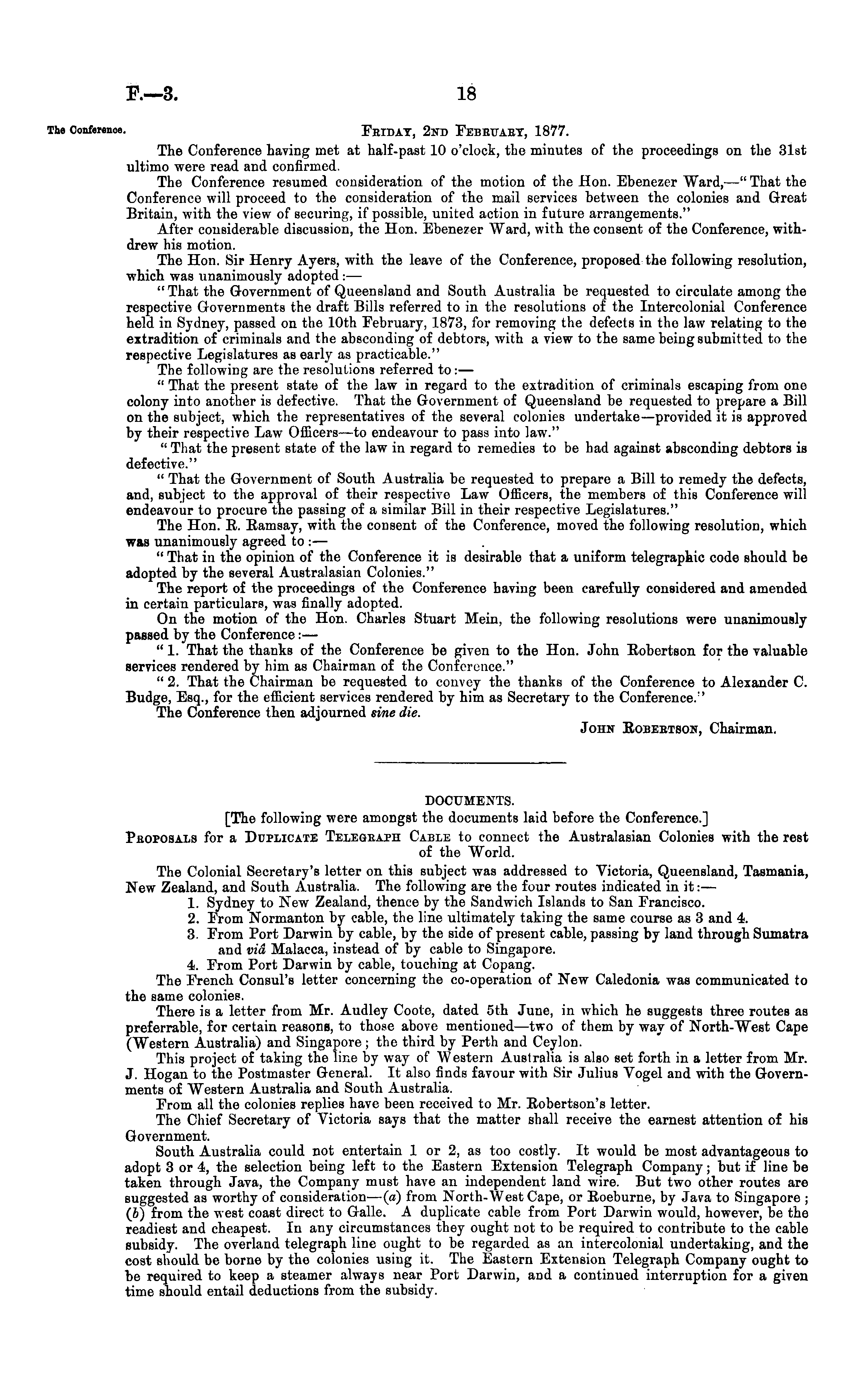 Feiday, 2nd Febeuaey, 1877. The Conference having met at half-past 10 o'clock, the minutes of the proceedings on the 31st ultimo were read and confirmed. The Conference resumed consideration of the motion of the Hon. Ebenezer Ward, —" That the Conference will proceed to the consideration of the mail services between the colonies and Great Britain, with the view of securing, if possible, united action in future arrangements." After considerable discussion, the Hon. Ebenezer Ward, with the consent of the Conference, withdrew his motion. The Hon. Sir Henry Ayers, with the leave of the Conference, proposed the following resolution, which was unanimously adopted: — " That the Government of Queensland and South Australia be requested to circulate among the respective Governments the draft Bills referred to in the resolutions of the Intercolonial Conference held in Sydney, passed on the 10th February, 1873, for removing the defects in the law relating to the extradition of criminals and the absconding of debtors, with a view to the same being submitted to the respective Legislatures as early as practicable." The following are the resolutions referred to: — " That the present state of the law in regard to the extradition of criminals escaping from one colony into another is defective. That the Government of Queensland be requested to prepare a Bill on the subject, which the representatives of the several colonies undertake—provided it is approved by their respective Law Officers—to endeavour to pass into law." " That the present state of the law in regard to remedies to be had against absconding debtors is defective." " That the Government of South Australia be requested to prepare a Bill to remedy the defects, and, subject to the approval of their respective Law Officers, the members of this Conference will endeavour to procure the passing of a similar Bill in their respective Legislatures." The Hon. R. Ramsay, with the consent of the Conference, moved the following resolution, which was unanimously agreed to : — " That in the opinion of the Conference it is desirable that a uniform telegraphic code should be adopted by the several Australasian Colonies." The report of the proceedings of the Conference having been carefully considered and amended in certain particulars, was finally adopted. On the motion of the Hon. Charles Stuart Mem, the following resolutions were unanimously passed by the Conference:— " 1. That the thanks of the Conference be given to the Hon. John Robertson for the valuable services rendered by him as Chairman of the Conference." " 2. That the Chairman be requested to convey the thanks of the Conference to Alexander C. Budge, Esq., for the efficient services rendered by him as Secretary to the Conference." The Conference then adjourned sine die. John Robeetson, Chairman.