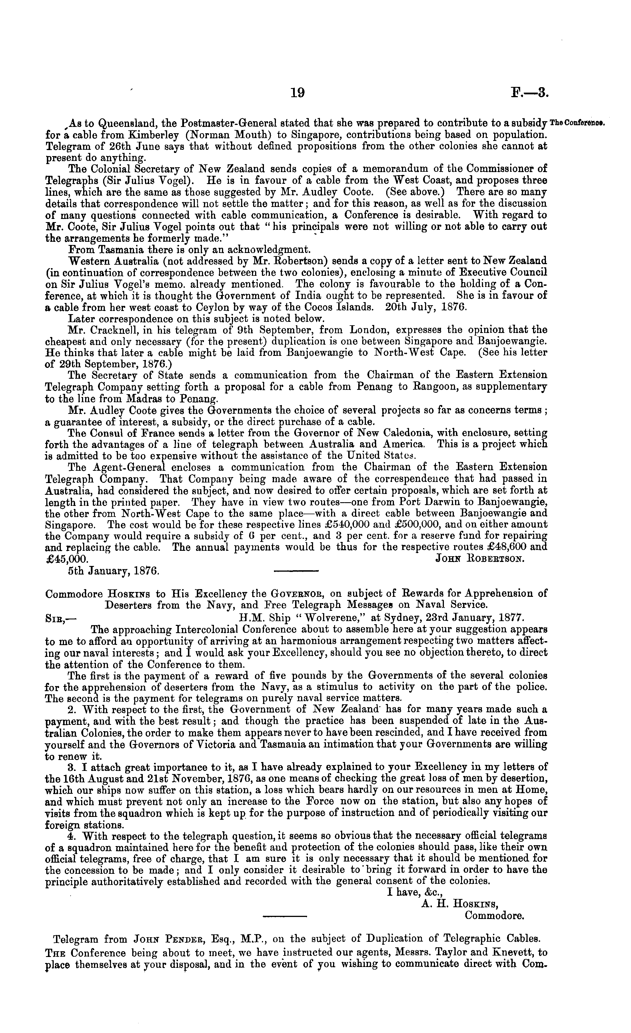 Commodore Hoskins to His Excellency the Goveenoe, on subject of Rewards for Apprehension of Deserters from the Navy, and Free Telegraph Messages on Naval Service. Sic,— H.M. Ship " Wolverene," at Sydney, 23rd January, 1877. The approaching Intercolonial Conference about to assemble here at your suggestion appears to mo to afford au opportunity of arriving at an harmonious arrangement respecting two matters affecting our naval interests ; and I would ask your Excellency, should you see no objection thereto, to direct the attention of the Conference to them. The first is the payment of a reward of five pounds by the Governments of the several colonies for the apprehension of deserters from the Navy, as a stimulus to activity on the part of the police. The second is the payment for telegrams on purely naval service matters. 2. With respect to the first, the Government of New Zealand has for many years made such a payment, and with the best result; and though the practice has been suspended of late in the Australian Colonies, the order to make them appears never to have been rescinded, and I have received from yourself and the Governors of Victoria and Tasmania an intimation that your Governments are willing to renew it. 3. I attach great importance to it, as I have already explained to your Excellency in my letters of the 16th August and 21st November, 1876, as one means of checking the great loss of men by desertion, which our ships now suffer on this station, a loss which bears hardly on our resources in men at Home, and which must prevent not only an increase to the Force now on the station, but also any hopes of visits from the squadron which is kept up for the purpose of instruction and of periodically visiting our foreign stations. 4. With respect to the telegraph question, it seems so obvious that the necessary official telegrams of a squadron maintained here for tho benefit aud protection of the colonies should pass, like their own official telegrams, free of charge, that I am sure it is only necessary that it should be mentioned for the concession to be made; and I only consider it desirable to bring it forward in order to have the principle authoritatively established and recorded with the general consent of the colonies. I have, &c, A. H. Hoskins, Commodore.