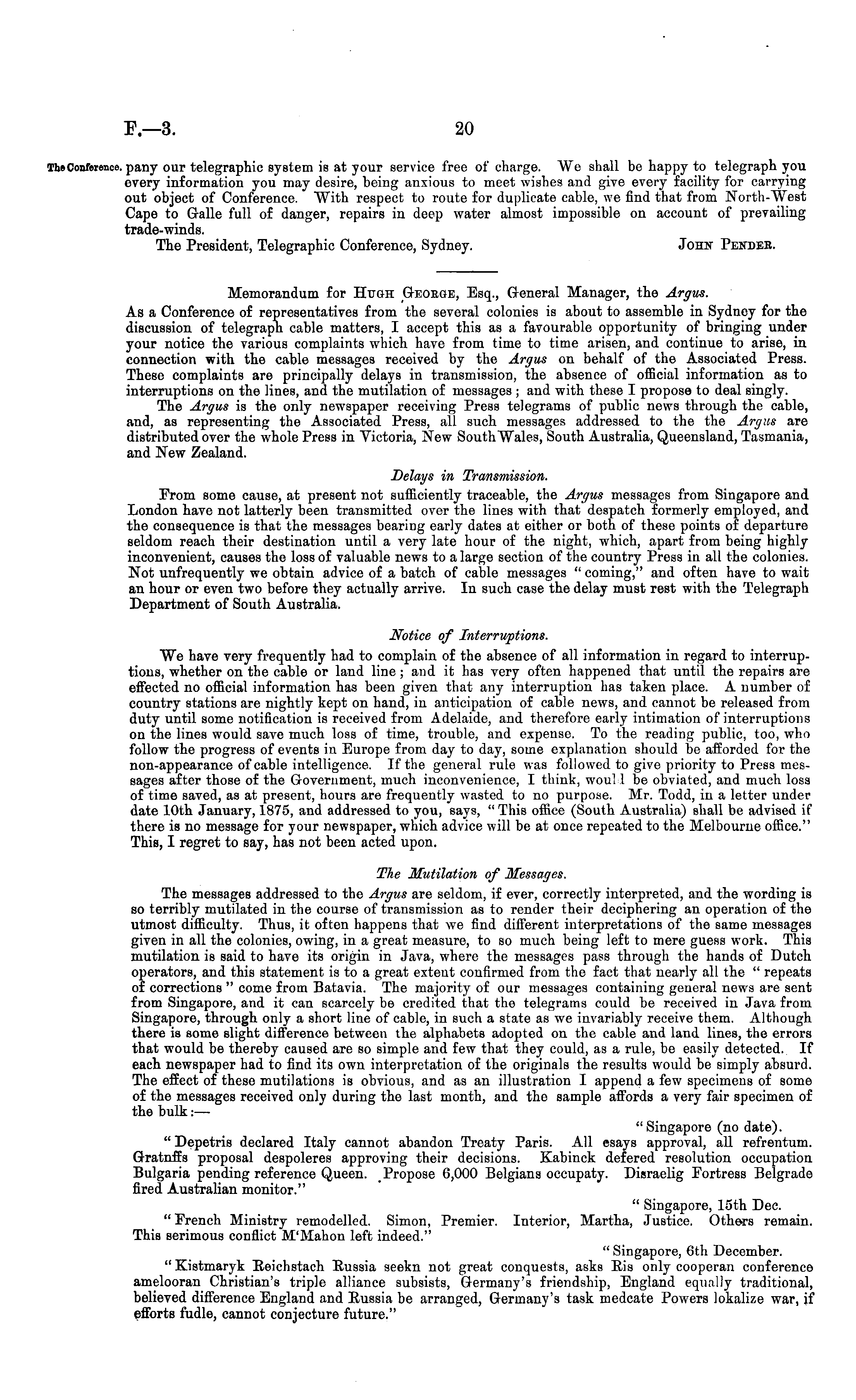 Memorandum for Hugh George, Esq., General Manager, the Argus. As a Conference of representatives from the several colonies is about to assemble in Sydney for the discussion of telegraph cable matters, I accept this as a favourable opportunity of bringing under your notice the various complaints which have from time to time arisen, and continue to arise, in connection with the cable messages received by the Argus on behalf of the Associated Press. These complaints are principally delays in transmission, the absence of official information as to interruptions on the lines, and the mutilation of messages ; and with these I propose to deal singly. The Argus is the only newspaper receiving Press telegrams of public new-s through the cable, and, as representing the Associated Press, all such messages addressed to the the Argus are distributed over the whole Press in Victoria, New South Wales, South Australia, Queensland, Tasmania, and New Zealand. Belays in Transmission. From some cause, at present not sufficiently traceable, the Argus messages from Singapore and London have not latterly been transmitted over the lines with that despatch formerly employed, and the consequence is that the messages bearing early dates at either or both of these points of departure seldom reach their destination until a very late hour of the night, which, apart from being highly inconvenient, causes the loss of valuable news to a large section of the country Press in all the colonies. Not unfrequently we obtain advice of a batch of cable messages " coming," and often have to wait an hour or even two before they actually arrive. In such case the delay must rest with the Telegraph Department of South Australia. Notice of Interruptions. We have very frequently had to complain of the absence of all information in regard to interruptions, whether on the cable or land line ; and it has very often happened that until the repairs are effected no official information has been given that any interruption has taken place. A number of country stations are nightly kept on hand, in anticipation of cable news, and cannot be released from duty until some notification is received from Adelaide, and therefore early intimation of interruptions on the lines w-ould save much loss of time, trouble, and expense. To the reading public, too, who follow the progress of events in Europe from day to day, some explanation should be afforded for the non-appearance of cable intelligence. If the general rule was followed to give priority to Press messages after those of the Government, much inconvenience, I think, woul 1 be obviated, and much loss of time saved, as at present, hours are frequently wasted to no purpose. Mr. Todd, in a letter under date 10th January, 1875, and addressed to you, says, " This office (South Australia) shall bo advised if there is no message for your newspaper, which advice will be at once repeated to the Melbourne office." This, I regret to say, has not been acted upon. The Mutilation of Messages. The messages addressed to the Argus are seldom, if ever, correctly interpreted, and the wording is so terribly mutilated in the course of transmission as to render their deciphering an operation of tho utmost difficulty. Thus, it often happens that we find different interpretations of the same messages given in all the colonies, owing, in a great measure, to so much being left to mere guess work. This mutilation is said to have its origin in Java, where the messages pass through the hands of Dutch operators, and this statement is to a great extent confirmed from the fact that nearly all the " repeats of corrections " come from Batavia. The majority of our messages containing general news are sent from Singapore, and it can scarcely be credited that the telegrams could be received in Java from Singapore, through only a short line of cable, in such a state as we invariably receive them. Although there is some slight difference between the alphabets adopted on the cable and land lines, the errors that would be thereby caused are so simple and few that they could, as a rule, be easily detected. If each newspaper had to find its own interpretation of the originals the results would be simply absurd. The effect of these mutilations is obvious, and as an illustration I append a few specimens of some of the messages received only during the last month, and the sample affords a very fair specimen of the bulk: — "Singapore (no date). " Depetris declared Italy cannot abandon Treaty Paris. All esays approval, all refrentum. Gratnffs proposal despoleres approving their decisions. Kabinck defered resolution occupation Bulgaria pending reference Queen. Propose 6,000 Belgians occupaty. Disraelig Fortress Belgrade fired Australian monitor." " Singapore, 15th Dec. " French Ministry remodelled. Simon, Premier. Interior, Martha, Justice. Others remain. This serimous conflict M'Mahon left indeed." " Singapore, 6th December. "Kistmaryk Reichstaeh Russia seekn not great conquests, asks Ris only cooperan conference amelooran Christian's triple alliance subsists, Germany's friendship, England equally traditional, believed difference England and Russia be arranged, Germany's task medcate Powers lokalize war, if efforts fudle, cannot conjecture future."