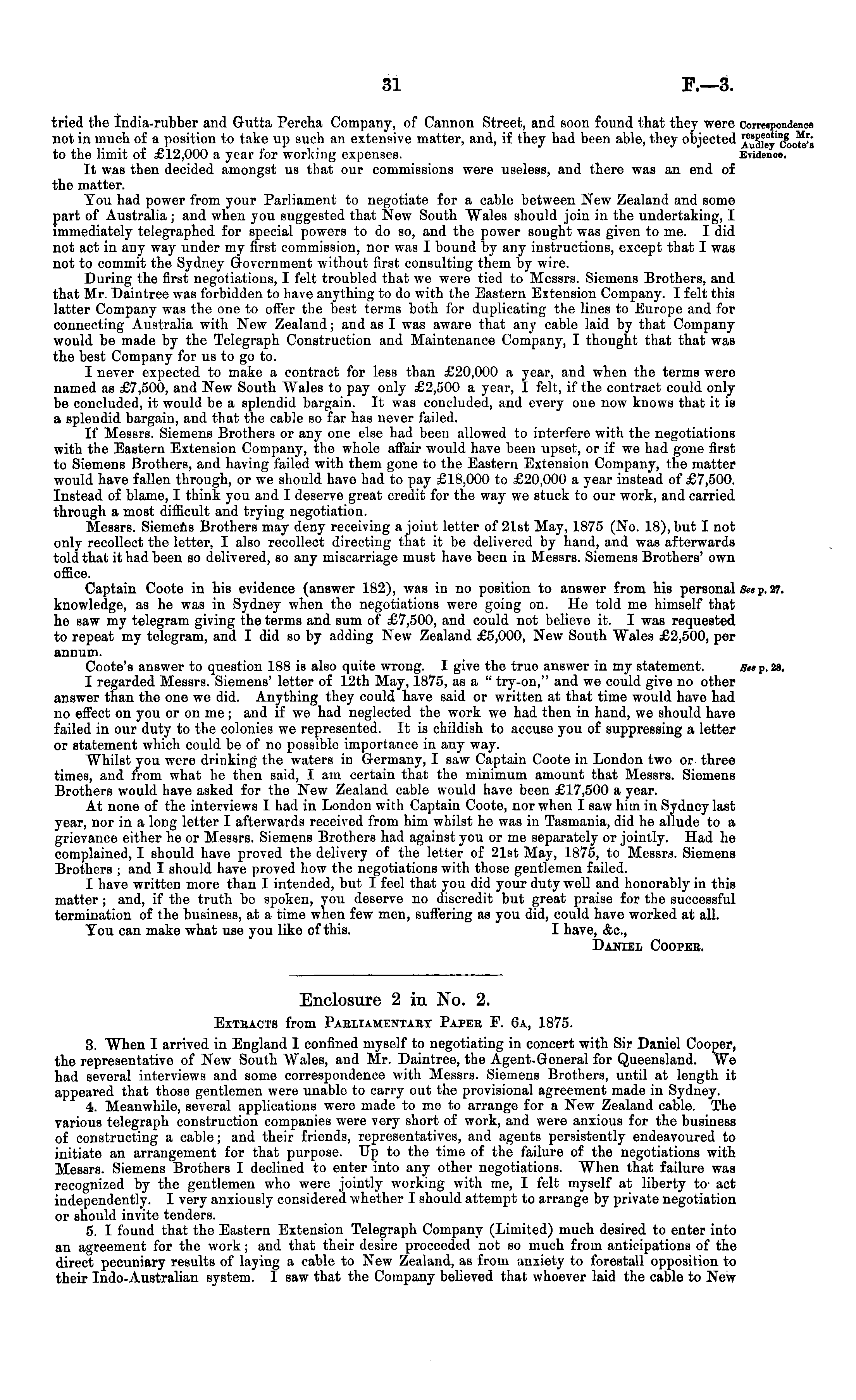 tried the India-rubber and Gutta Percha Company, of Cannon Street, and soon found that they were not in much of a position to take up such an extensive matter, and, if they had been able, they objected to the limit of £12,000 a year for working expenses. It was then decided amongst us that our commissions were useless, and there was an end of the matter. Tou had power from your Parliament to negotiate for a cable between New Zealand and some part of Australia ; and when you suggested that New South Wales should join in the undertaking, I immediately telegraphed for special powers to do so, and the power sought was given to me. I did not act in any way under my first commission, nor was I bound by any instructions, except that I was not to commit the Sydney Government without first consulting them by wire. During the first negotiations, I felt troubled that we were tied to Messrs. Siemens Brothers, and that Mr. Daintree was forbidden to have anything to do with the Eastern Extension Company. I felt this latter Company was the one to offer the best terms both for duplicating the lines to Europe and for connecting Australia with New Zealand; and as I was aware that any cable laid by that Company would be made by the Telegraph Construction and Maintenance Company, I thought that that was the best Company for us to go to. I never expected to make a contract for less than £20,000 a year, and when the terms were named as £7,500, and New South Wales to pay only £2,500 a year, I felt, if the contract could only be concluded, it would be a splendid bargain. It was concluded, and every one now knows that it is a splendid bargain, and that the cable so far has never failed. If Messrs. Siemens Brothers or any one else had been allowed to interfere with the negotiations with the Eastern Extension Company, the whole affair would have been upset, or if we had gone first to Siemens Brothers, and having failed with them gone to the Eastern Extension Company, the matter would have fallen through, or we should have had to pay £18,000 to £20,000 a year instead of £7,500. Instead of blame, I think you and I deserve great credit for the way we stuck to our work, and carried through a most difficult and trying negotiation. Messrs. Siemens Brothers may deny receiving a joint letter of 21st May, 1875 (No. 18), but I not only recollect the letter, I also recollect directing that it be delivered by hand, and was afterwards told that it had been so delivered, so any miscarriage must have been in Messrs. Siemens Brothers' own office. Captain Coote in his evidence (answer 182), was in no position to answer from his personal knowledge, as he was in Sydney when the negotiations were going on. He told me himself that he saw my telegram giving the terms and sum of £7,500, and could not believe it. I was requested to repeat my telegram, and I did so by adding New Zealand £5,000, New South Wales £2,500, per annum. Coote's answer to question 188 is also quite wrong. I give the true answer in my statement. I regarded Messrs. Siemens' letter of 12th May, 1875, as a " try-on," and we could give no other answer than the one we did. Anything they could have said or written at that time would have had no effect on you or on me; and if wo had neglected the work we had then in hand, we should have failed in our duty to the colonies we represented. It is childish to accuse you of suppressing a letter or statement which could be of no possible importance in any way. Whilst you were drinking the waters in Germany, I saw Captain Coote in London two or three times, and from what he then said, I am certain that the minimum amount that Messrs. Siemens Brothers would have asked for the New Zealand cable would have been £17,500 a year. At none of the interviews I had in London with Captain Coote, nor when I saw him in Sydney last year, nor in a long letter I afterwards received from him whilst he was in Tasmania, did he allude to a grievance either he or Messrs. Siemens Brothers had against you or me separately or jointly. Had he complained, I should have proved the delivery of the letter of 21st May, 1875, to Messrs. Siemens Brothers ; and I should have proved how the negotiations with those gentlemen failed. I have written more than I intended, but I feel that you did your duty well and honorably in this matter ; and, if the truth be spoken, you deserve no discredit but great praise for the successful termination of the business, at a time when few men, suffering as you did, could have worked at all. You can make what use you like of this. I have, &c, Daniel Coopee.