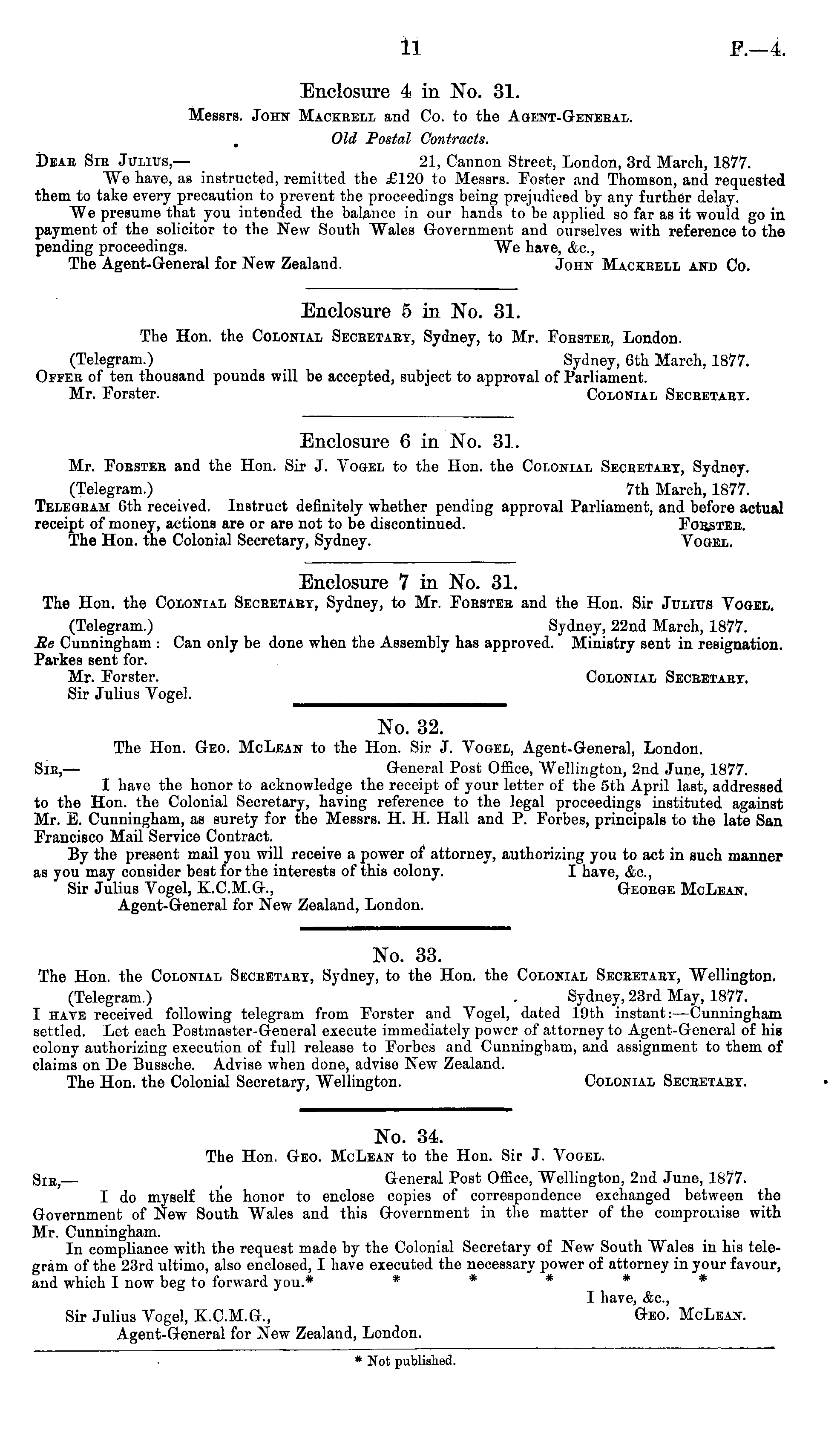 No. 33. The Hon. the Colonial Seceetaey, Sydney, to the Hon. the Colonial Seceetaey, Wellington. (Telegram.) . Sydney, 23rd May, 1877. I have received following telegram from Forster and Vogel, dated 19th instant: —Cunningham settled. Let each Postmaster-General execute immediately power of attorney to Agent-General of his colony authorizing execution of full release to Forbes and Cunningham, and assignment to them of claims on De Bussche. Advise when done, advise New Zealand. The Hon. the Colonial Secretary, Wellington. Colonial Seceetaey.