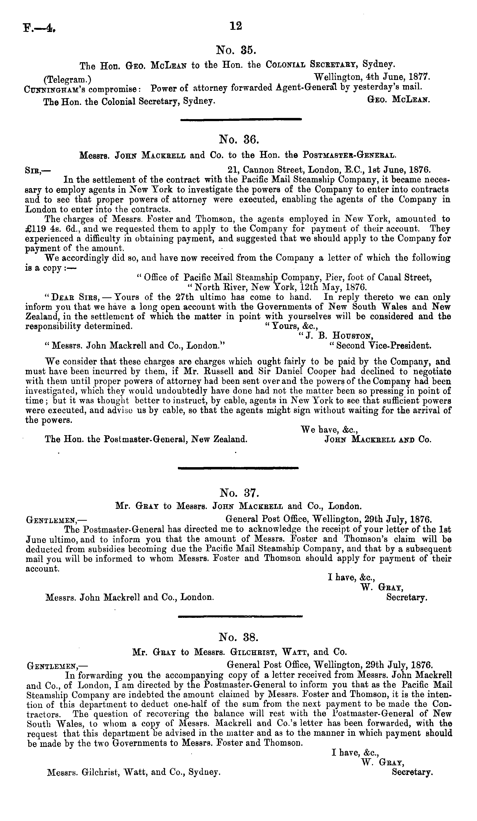 No. 37. Mr. Geay to Messrs. John Mackeell and Co., London. Gentlemen, — General Post Office, Wellington, 29th July, 1876. The Postmaster-General has directed me to acknowledge the receipt of your letter of the Ist June ultimo, and to inform you that the amount of Messrs. Foster and Thomson's claim will be deducted from subsidies becoming due the Pacific Mail Steamship Company, and that by a subsequent mail you will be informed to whom Messrs. Foster and Thomson should apply for payment of their account. I have, Ac, W. Geay, Messrs. John Mackrell and Co., London. Secretary.