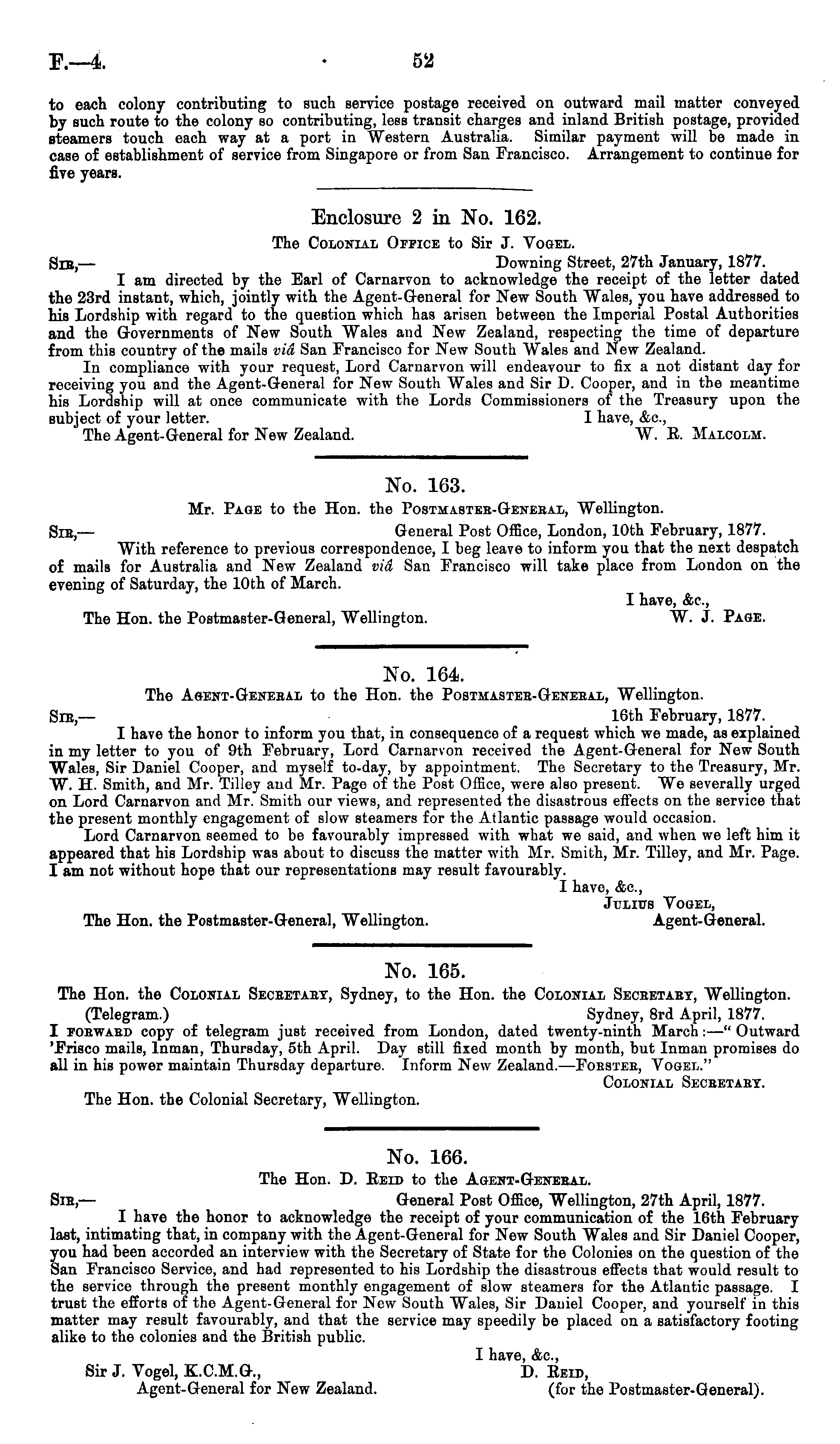 No. 166. The Hon. D. Reid to the Agent-Geneeal. Sic— General Post Office, Wellington, 27th April, 1877. I have the honor to acknowledge the receipt of your communication of the 16th February last, intimating that, in company with the Agent-General for New South Wales and Sir Daniel Cooper, you had been accorded an interview with the Secretary of State for the Colonies on the question of the San Francisco Service, and had represented to his Lordship the disastrous effects that would result to the service through the present monthly engagement of slow steamers for the Atlantic passage. I trust the efforts of the Agent-General for New South Wales, Sir Daniel Cooper, and yourself in this matter may result favourably, and that the service may speedily be placed on a satisfactory footing alike to the colonies and the British public I have, &c, Sir J. Vogel, K.C.M.G., D. Reid, Agent-General for New Zealand. (for the Postmaster-General).