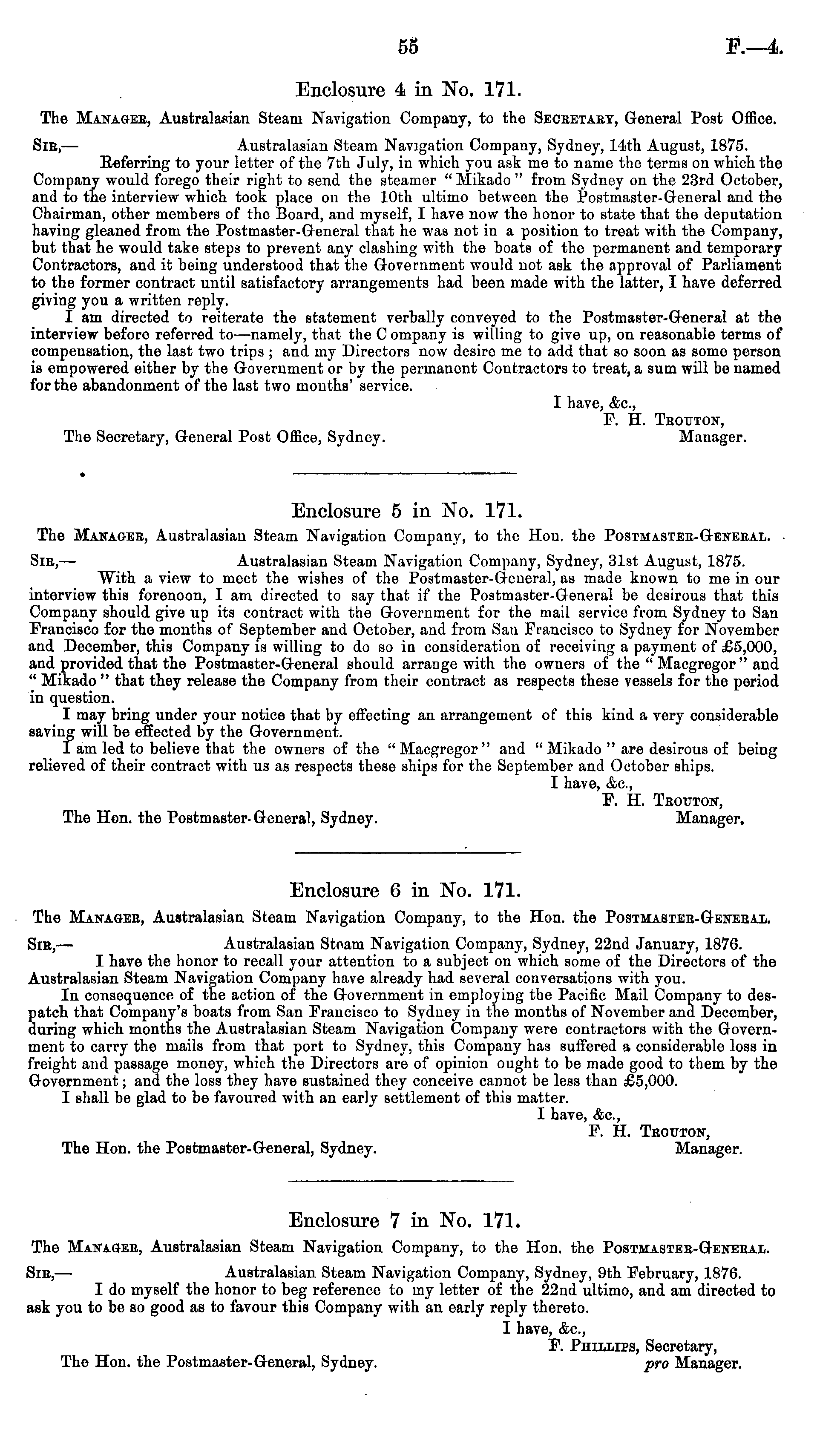 Enclosure 4 in No. 171. The Managee, Australasian Steam Navigation Company, to the Seceetaey, General Post Office. Sic, — Australasian Steam Navigation Company, Sydney, 14th August, 1875. Referring to your letter of tho 7th July, in which you ask me to name the terms on which the Company would forego their right to send the steamer " Mikado " from Sydney on the 23rd October, and to the interview which took place on the 10th ultimo between tho Postmaster-General and the Chairman, other members of the Board, and myself, I have now the honor to state that the deputation having gleaned from the Postmaster-General that he was not in a position to treat with the Company, but that he would take steps to prevent any clashing with the boats of the permanent and temporary Contractors, and it being understood that the Government would not ask the approval of Parliament to the former contract until satisfactory arrangements had been made with the latter, I have deferred giving you a written reply. I am directed to reiterate the statement verbally conveyed to the Postmaster-General at the interview before referred to —namely, that the C ompany is willing to give up, on reasonable terms of compensation, the last two trips ; and my Directors now desire me to add that so soon as some person is empowered either by the Government or by the permanent Contractors to treat, a sum will be named for the abandonment of the last two months' service. I have, &c, F. H. Teouton, The Secretary, General Post Office, Sydney. Manager. •