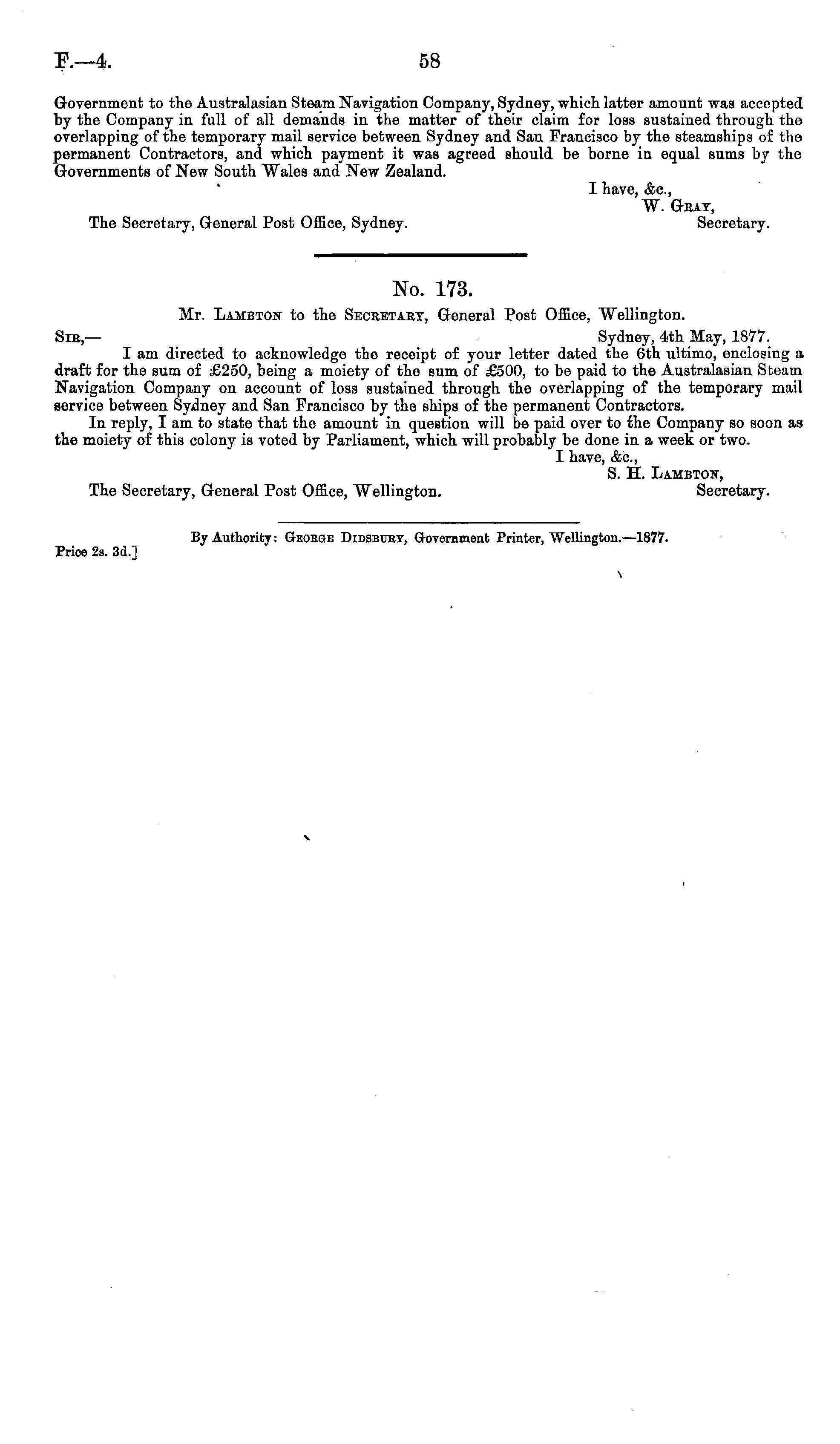 No. 173. Mr. Lambton to the Seceetaey, General Post Office, Wellington. Sic, — Sydney, 4th May, 1877. I am directed to acknowledge the receipt of your letter dated the 6th ultimo, enclosing a draft for the sum of £250, being a moiety of the sum of £500, to be paid to the Australasian Steam Navigation Company on account of loss sustained through the overlapping of the temporary mail service between Sydney and San Francisco by the ships of the permanent Contractors. In reply, I am to state that the amount in question will be paid over to the Company so soon as the moiety of this colony is voted by Parliament, which will probably be done in a week or two. I have, &c, S. H. Lambton, The Secretary, General Post Office, Wellington. Secretary.