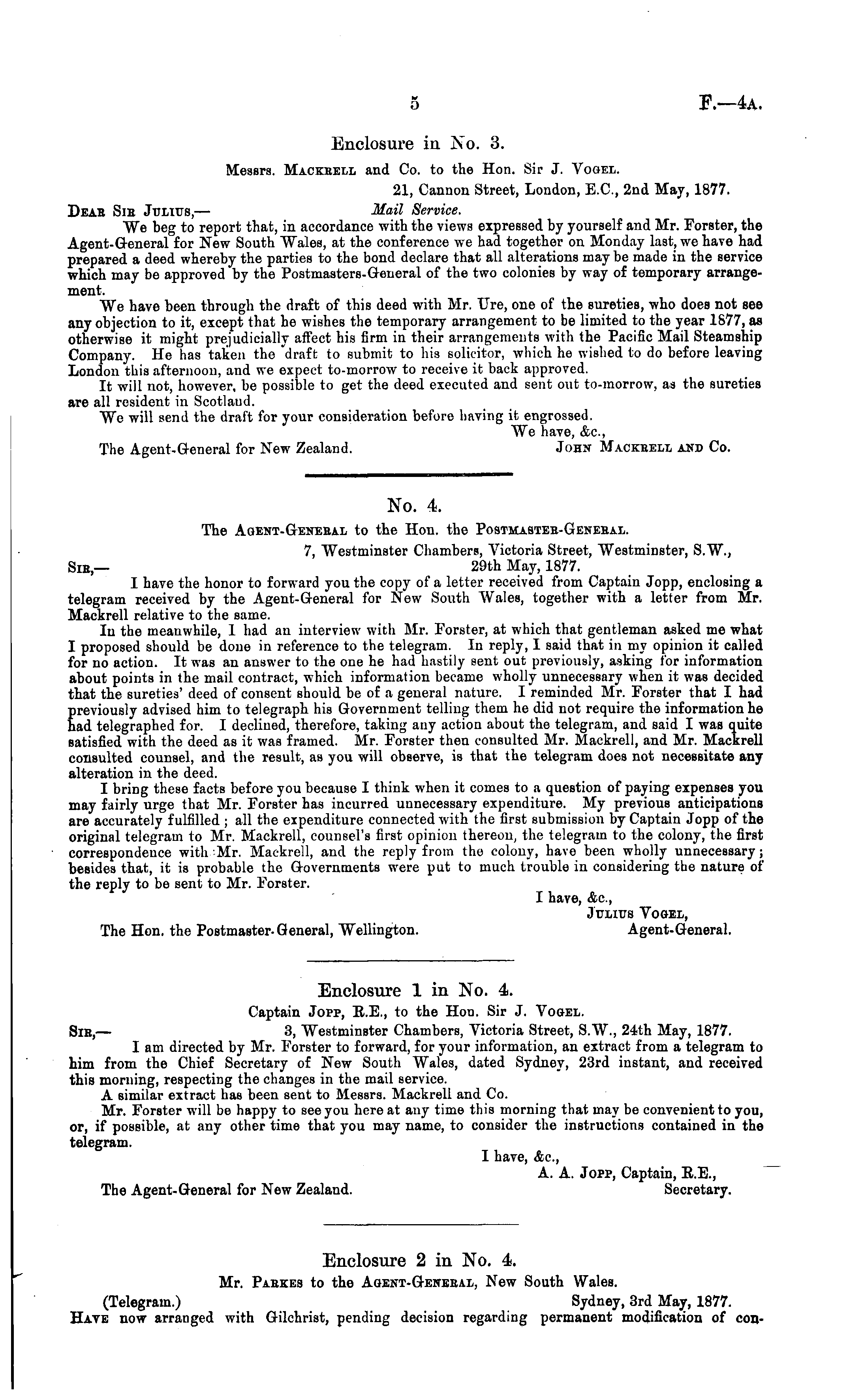 No. 4. The Agent-Genebal to the Hon. the Posthasteb-Genebal. 7, "Westminster Chambers, Victoria Street, "Westminster, S.W., Sib,— 29th May, 1877. I have the honor to forward you the copy of a letter received from Captain Jopp, enclosing a telegram received by the Agent-General for New South Wales, together with a letter from Mr. Mackrell relative to the same. In the meanwhile, 1 had an interview with Mr. Forster, at which that gentleman asked me what I proposed should be done in reference to the telegram. In reply, I said that in my opinion it called for no action. It was an answer to the one he had hastily sent out previously, asking tor information about points in the mail contract, which information became wholly unnecessary when it was decided that the sureties' deed of consent should be of a general nature. I reminded Mr. Forster that I had previously advised him to telegraph his Government telling them he did not require the information he had telegraphed for. I declined, therefore, taking any action about the telegram, and said I was quite satisfied with the deed as it was framed. Mr. Forster then consulted Mr. Mackrell, and Mr. Mackrell consulted counsel, and the result, as you will observe, is that the telegram does not necessitate any alteration in the deed. I bring these facts before you because I think when it comes to a question of paying expenses you may fairly urge that Mr. Forster has incurred unnecessary expenditure. My previous anticipations are accurately fulfilled ; all the expenditure connected with the first submission by Captain Jopp of the original telegram to Mr. Mackrell, counsel's first opinion thereon, the telegram to the colony, the first correspondence with Mr. Mackrell, and the reply from the colony, have been wholly unnecessary ; besides that, it is probable the Governments were put to much trouble in considering the nature of the reply to be sent to Mr. Forster. I have, &c, Julius Vogel, The Hon. the Postmaster-General, "Wellington. Agent-General.