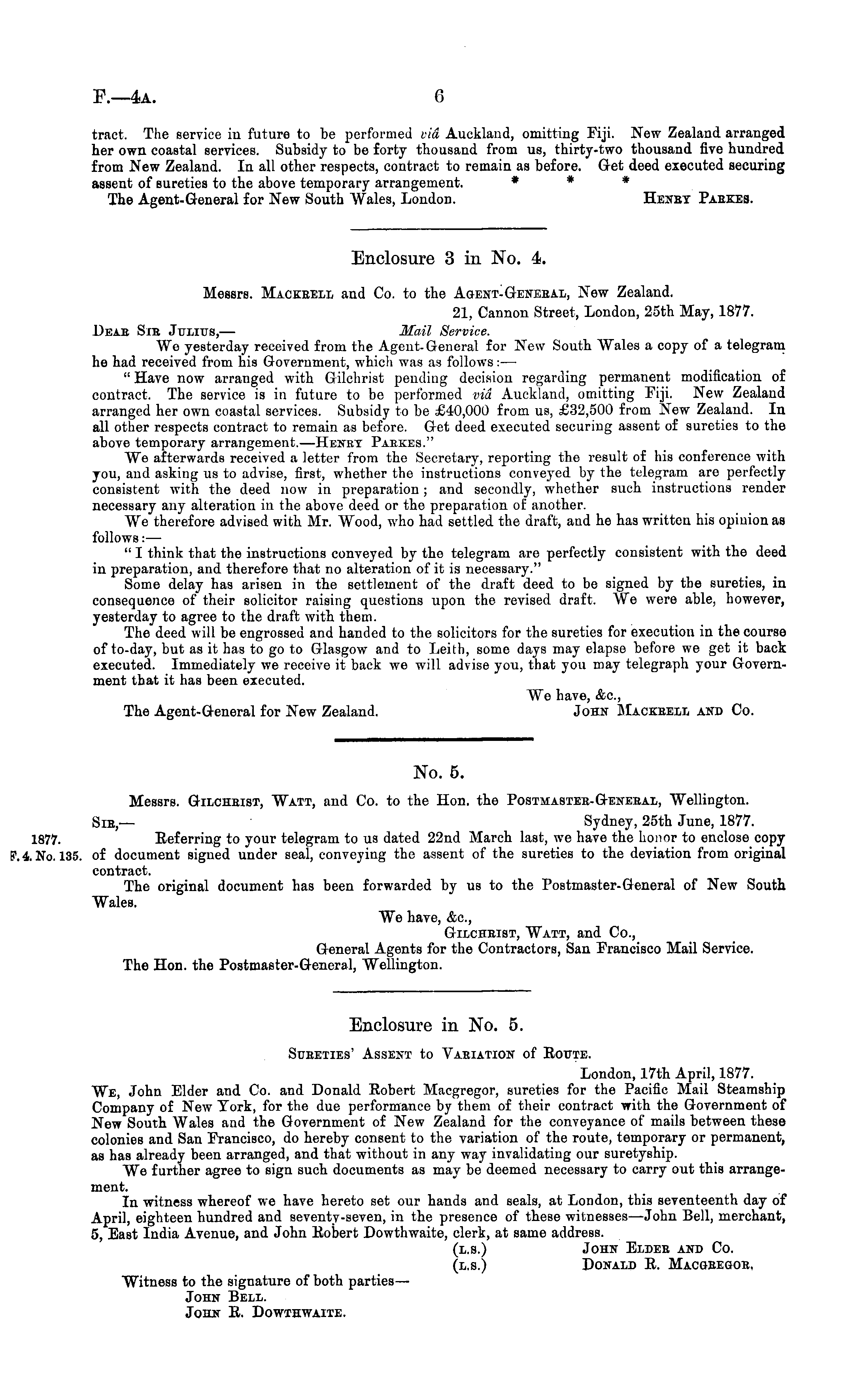 Enclosure in No. 5. Sureties' Assent to Variation of Route. London, 17th April, 1877. We, John Elder and Co. and Donald Eobert Macgregor, sureties for the Pacific Mail Steamship Company of New York, for the due performance by them of their contract with the Government of New South Wales and the Government of New Zealand for the conveyance of mails between these colonies and San Francisco, do hereby consent to the variation of the route, temporary or permanent, as has already been arranged, and that without in any way invalidating our suretyship. We further agree to sign such documents as may be deemed necessary to carry out this arrangement. In witness whereof we have hereto set our hands and seals, at London, this seventeenth day of April, eighteen hundred and seventy-seven, in the presence of these witnesses —John Bell, merchant, 5, East India Avenue, and John Robert Dowthwaite, clerk, at same address. (1.5.) John Eldeh and Co. (1.5.) Donald R. Macgregor. Witness to the signature of both parties— John Bell. John R. Dowthwaite.