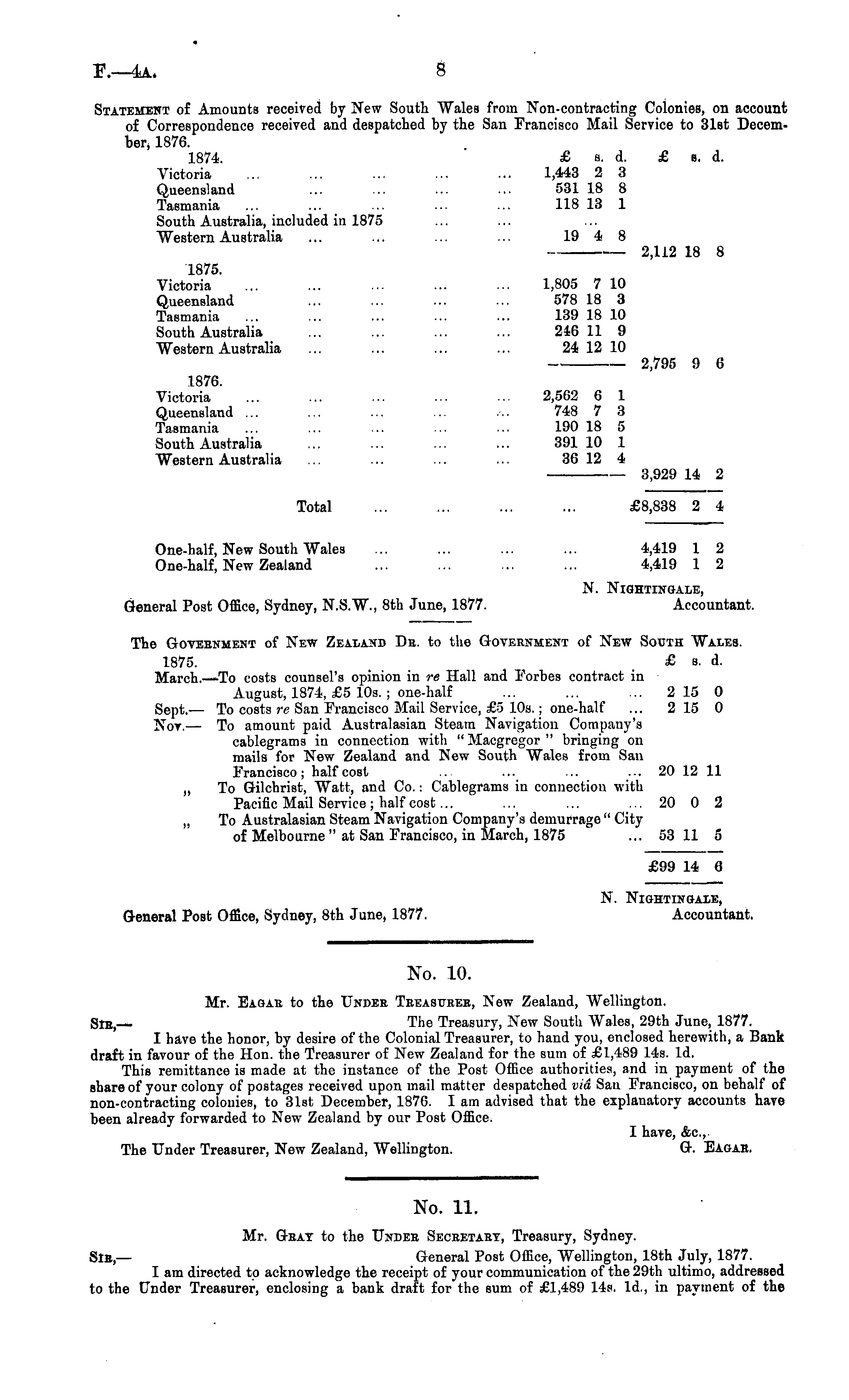 No. 10. Mr. Eagae to the Undee Tbeasttbeb, New Zealand, Wellington. Sib,— The Treasury, New South Wales, 29th June, 1877. I have the honor, by desire of the Colonial Treasurer, to hand you, enclosed herewith, a Bank draft in favour of the Hon. the Treasurer of New Zealand for the sum of £1,489 14s. Id, This remittance is made at the instance of the Post Office authorities, and in payment of the share of your colony of postages received upon mail matter despatched via San Francisco, on behalf of non-contracting colonies, to 31st December, 1876. lam advised that the explanatory accounts have been already forwarded to New Zealand by our Post Office. I have, &c, The Under Treasurer, New Zealand, Wellington. G. Eagab.