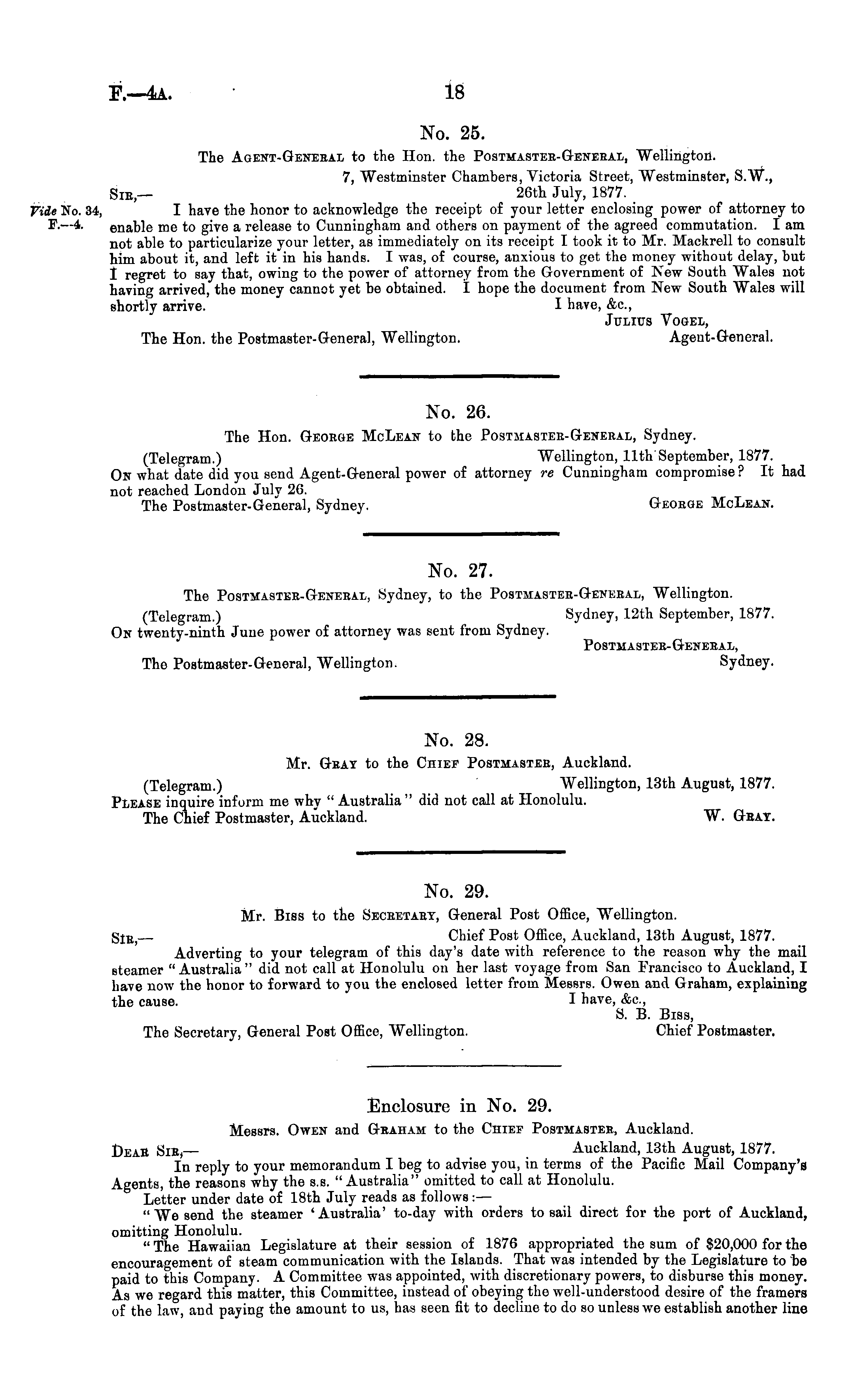 No. 25. The Agent-Geneeal to the Hon. the Postmastee-General, Wellington. 7, Westminster Chambers, Victoria Street, Westminster, S.W., Sib— 26th July, 1877. I have the honor to acknowledge the receipt of your letter enclosing power of attorney to enable me to give a release to Cunningham and others on payment of the agreed commutation. lam not able to particularize your letter, as immediately on its receipt I took it to Mr. Mackrell to consult him about it, and left it in his hands. I was, of course, anxious to got the money without delay, but I regret to say that, owing to the power of attorney from the Government of New South Wales uot having arrived, the money cannot yet be obtained. I hope the document from New South Wales will shortly arrive. I have, &c, Jttlips Vogel, The Hon. the Postmaster-General, Wellington. Agent-General.