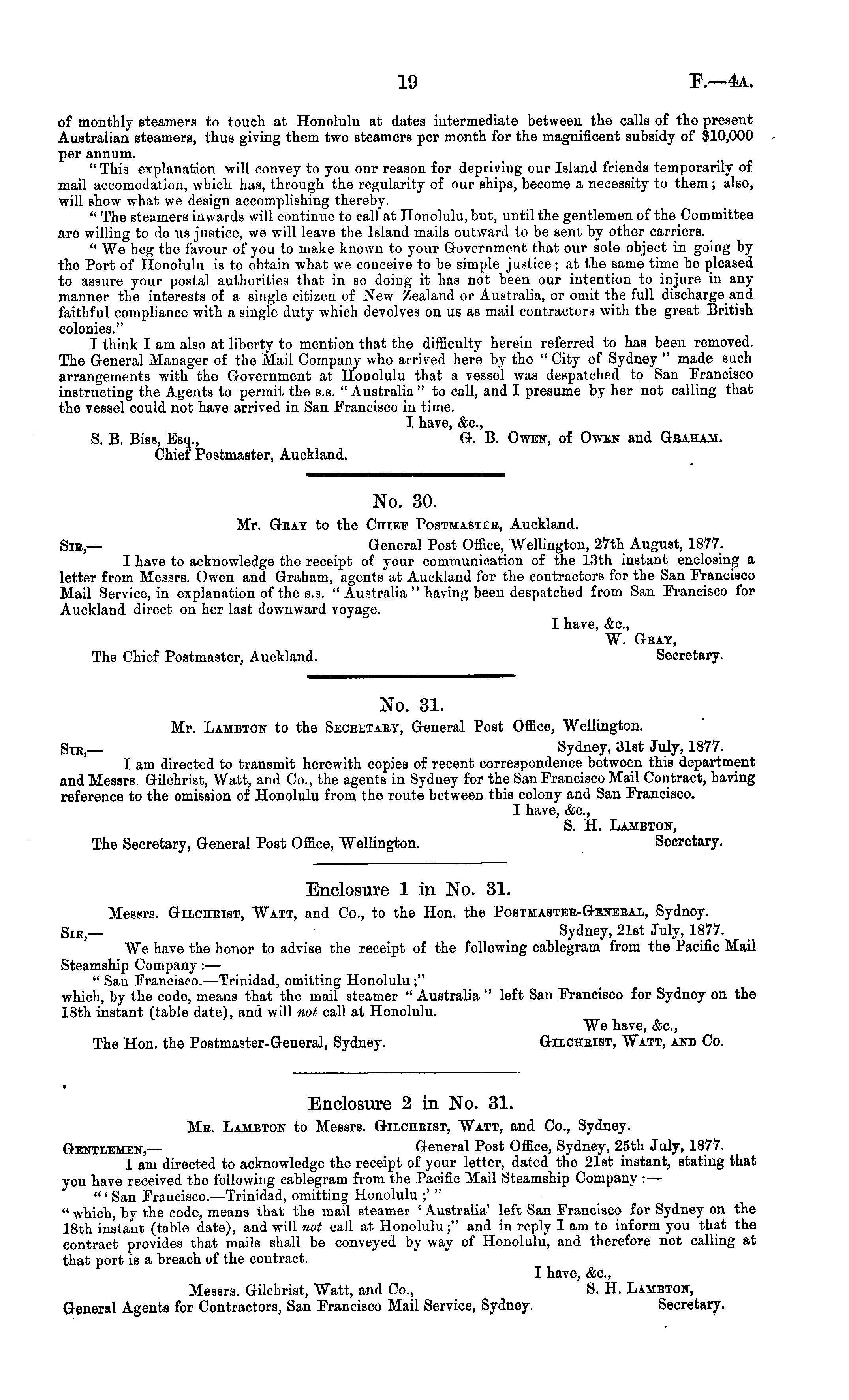 No. 31. Mr. Lambton to the Seceetaet, General Post Office, Wellington. Sie, Sydney, 31st July, 1877. I am directed to transmit herewith copies of recent correspondence between this department and Messrs. Gilchrist, Watt, and Co., the agents in Sydney for the San Francisco Mail Contract, having reference to the omission of Honolulu from the route between this colony and San Francisco. I have, &c, S. H. Lambton, The Secretary, General Post Office, Wellington. Secretary.