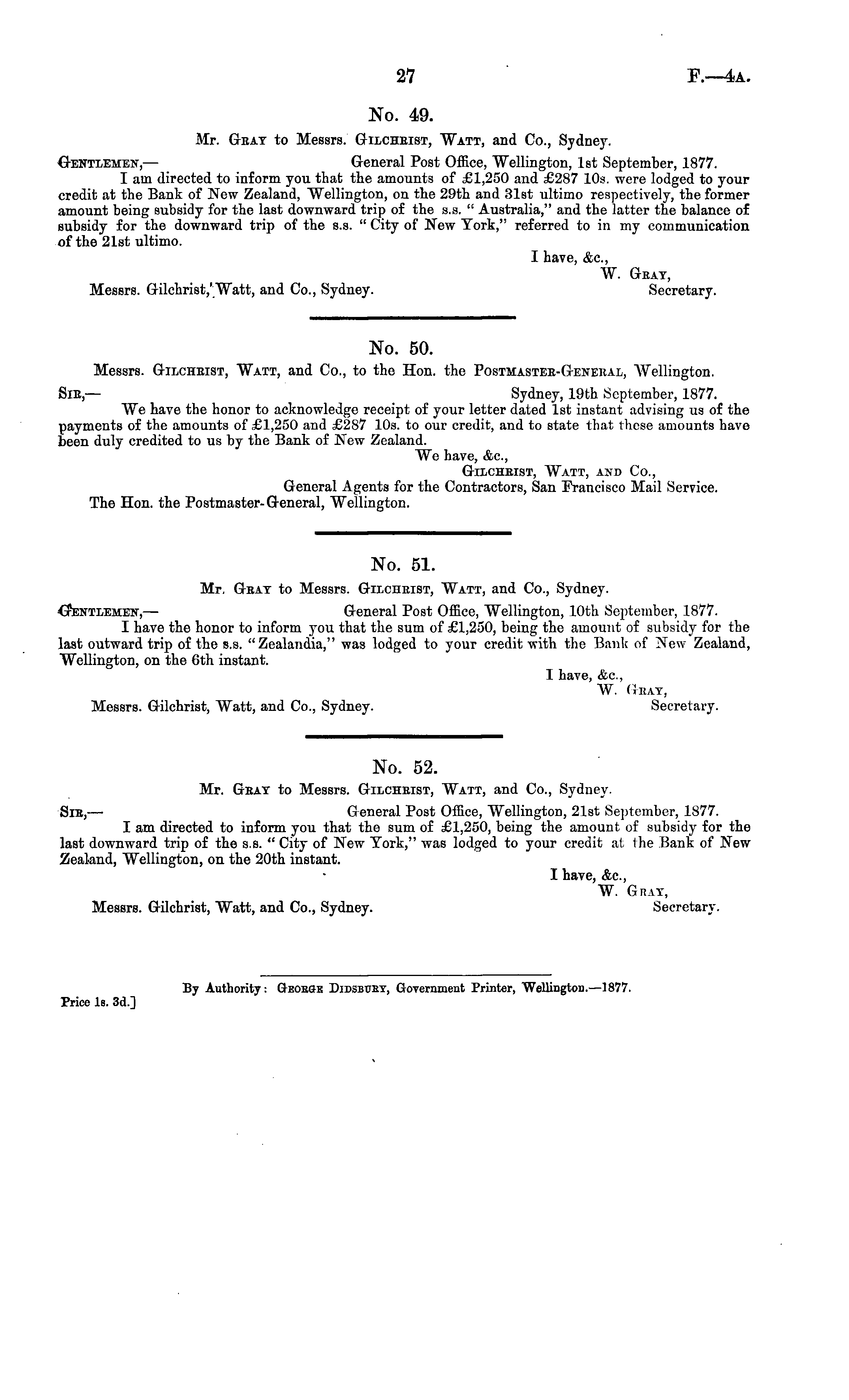 No. 52. Mr. Geat to Messrs. Gilcheist, "Watt, and Co., Sydney. Sie,— G-eneral Post Office, "Wellington, 21st September, 1877. I am directed to inform you that tho sum of £1,250, being the amount of subsidy for the last downward trip of the s.s. " City of New York," was lodged to your credit at; the Bank of New Zealand, "Wellington, on the 20th instant. I have, Ac, W. Ghat, Messrs. Grilchrist, Watt, and Co., Sydney. Secretary.