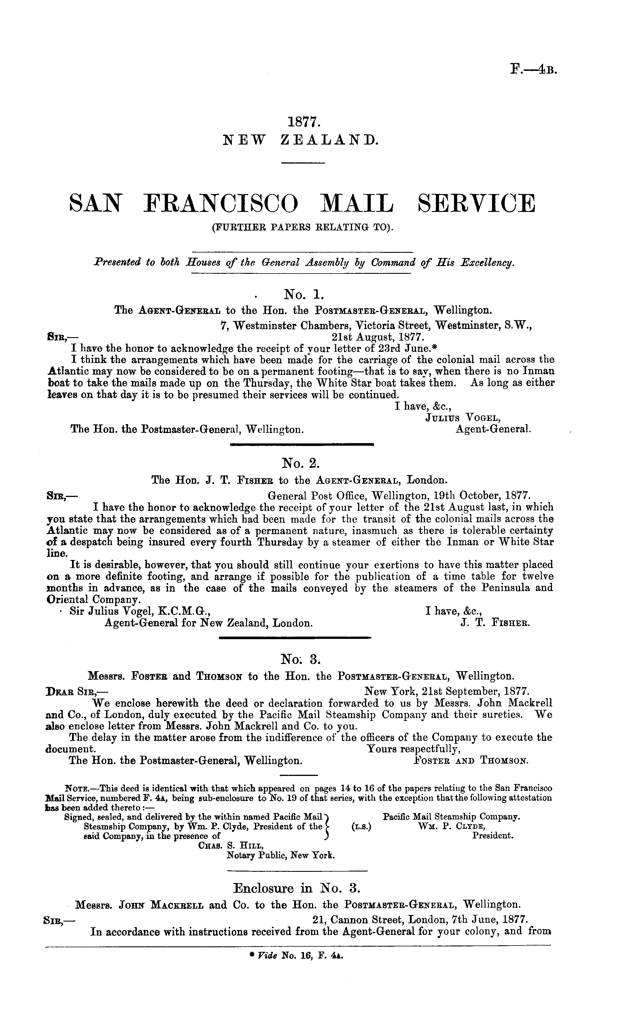 No. 3. Messrs. Fosteb and Thomson to the Hon. the Postmastee-Geneeal, Wellington. Deab Sib,— New York, 21st September, 1877. We enclose herewith the deed or declaration forwarded to us by Messrs. John Mackrell and Co., of London, duly executed by the Pacific Mail Steamship Company and their sureties. We also enclose letter from Messrs. John Mackrell and Co. to you. The delay in the matter arose from the indifference of the officers of the Company to execute the document. Tours respectfully, The Hon. the Postmaster-General, Wellington. Fostee and Thomson.