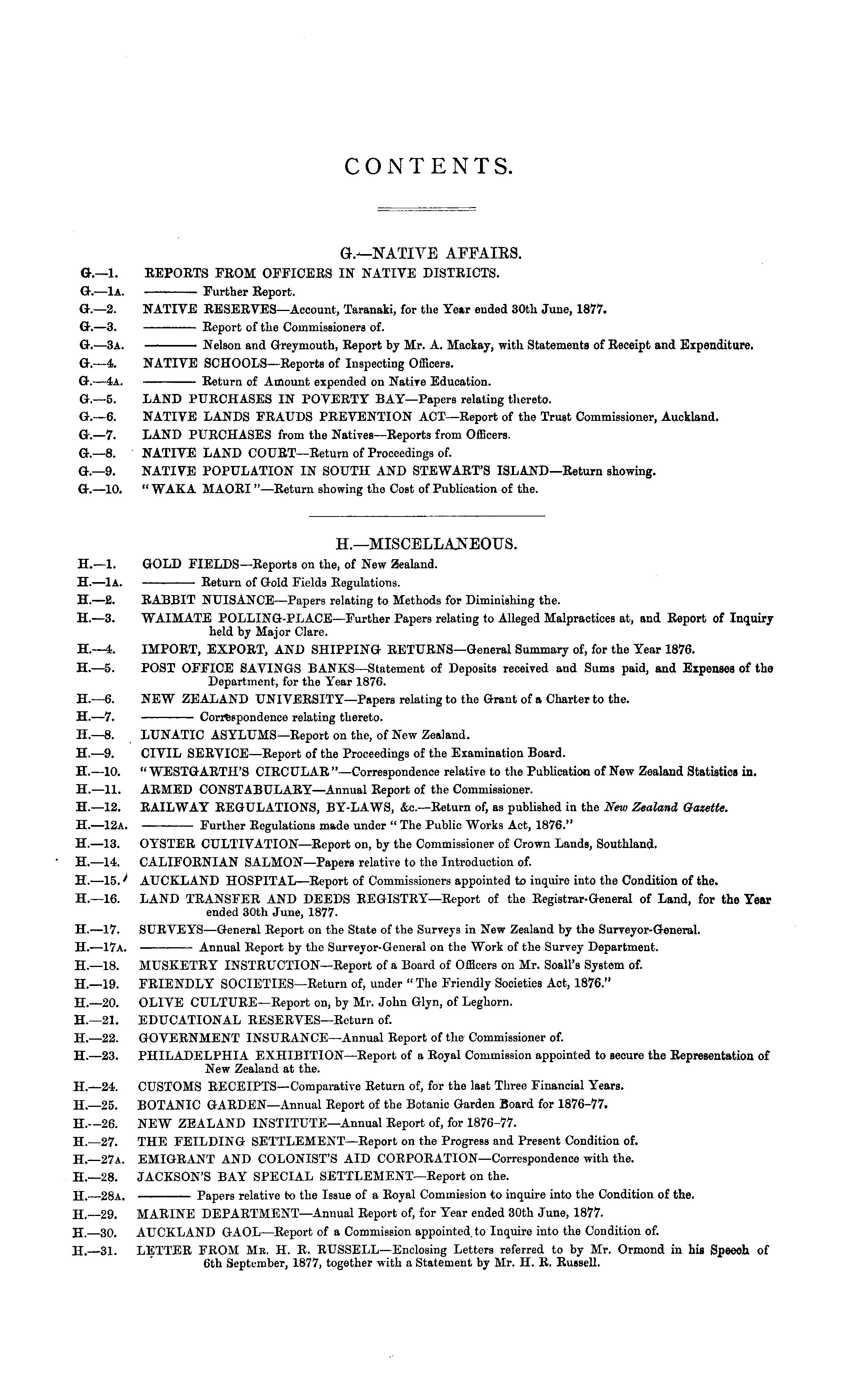 H.—MISCELLANEOUS. H.—l. GOLD FlELDS—Reports on the, of New Zealand. H. —IA. Return of Gold Fields Regulations. H— 2. RABBIT NUISANCE—Papers relating to Methods for Diminishing the. H— 3. WAIMATE POLLING-PLACE—Further Papers relating to Alleged Malpractices at, and Report of Inquiry held by Major Clare. H.^. IMPORT, EXPORT, AND SHIPPING RETURNS—GeneraI Summary of, for the Year 1876. H.—s. POST OFFICE SAVINGS BANKS—Statement of Deposits received and Sums paid, and Expenses of the Department, for the Year 1876. H.—6. NEW ZEALAND UNIVERSITY—Papers relating to the Grant of a Charter to the. H. —7. Correspondence relating thereto. H.—B. LUNATIC ASYLUMS—Report on the, of New Zealand. H —9. CIVIL SERVICE—Report of the Proceedings of the Examination Board. H.—lo. " WESTGARTH'S CIRCULAR "—Correspondence relative to the Publication of New Zealand Statistics in. H.—ll. ARMED CONSTABULARY—AnnuaI Report of the Commissioner. H.—l2. RAILWAY REGULATIONS, BY-LAWS, &c.—Return of, as published in the New Zealand Gazette. H.—l2a. Further Regulations made under " The Public Works Act, 1876." H—l3. OYSTER CULTIVATION—Report on, by the Commissioner of Crown Lands, Southland. H.—l4. CALIFORNIAN SALMON—Papers relative to the Introduction of. H.—ls.' AUCKLAND HOSPITAL —Report of Commissioners appointed to inquire into the Condition of the. H.—l6. LAND TRANSFER AND DEEDS REGISTRY—Report of the Registrar-General of Land, for the Year ended 30th June, 1877. H. —17. SURVEYS —General Report on the State of the Surveys in New Zealand by the Surveyor-General. H. —17a. Annual Report by the Surveyor-General on the Work of the Survey Department. H.—lB. MUSKETRY INSTRUCTION—Report of a Board of Officers on Mr. Soall's System of. H—l9. FRIENDLY SOCIETIES—Return of, under "The Friendly Societies Act, 1876." H.—2o. OLIVE CULTURE—Report on, by Mr. John Glyn, of Leghorn. H.—2l. EDUCATIONAL RESERVES—Return of. H.—22. GOVERNMENT INSURANCE—AnnuaI Report of the Commissioner of. H.—23. PHILADELPHIA EXHIBITION —Report of a Royal Commission appointed to secure the Representation of New Zealand at the. H— 24. CUSTOMS RECElPTS—Comparative Return of, for the last Three Financial Years. H.—25. BOTANIC GARDEN—AnnuaI Report of the Botanic Garden Board for 1876-77. H.—26. NEW ZEALAND INSTITUTE—AnnuaI Report of, for 1876-77. H.—27. THE FEILDING SETTLEMENT—Report on the Progress and Present Condition of. H— 27a. EMIGRANT AND COLONIST'S AID CORPORATlON—Correspondence with the. H— 28. JACKSON'S BAY SPECIAL SETTLEMENT—Report on the. H. —28a. Papers relative to the Issue of a Royal Commission to inquire into the Condition of the. H.—29. MARINE DEPARTMENT—AnnuaI Report of, for Year ended 30th June, 1877. jj.—30. AUCKLAND GAOL —Report of a Commission appointed, to Inquire into the Condition of. H.—3l. LETTER FROM Me. H. R. RUSSELL—Enclosing Letters referred to by Mr. Ormond in his Speeoh of 6th September, 1877, together with a Statement by Mr. H. R. Russell.