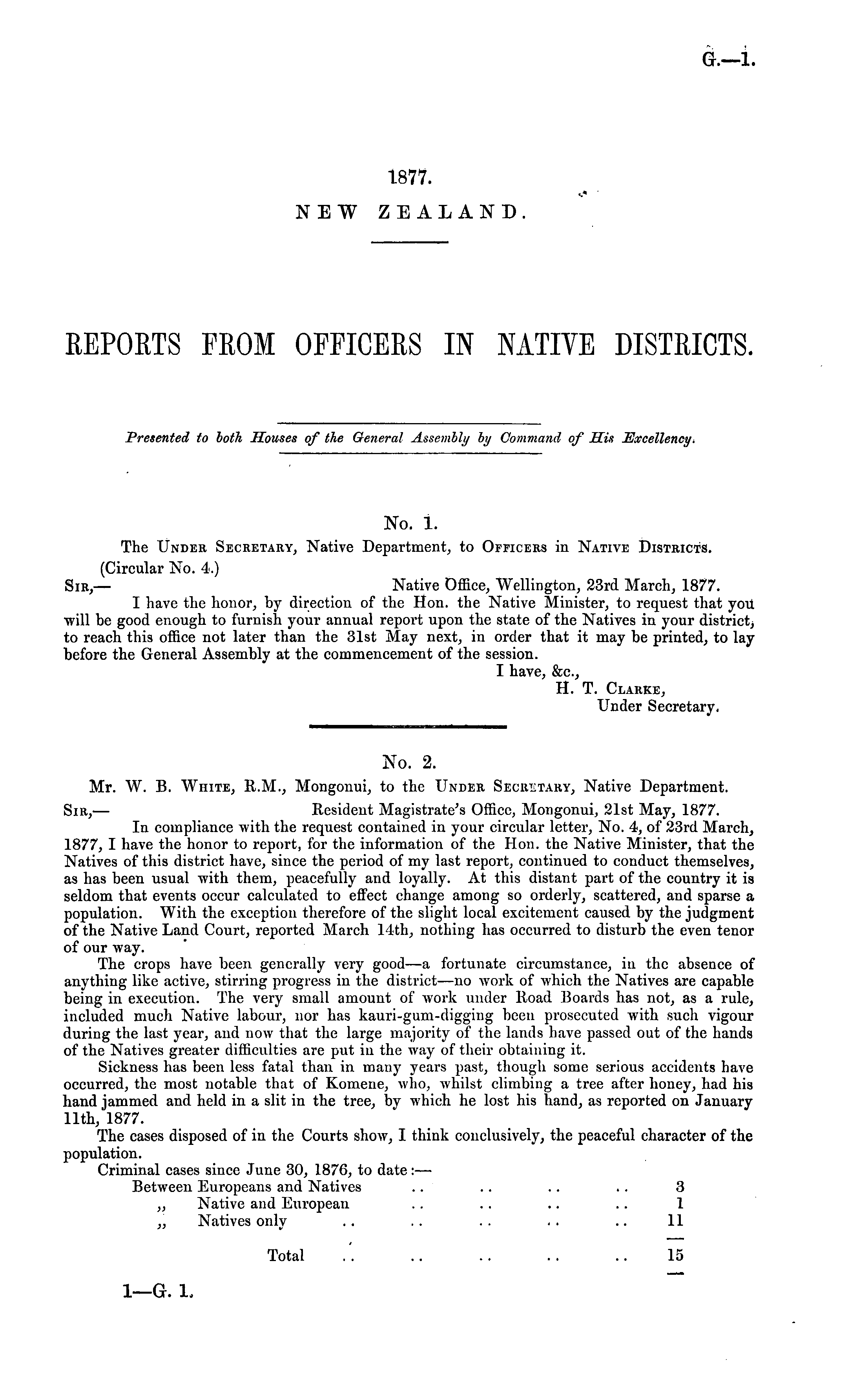 No. 1. The Under Secretary, Native Department, to Officers in Native Districts. (Circular No. 4.) Sir,— Native Office, Wellington, 23rd March, 1877. I have the honor, by direction of the Hon. the Native Minister, to request that you will be good enough to furnish your annual report upon the state of the Natives in your district, to reach this office not later than the 31st May next, in order that it may be printed, to lay before the General Assembly at the commencement of the session. I have, &c, H. T. Clarke, Under Secretary.